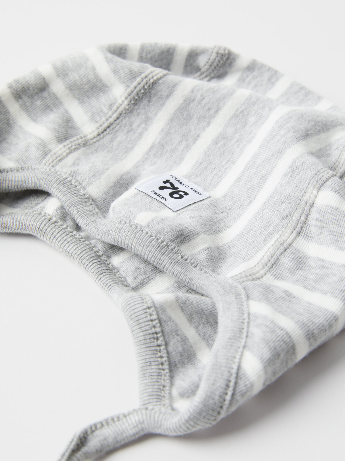 En randig hjälmmössa i 100% ekologisk bomull för de allra minsta. Mössan har vår klassiska rand och knytband under hakan som håller mössan på plats.