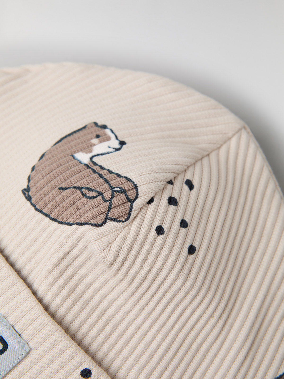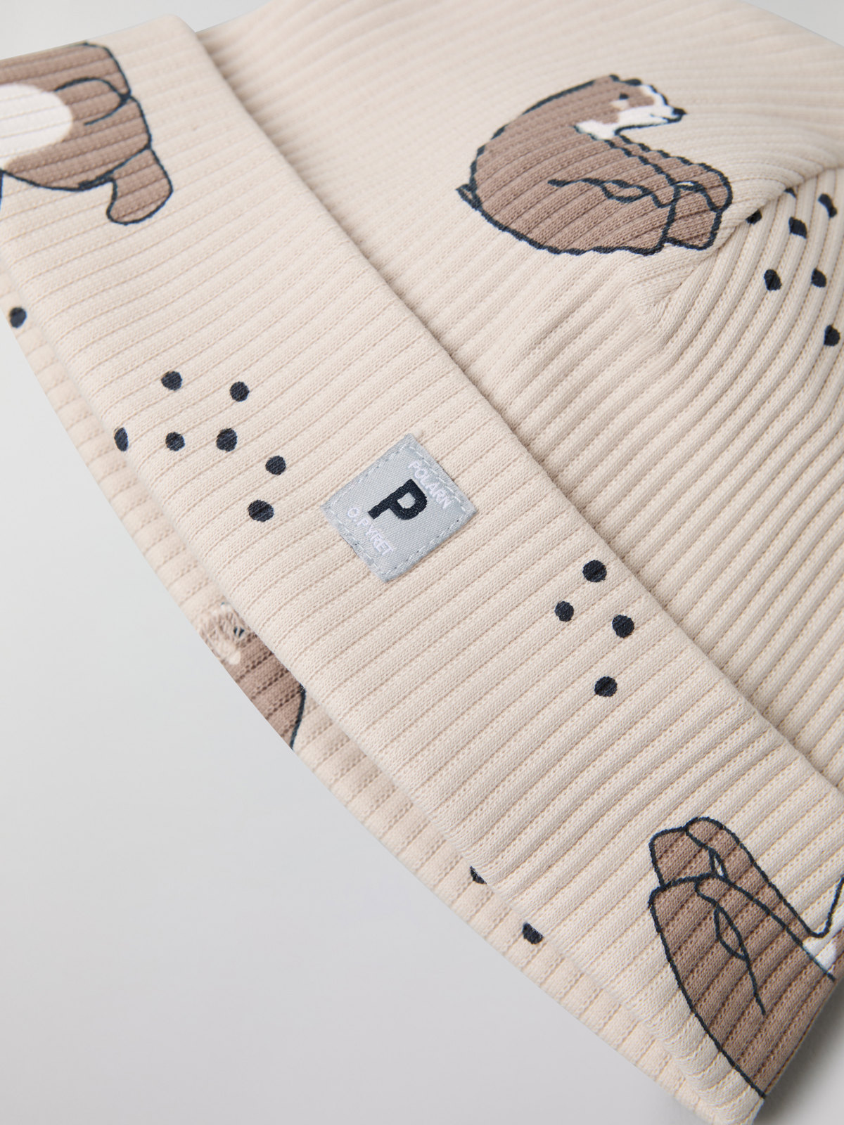 Ribbad mössa för baby i 100 % ekologisk bomullstrikå, helmönstrad med små björnar.