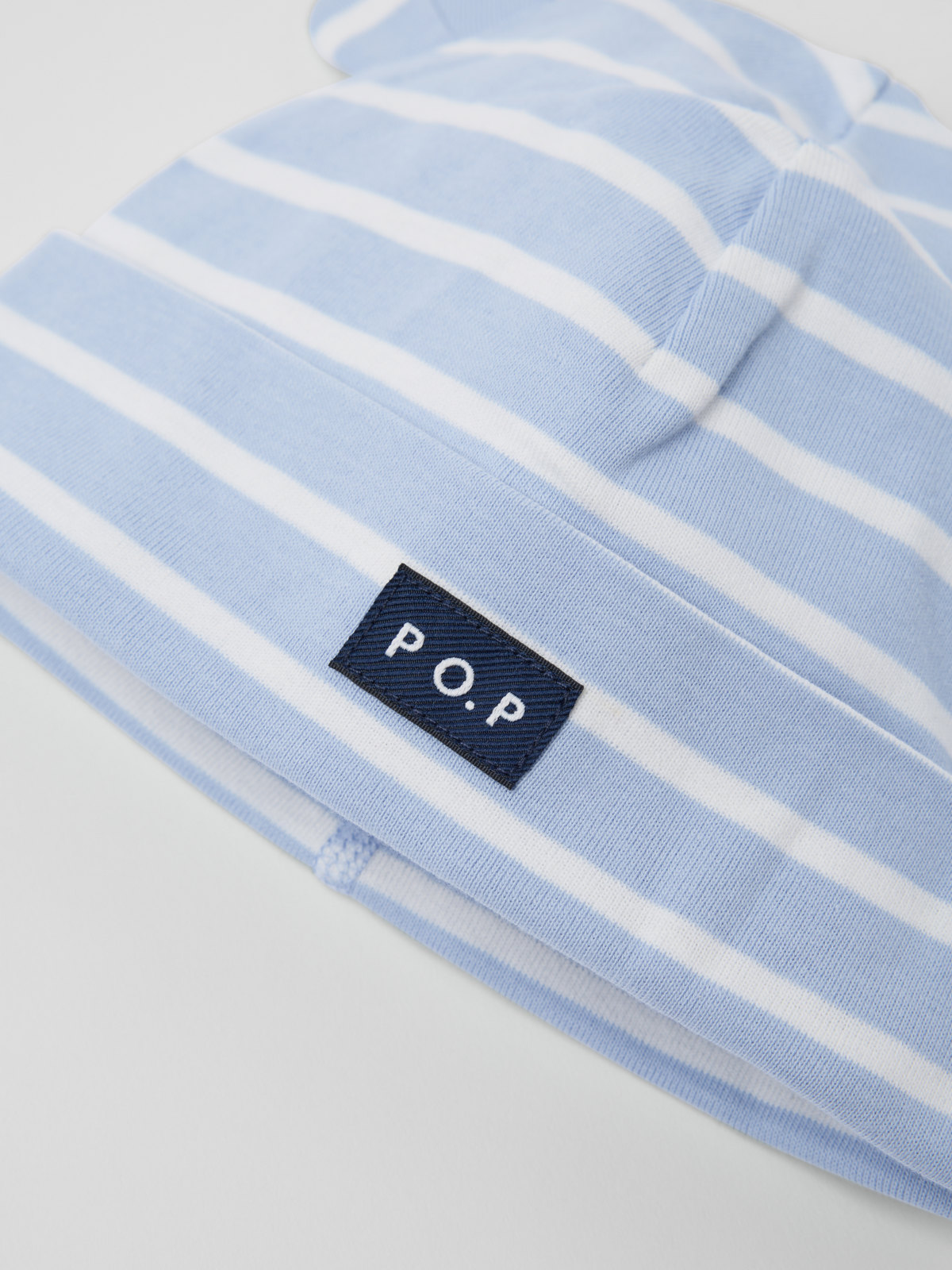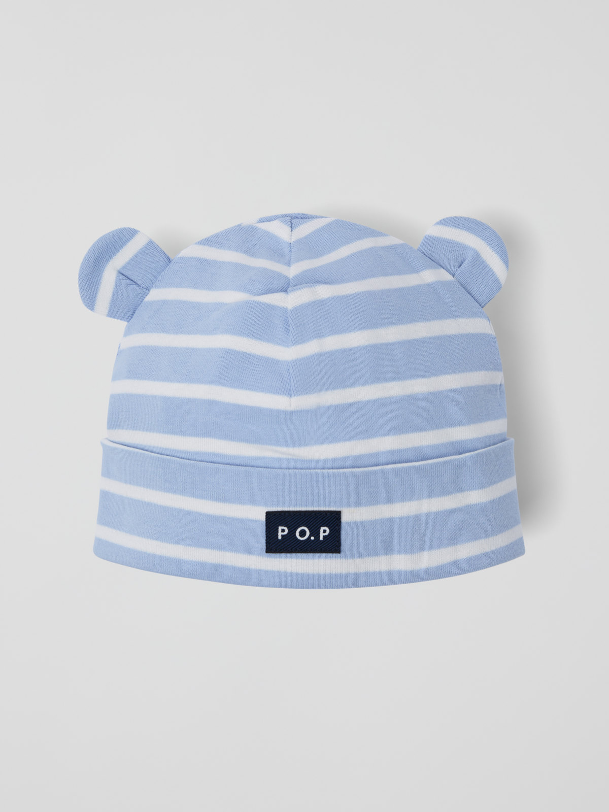 Randig mössa i 100 % ekologisk bomullstrikå för baby. Mössan är prydd med påsydda öron, och har ett uppvik som kan justeras efter bebisens huvudstorlek.