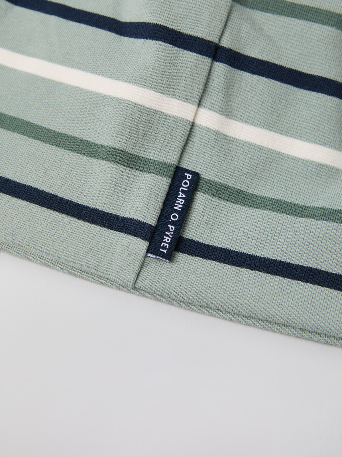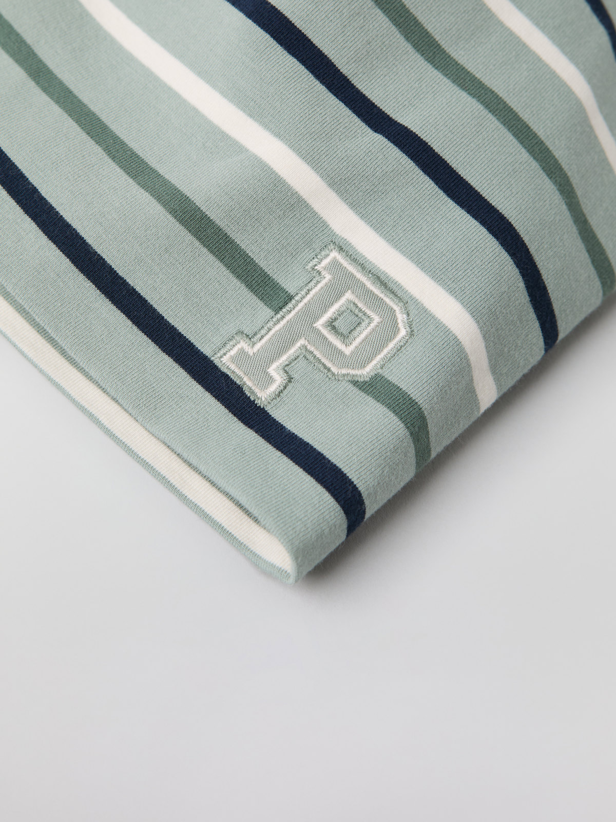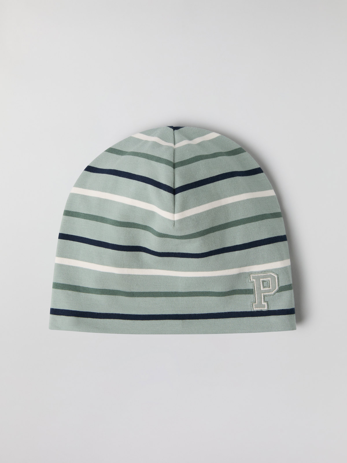 Tunn, multirandig trikåmössa i mjuk ekologisk bomull. Mössan har vår klassiska rand och är prydd med en P-applikation fram.