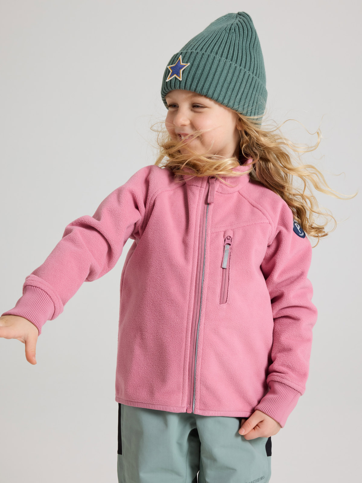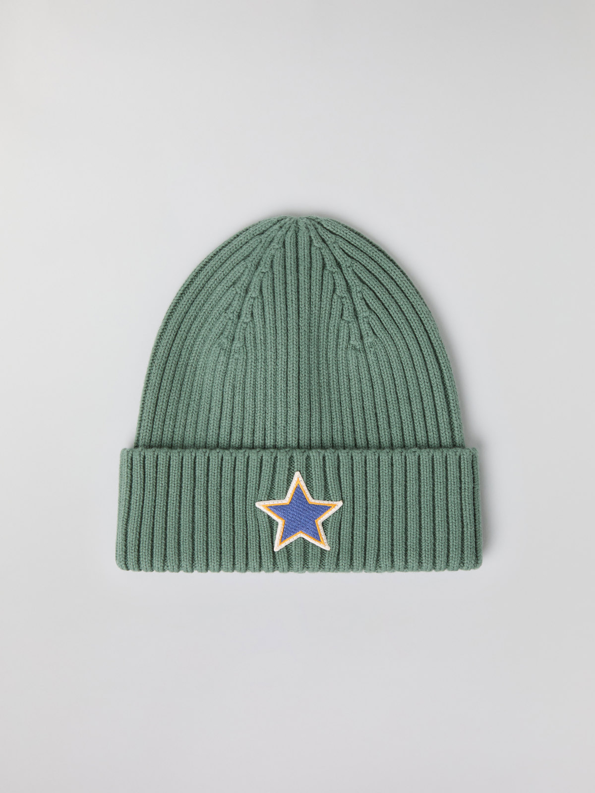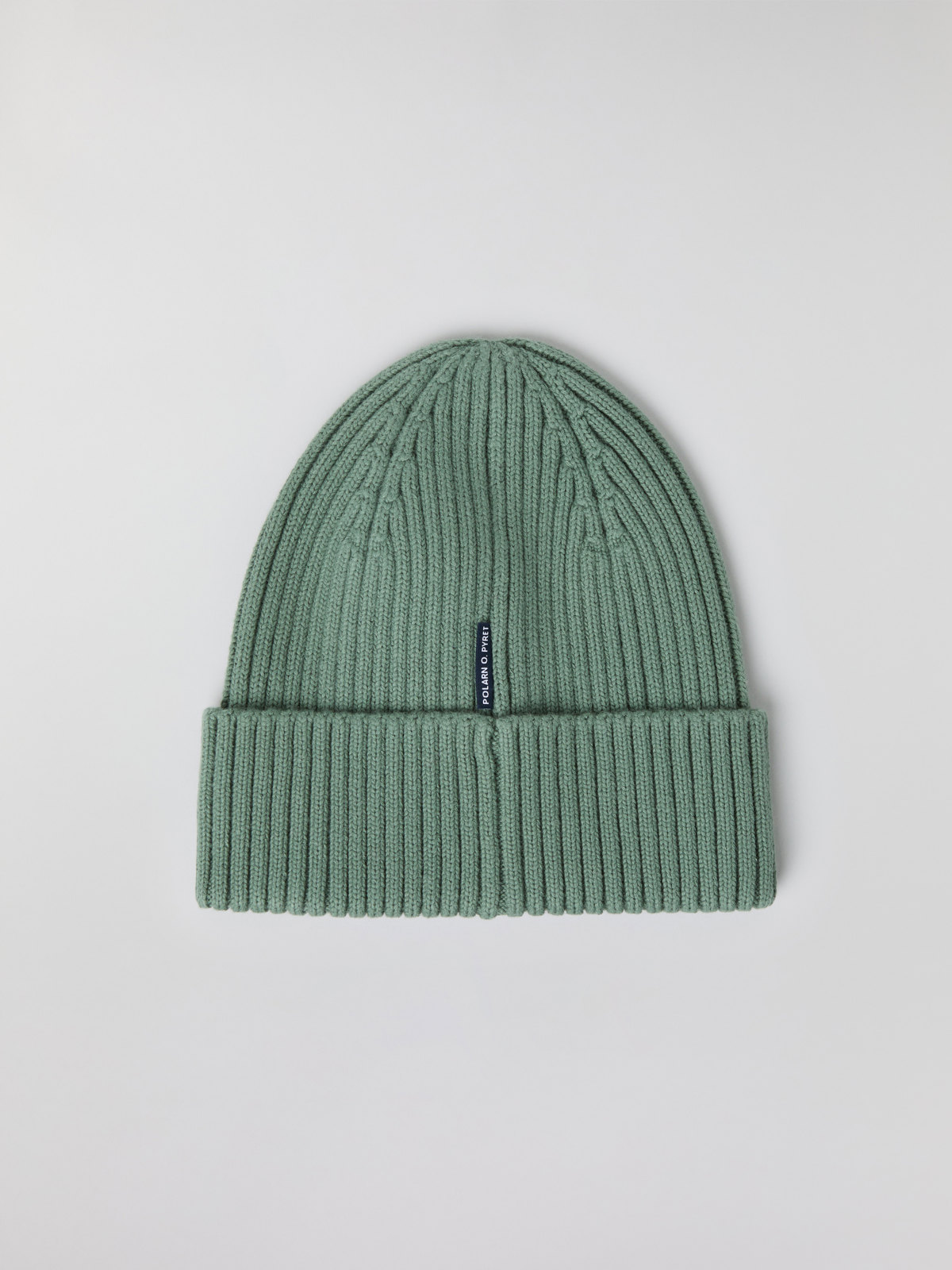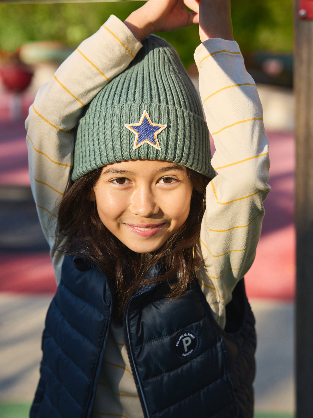 Ribbstickad mössa i ekologisk bomull – perfekt för småkyliga höst- och vårdagar. Mössan har ett uppvik i nederkant och en broderad applikation fram.