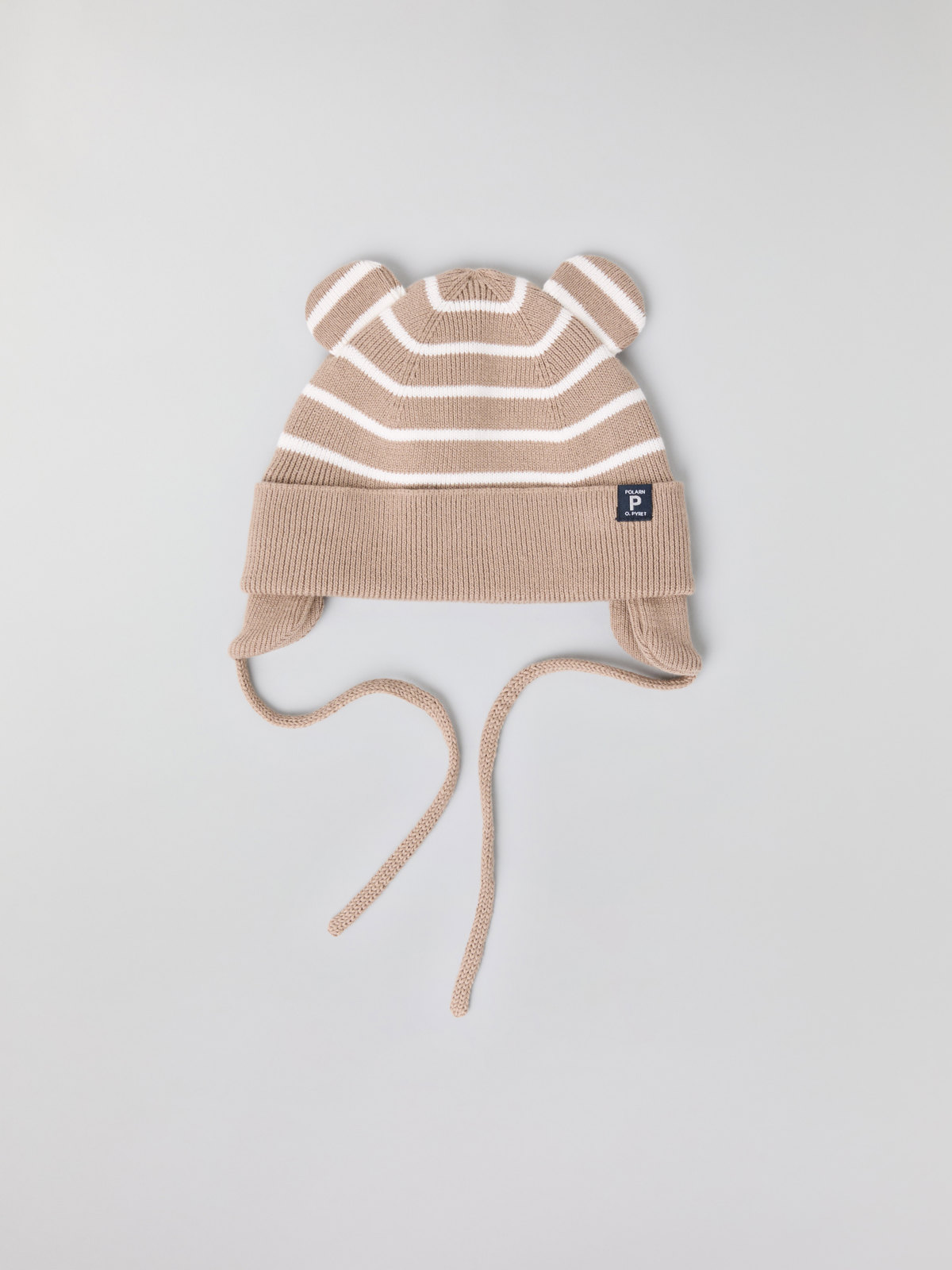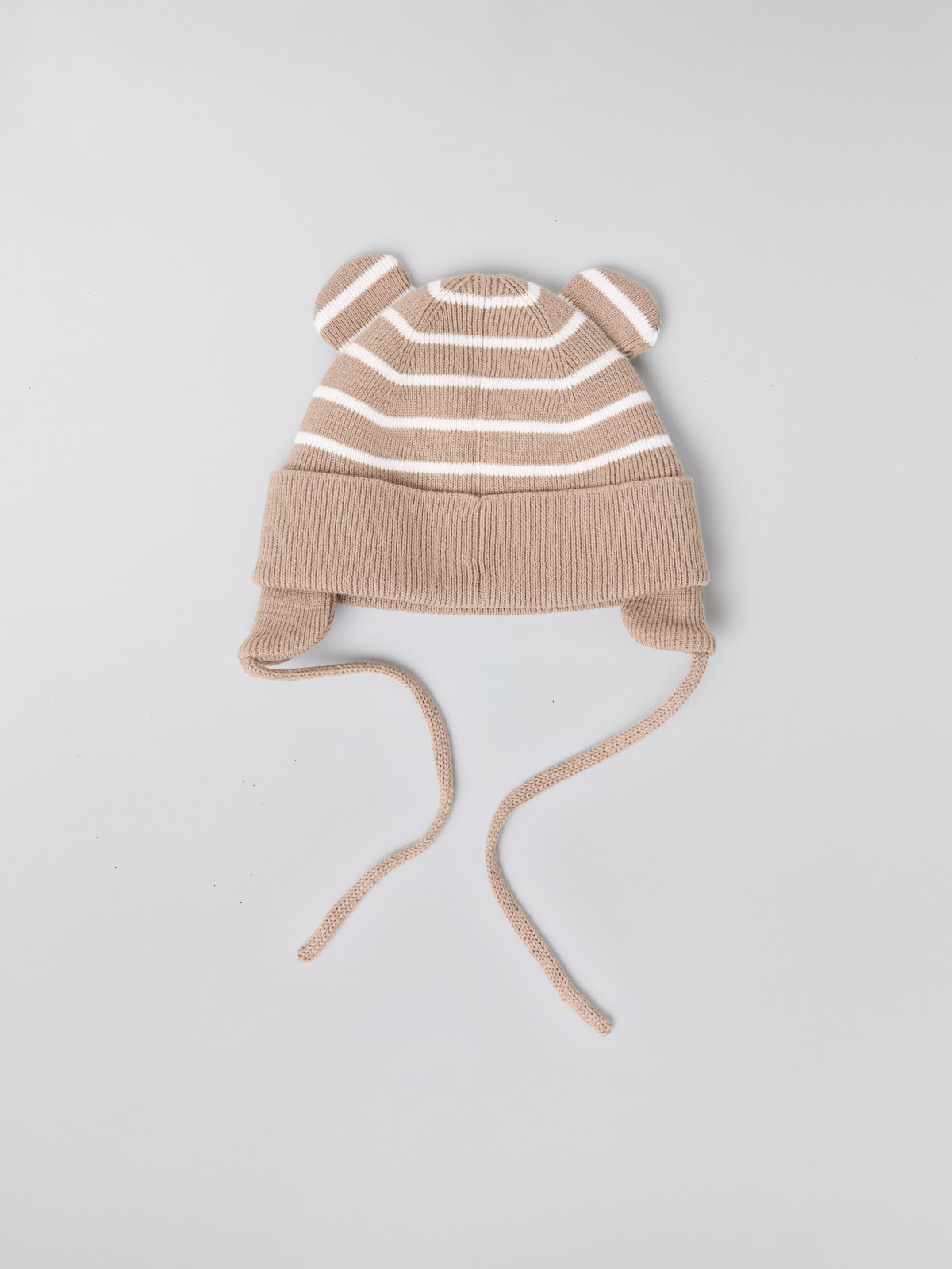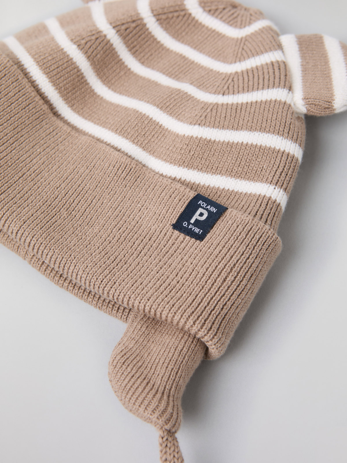 Mössan har vår klassiska rand och påsydda öron. I nederkant har den en ribbad mudd samt öronlappar som håller små öron varma.