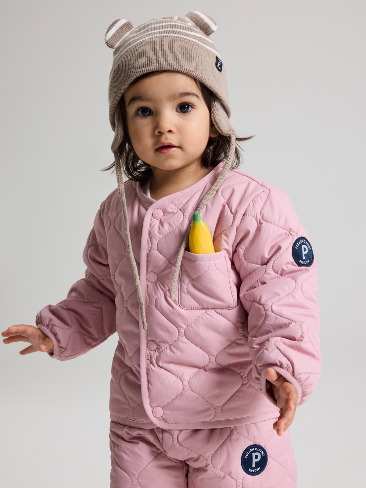 Stickad mössa i 100 % ekologisk bomull med mjukt trikåfoder – skön i både vagn och famn.
