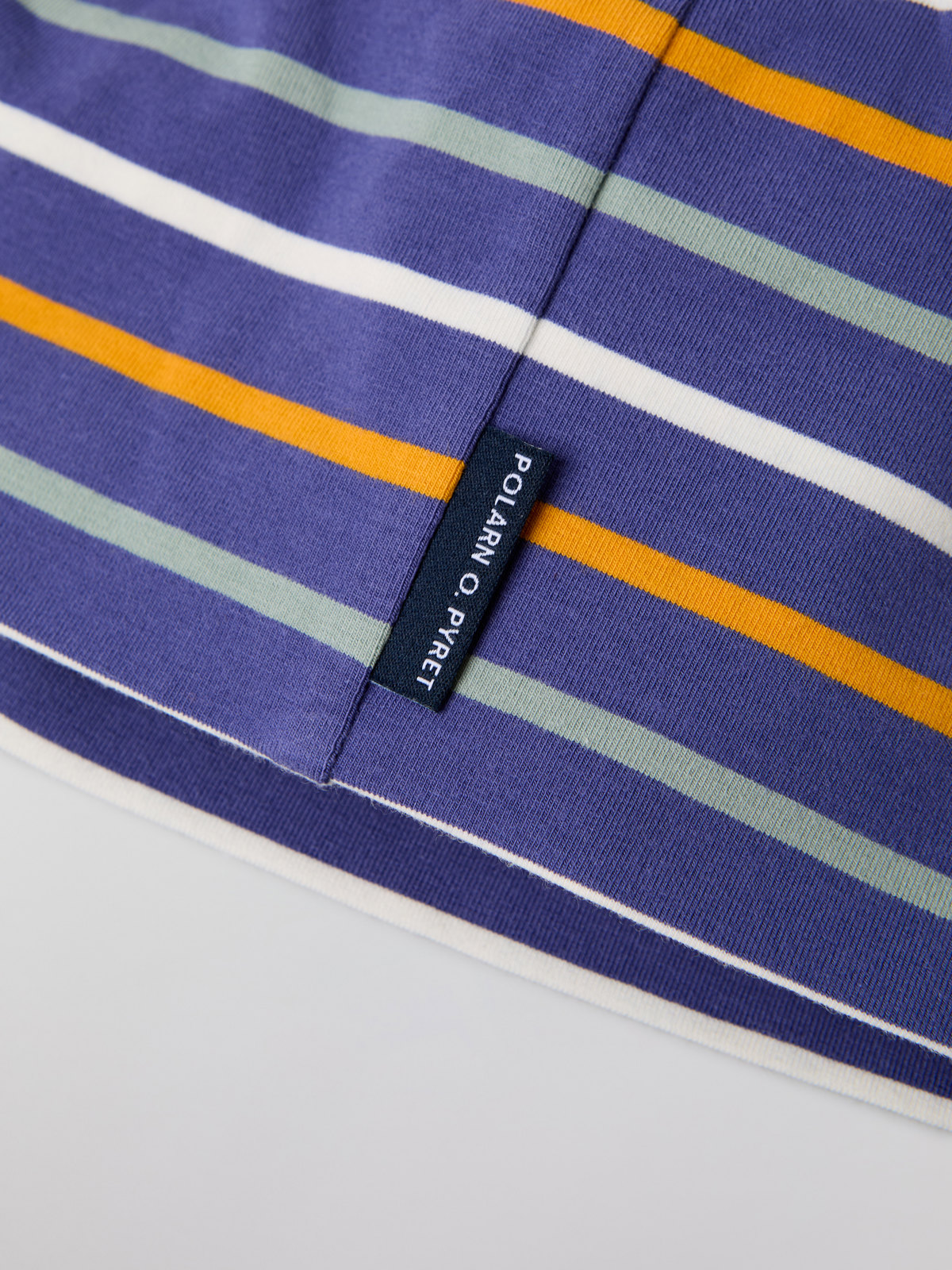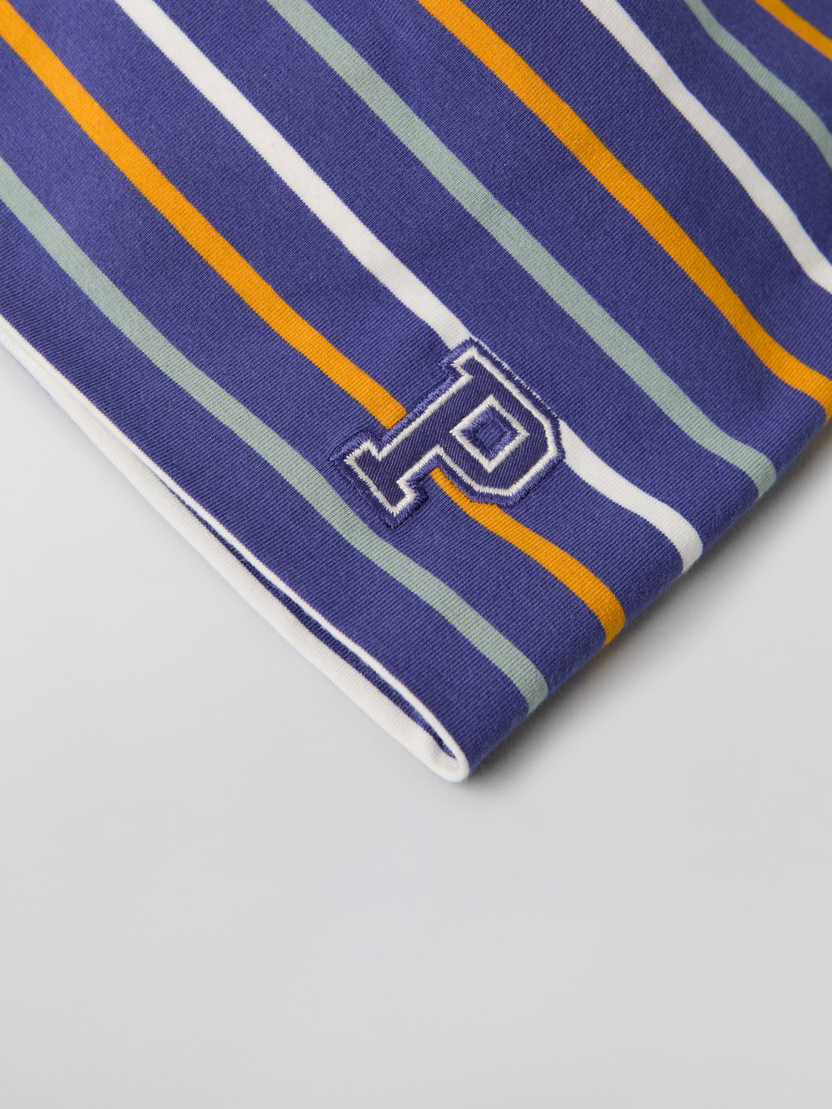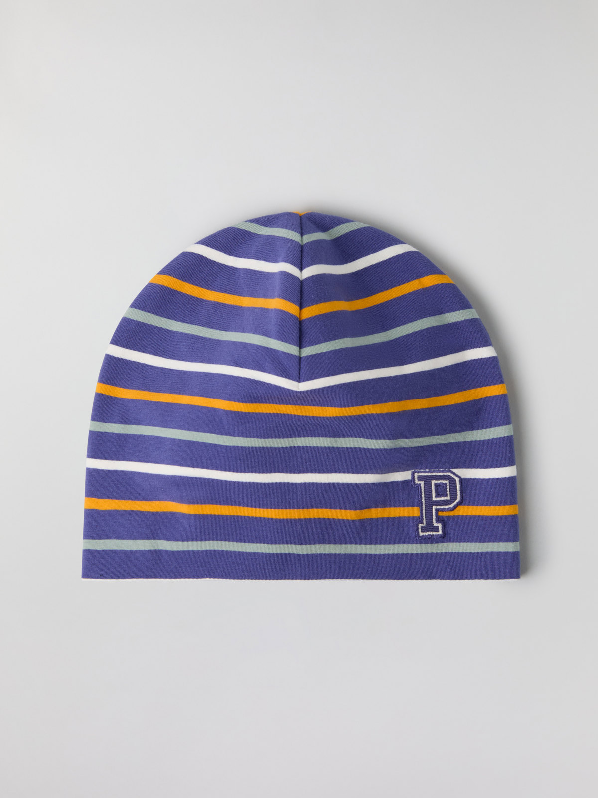 Tunn, multirandig trikåmössa i mjuk ekologisk bomull. Mössan har vår klassiska rand och är prydd med en P-applikation fram.