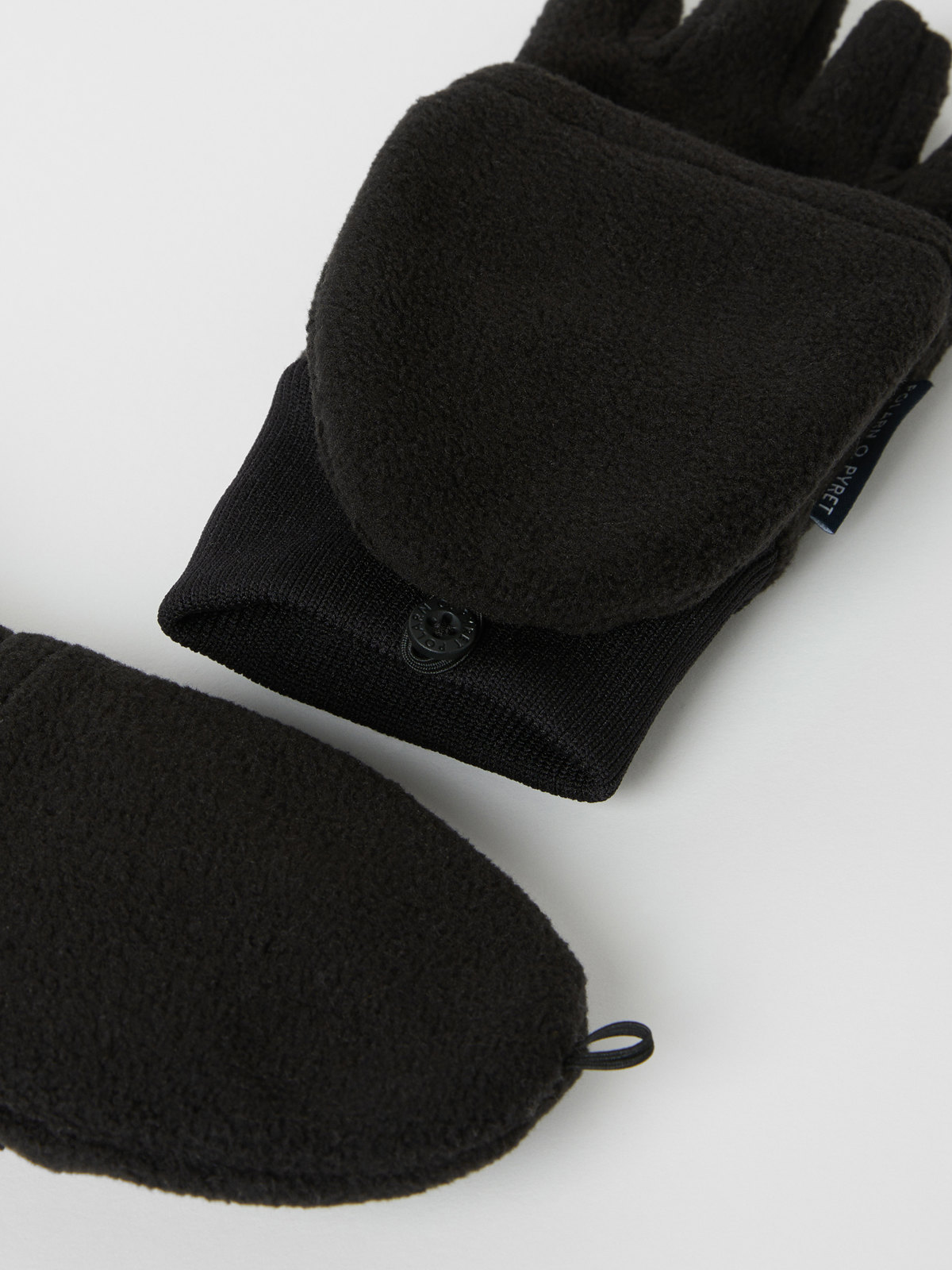 Fingerlängden slutar på mitten av fingrarna och för extra värme finns en övervikbar del att vika över fingrarna. Vanten blir då en tumvante. Mjuk, elastisk mudd runt handleden.