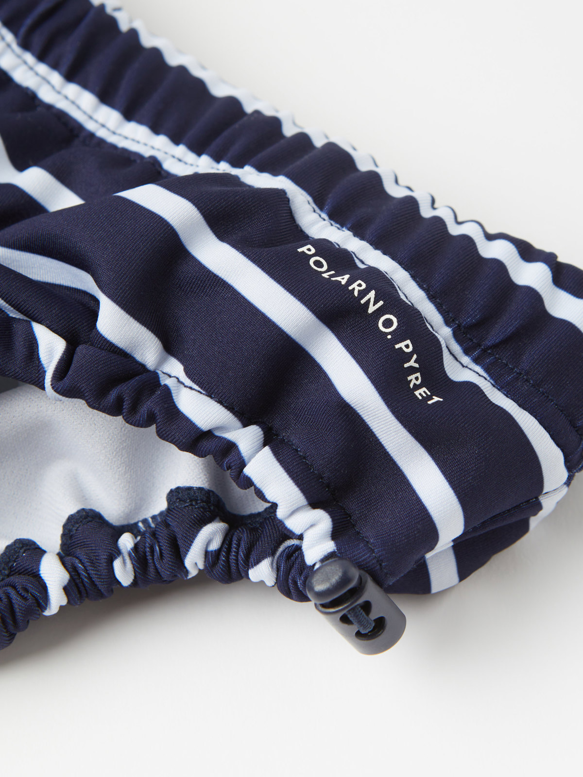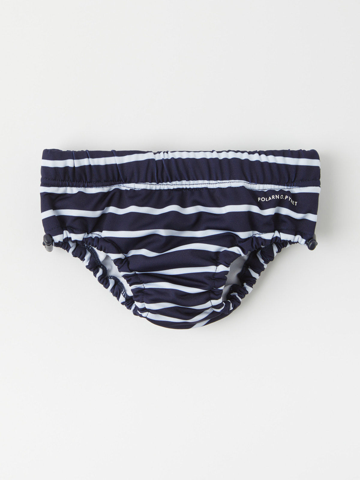 Randiga badbyxor i återvunnet material, som passar perfekt för babysim då det finns ett extra foder som fångar upp små olyckor. Runt benöppningarna finns justerbar resår. Midjan är elastisk och går att regleras på insidan med knytband.