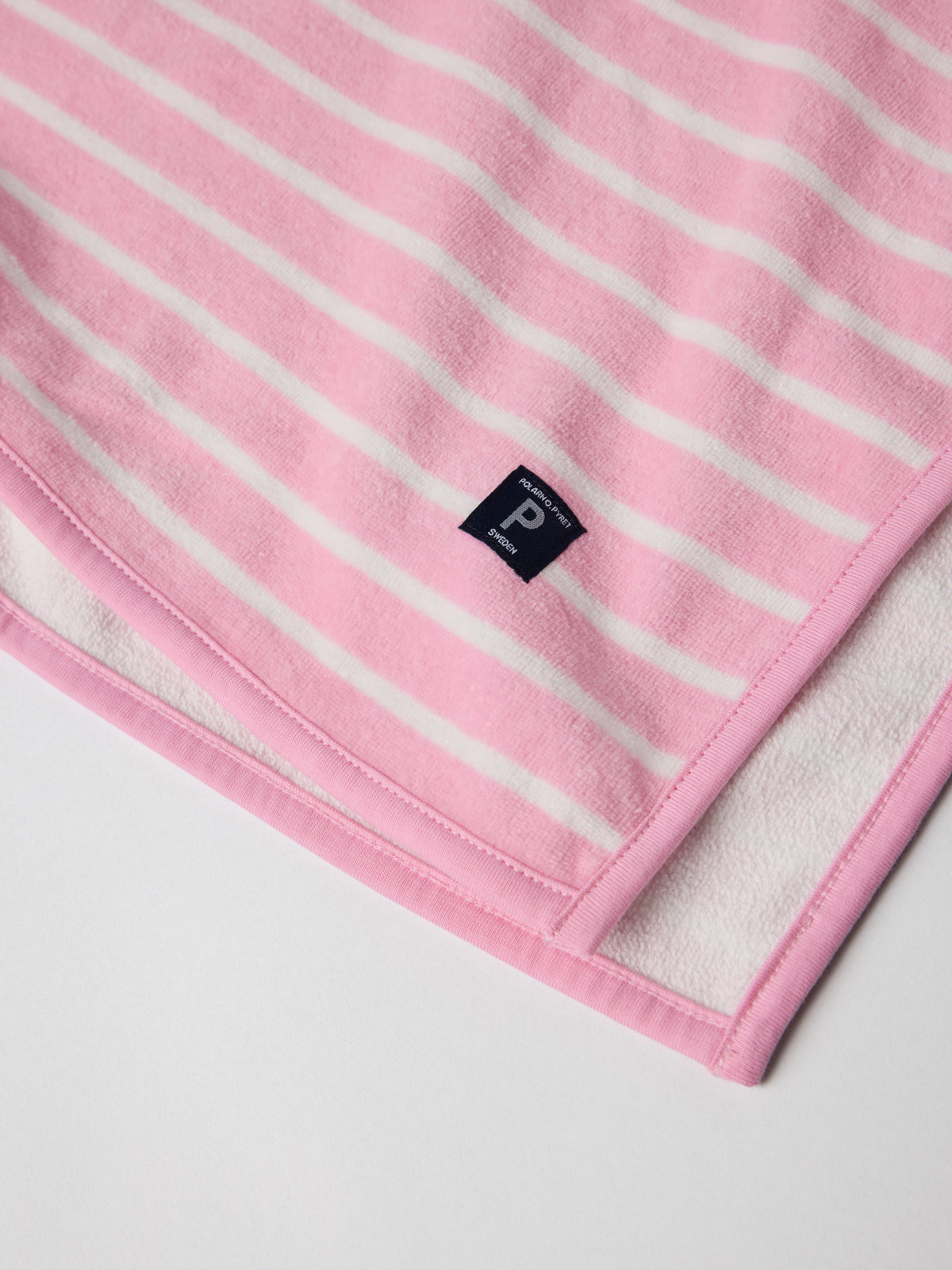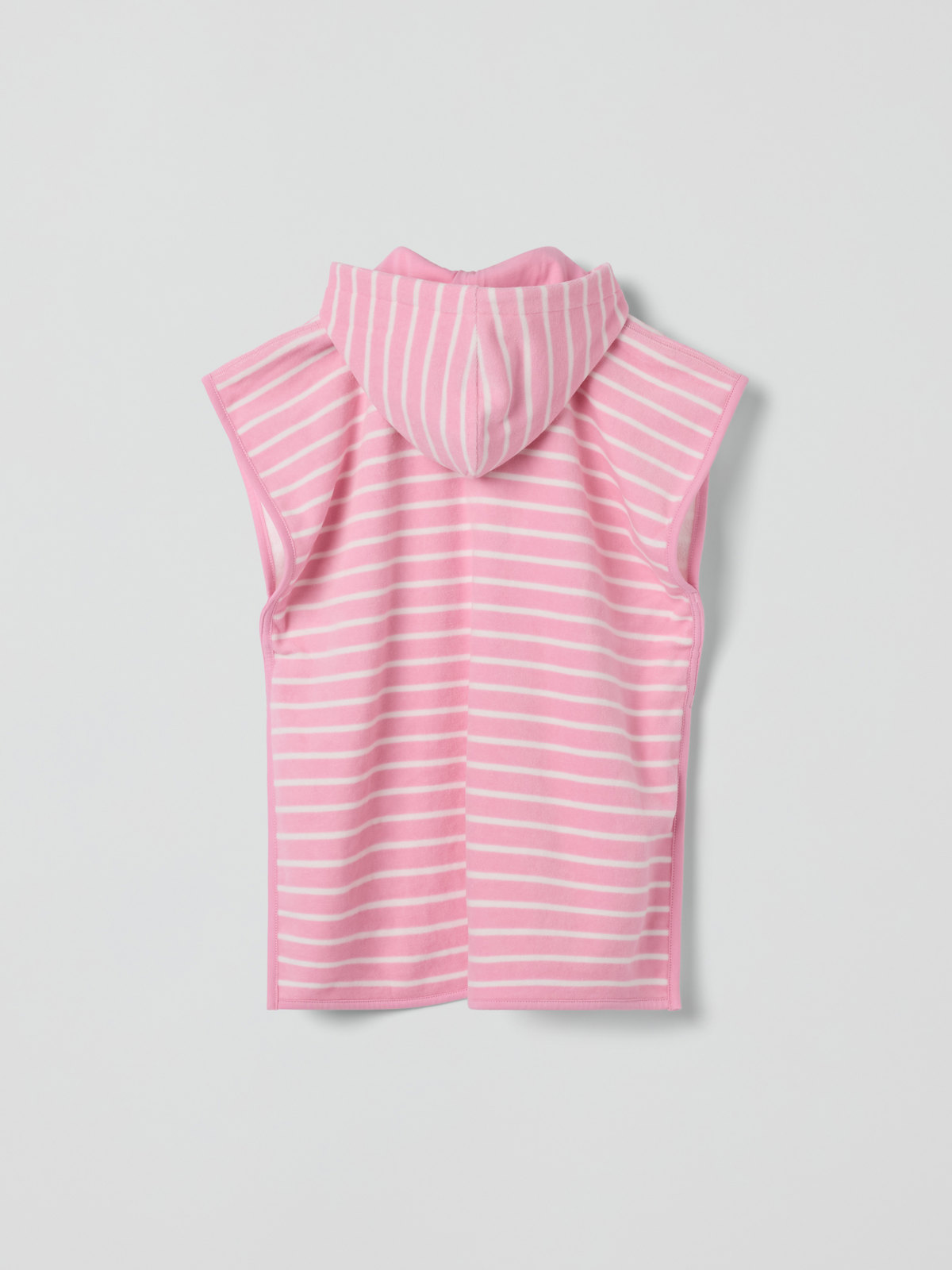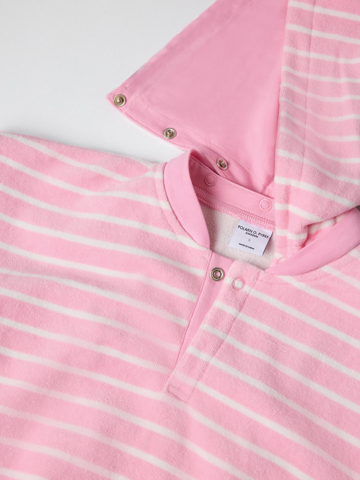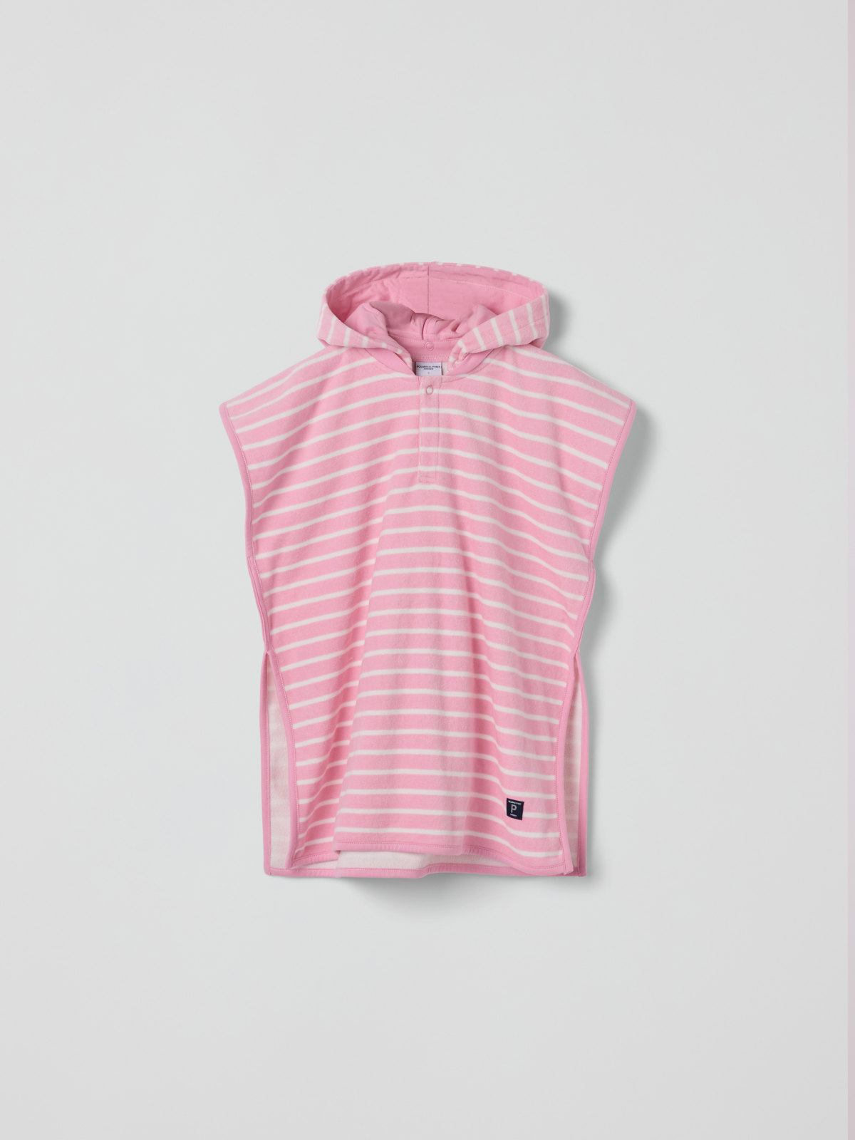 Randig badponcho i mjuk bomullsfrotté – perfekt att ha efter badet! Ponchon är tillverkad i ekologisk bomull och återvunnen polyester och stängs med en tryckknapp fram. Den avtagbara huvan har ett mjukt enfärgat bomullsfoder.