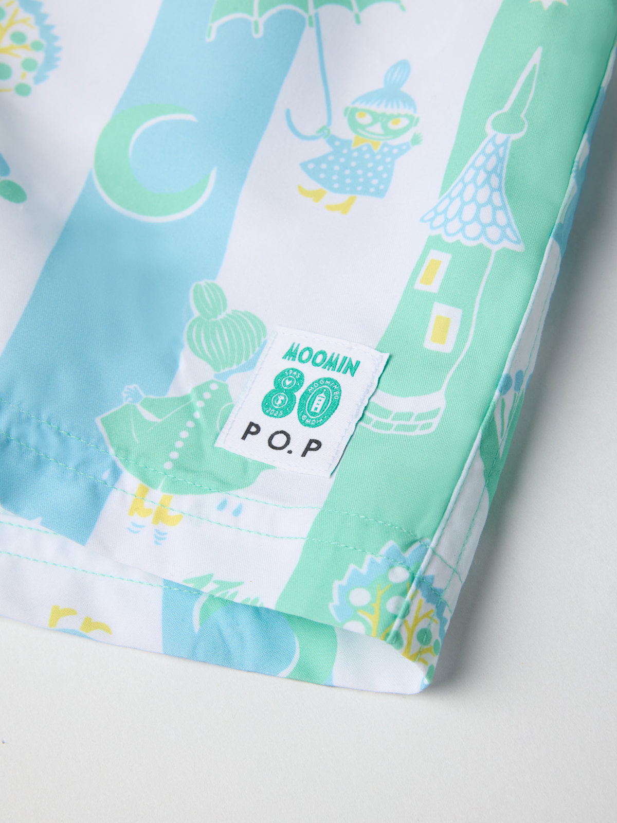 Badshorts i återvunnen polyester med elastisk midja och knytband. Plagget är en del av vår limiterade kollektion för att fira Mumins 80-årsjubileum. Exklusivt för jubileumsåret 2025 är att mumintrollen återigen får synas i färg – för första gången sedan 1956.