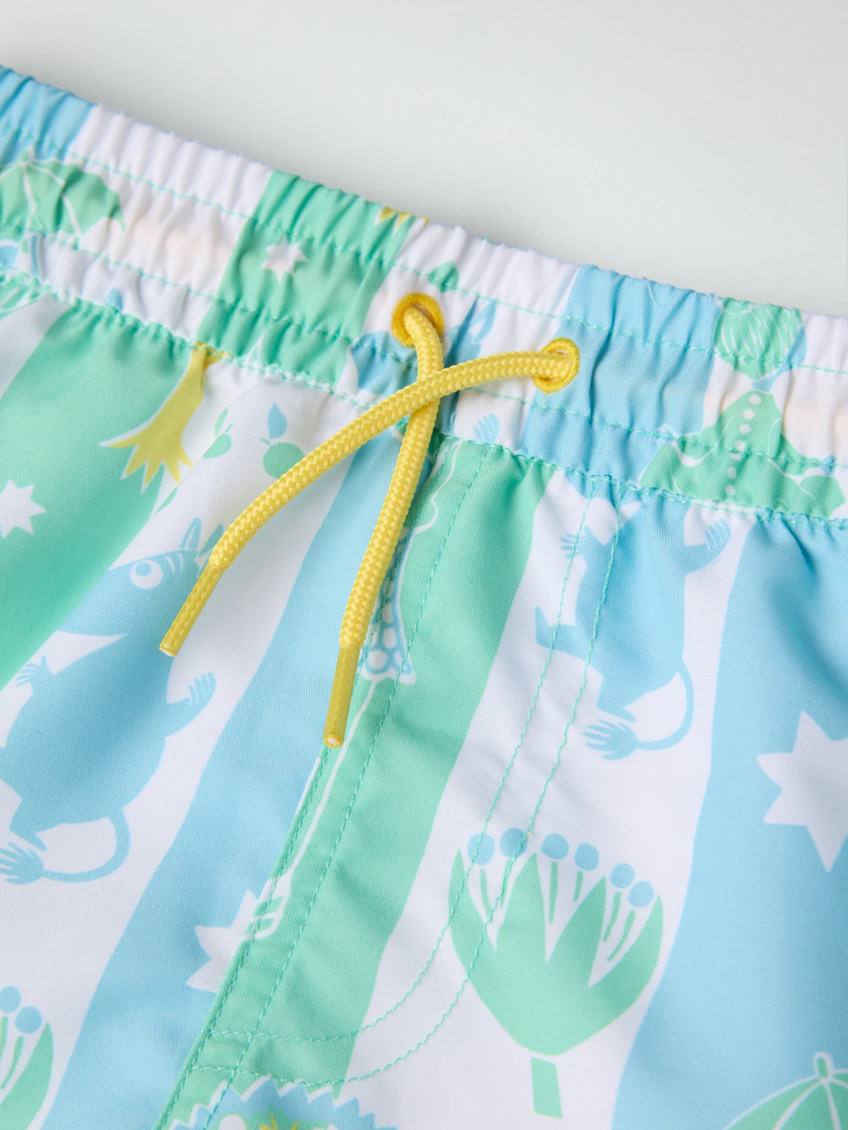 Badshortsen är helmönstrade med illustrationer från Tove Janssons berättelser om mumintrollen.