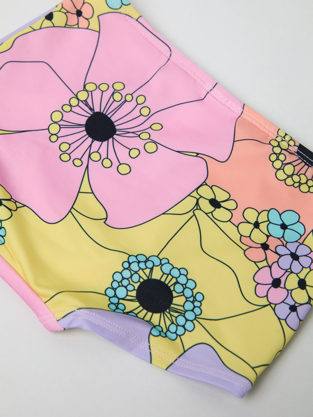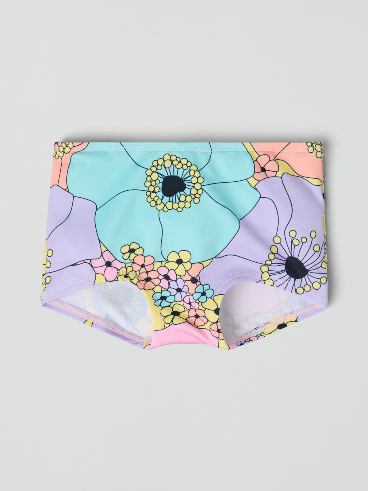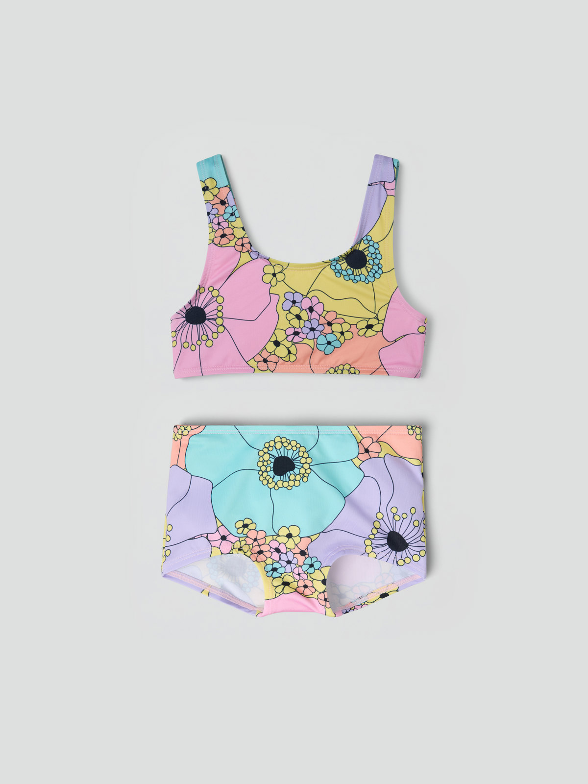 Bikini i mjukt och skönt material av återvunnen polyester, helmönstrad med små blommor. Underdelen har hög midja och hipstermodell. Överdelen har rak modell och breda axelband.