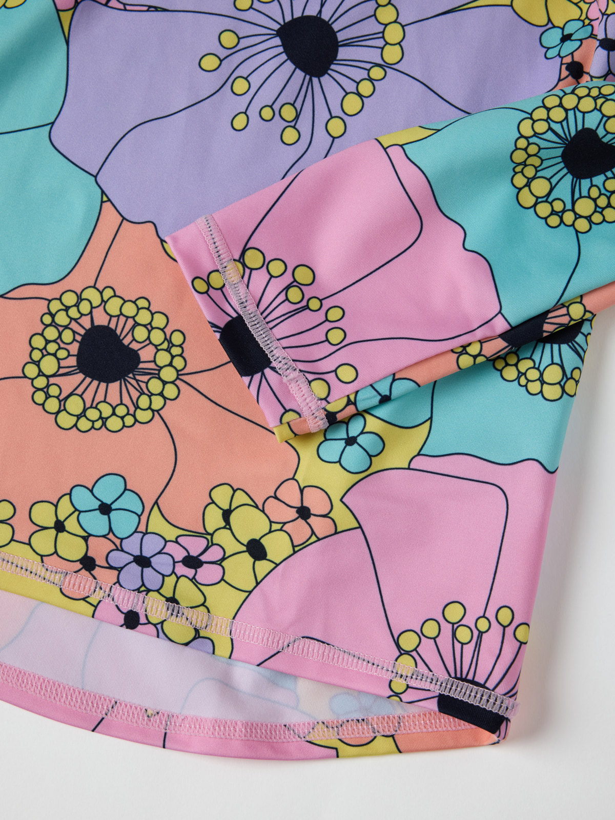 Långärmad UV-tröja med UPF 50, tillverkad i mjukt och skönt material av återvunnen polyester. Tröjan är helmönstrad med blommor sydd med extra mjuka sömmar som inte skaver. Matcha med tillhörande UV-byxa!