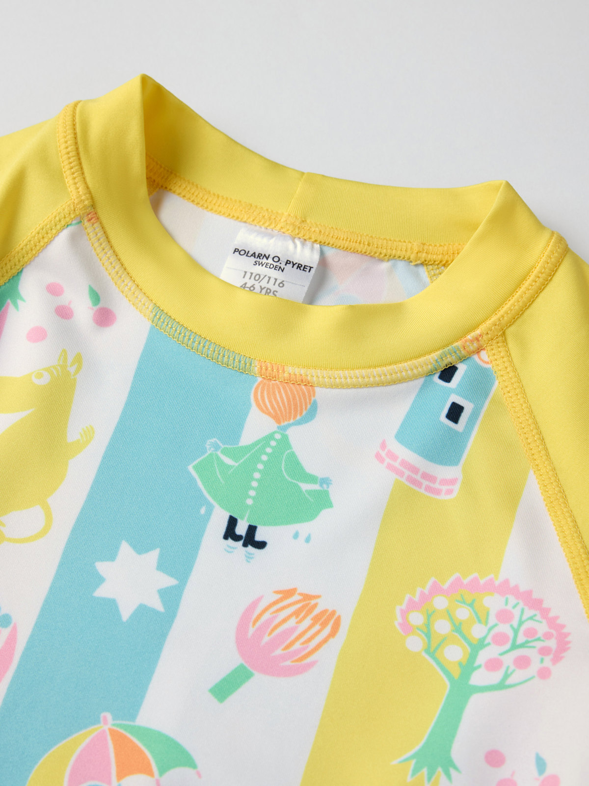 Tröjan är mönstrad med illustrationer från Tove Janssons berättelser om mumintrollen och sydd med extra mjuka sömmar som inte skaver. Matcha med tillhörande UV-byxa!