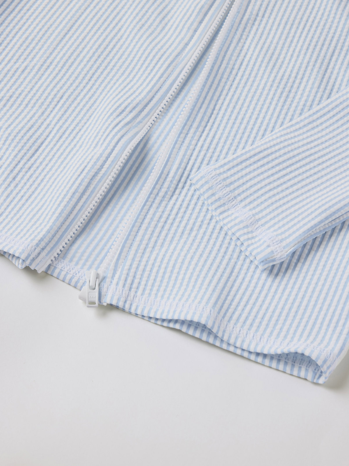 Randig långärmad UV-tröja med smart dragkedja fram och UV-skydd UPF 50, tillverad i mjukt och skönt material av återvunnen polyester. Tröjan är sydd med extra mjuka sömmar som inte skaver och har en liten applikation på bröstet.
