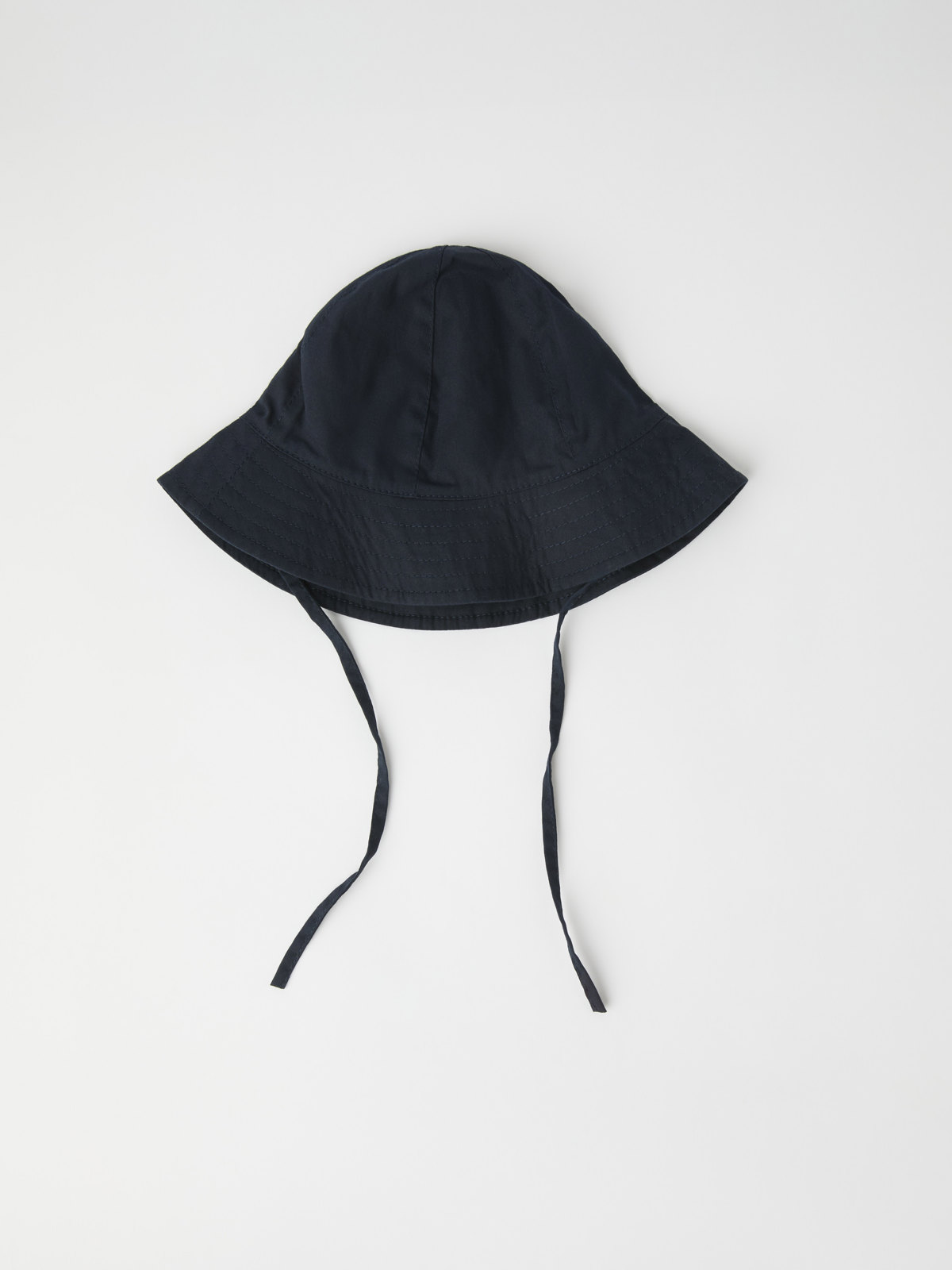 Enfärgad solhatt med knytband. Solhatten är tillverkad i 100% ekologisk bomull och har UV-skydd UPF 50. Knytbanden under hakan håller solhatten på plats.