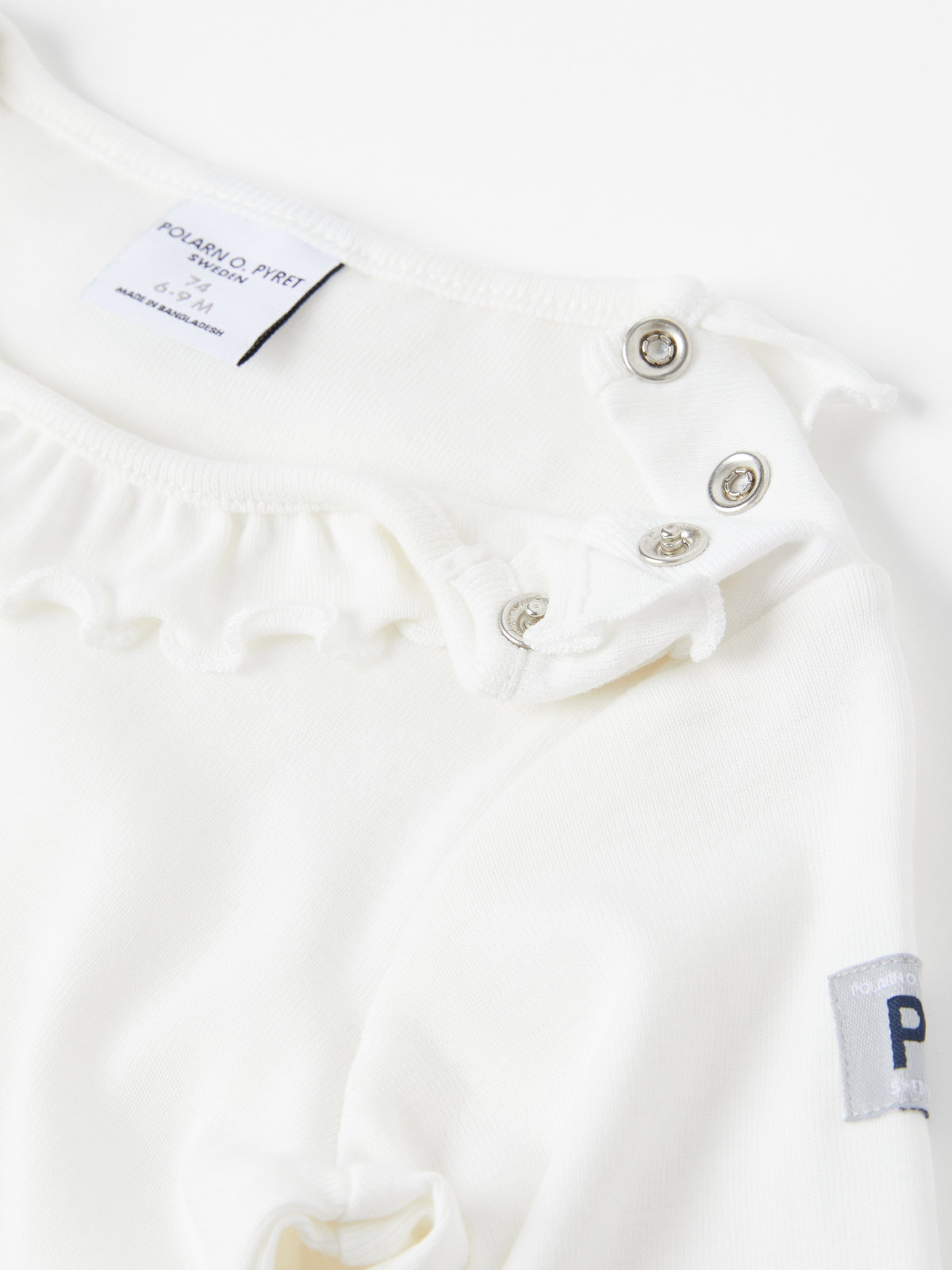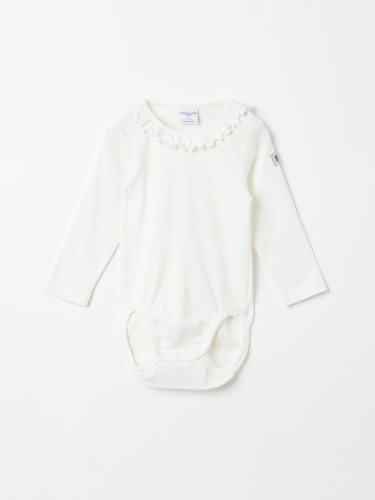 Vit body i 100% ekologisk bomull för baby. Bodyn är prydd med en fin volangkrage och har tryckknappar vid ena axeln och i grenen för enklare klädbyten.