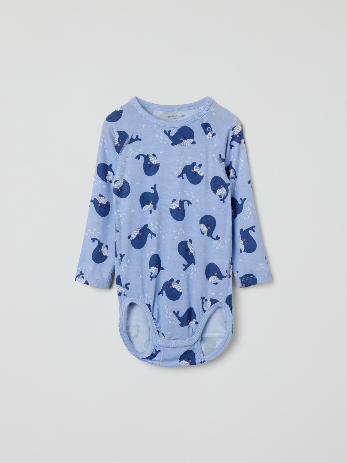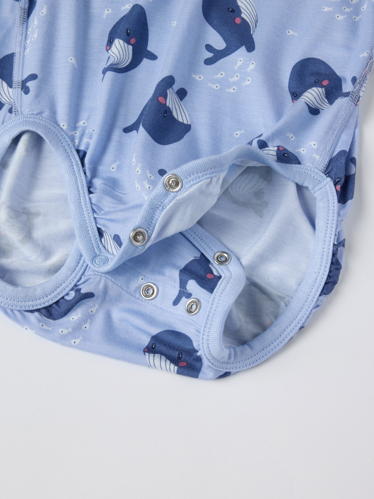 Body tillverkad i tunn och sval trikå av Ecovero™ Viscose – perfekt i sommarvärmen! Bodyn är sydd med extra mjuka sömmar och är skonsam mot känslig hud. Den är helmönstrad med valar och matchar fint med hela kollektionen. Tryckknapparna på ena axeln och i grenen underlättar klädbyten.