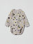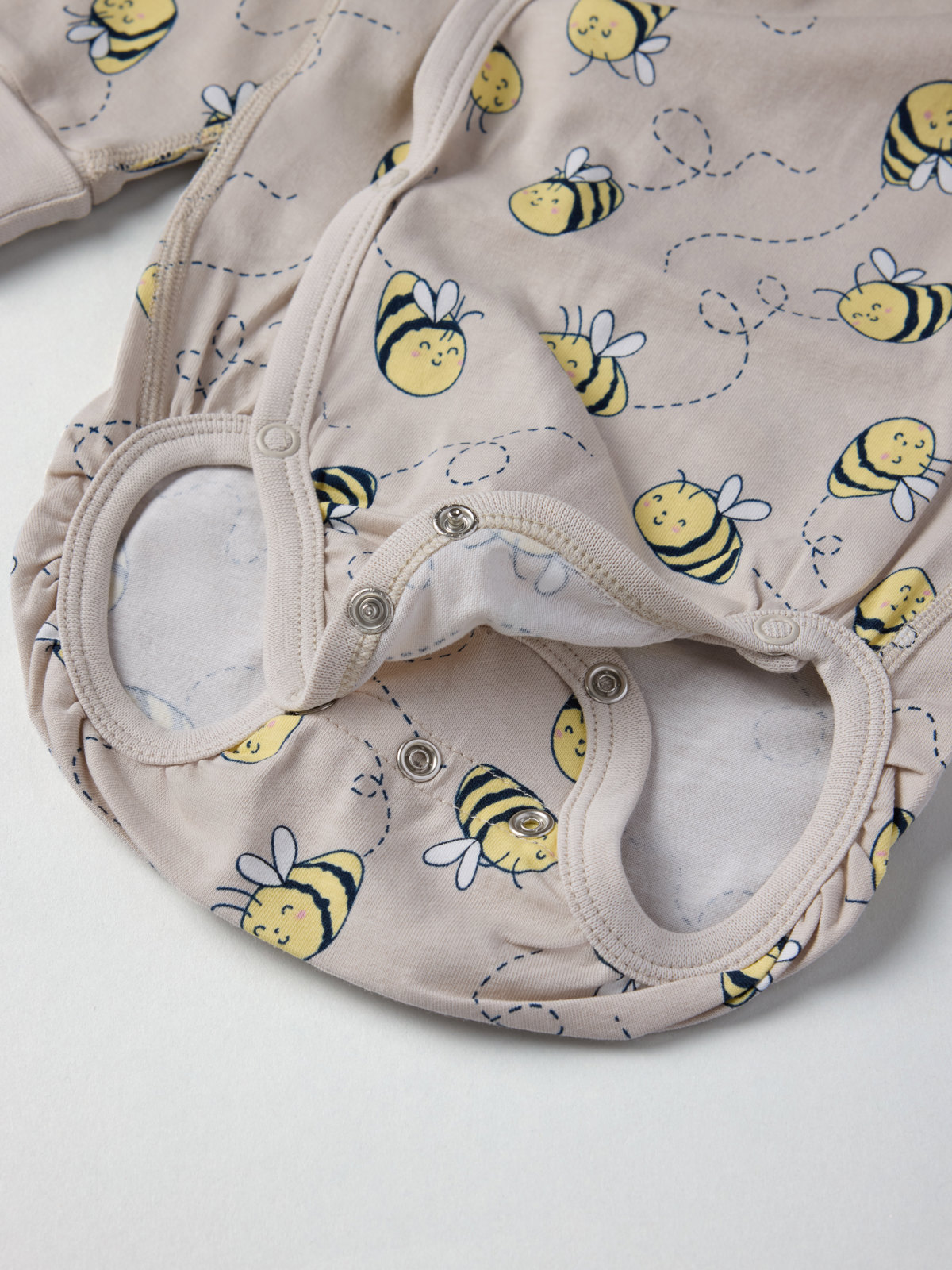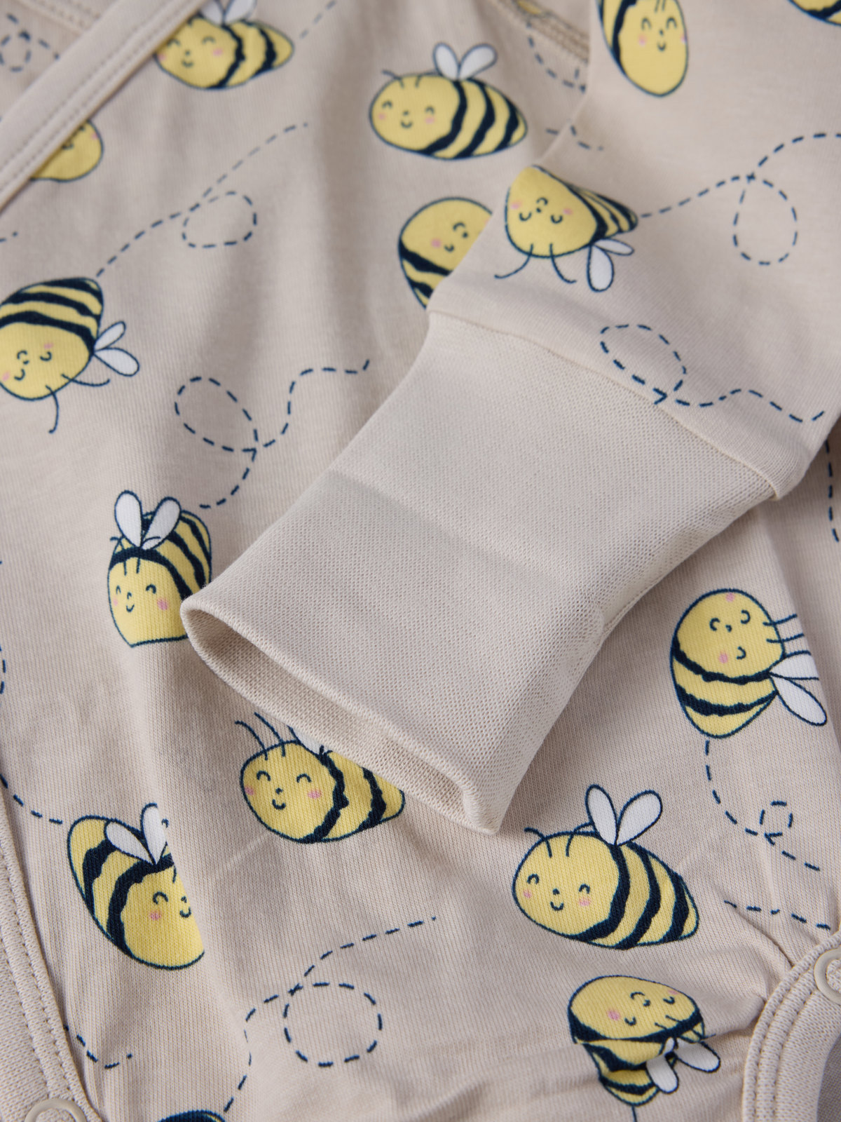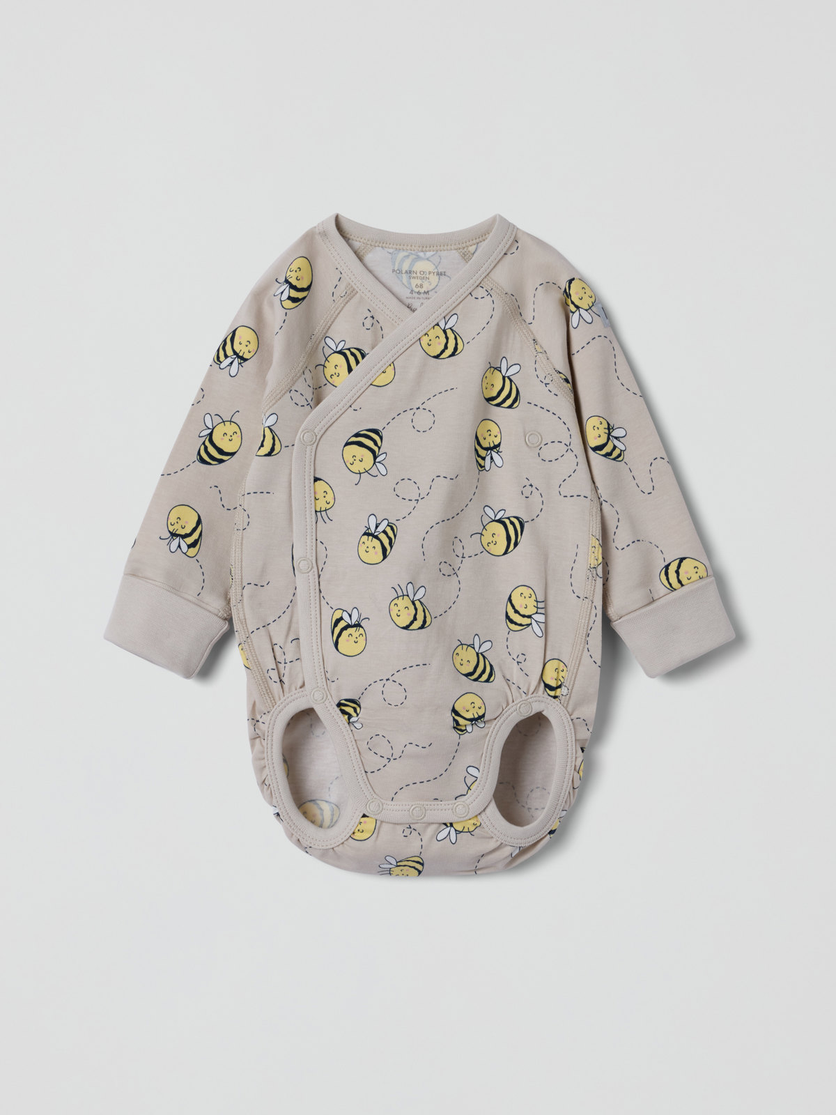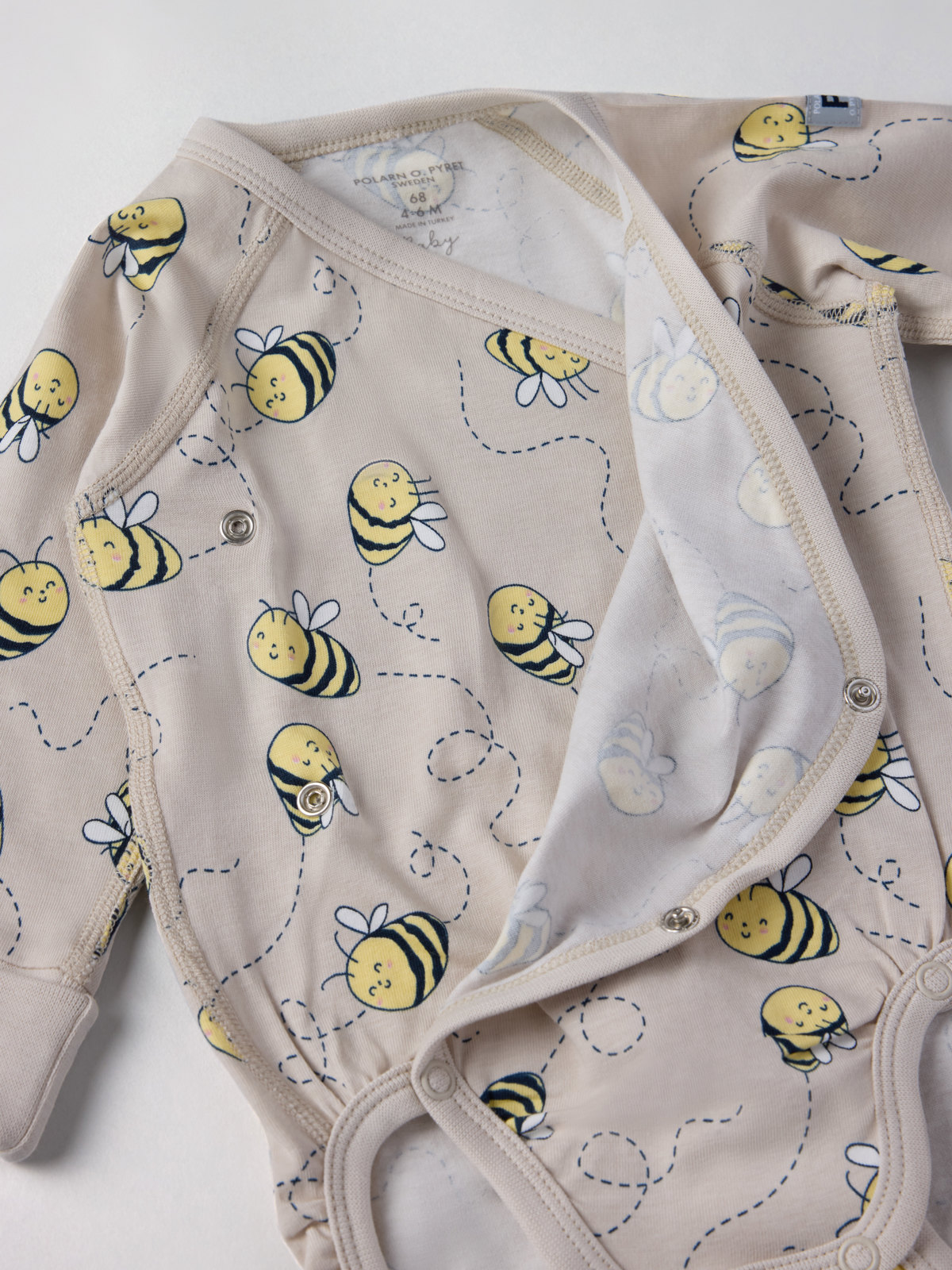 Förlängningsbar omlottbody i 100 % ekologisk bomull, helmönstrad med bin. Tack vare den smarta lösningen med en extra rad tryckknappar i grenen och nedvikbara muddar vid ärmsluten kan bodyn växa tillsammans med bebisen!