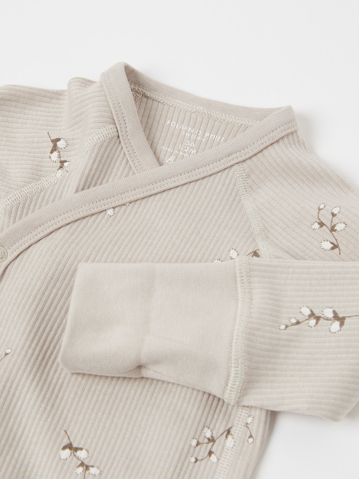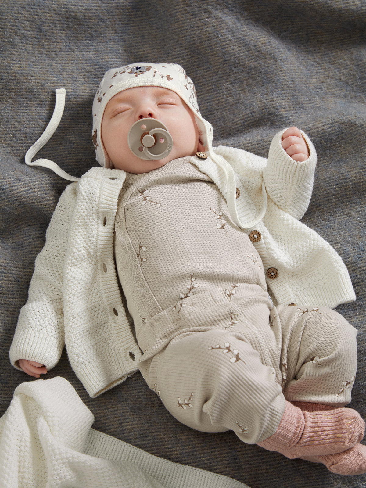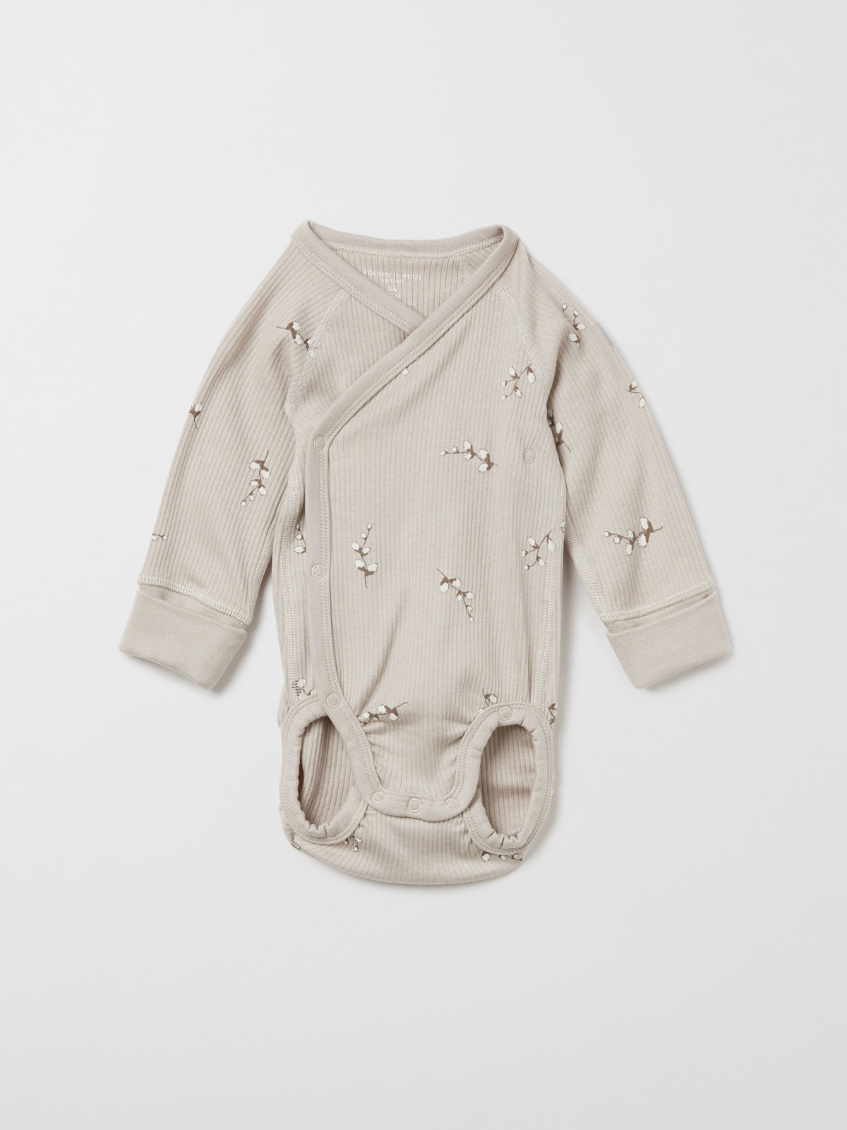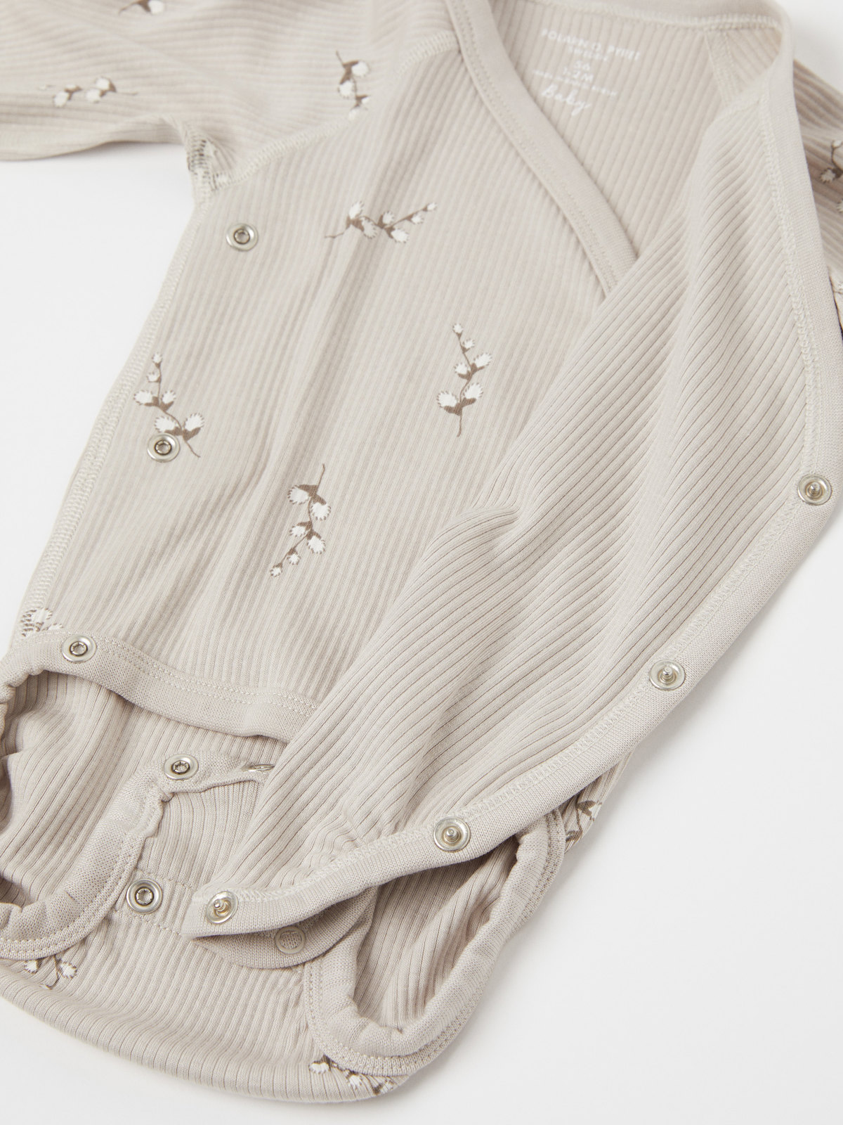 Förlängningsbar, ribbad omlottbody i mjuk, ekologisk bomull och lyocell. Tack vare den smarta lösningen med en extra rad tryckknappar i grenen och nedvikbara muddar vid ärmsluten kan bodyn växa tillsammans med bebisen!