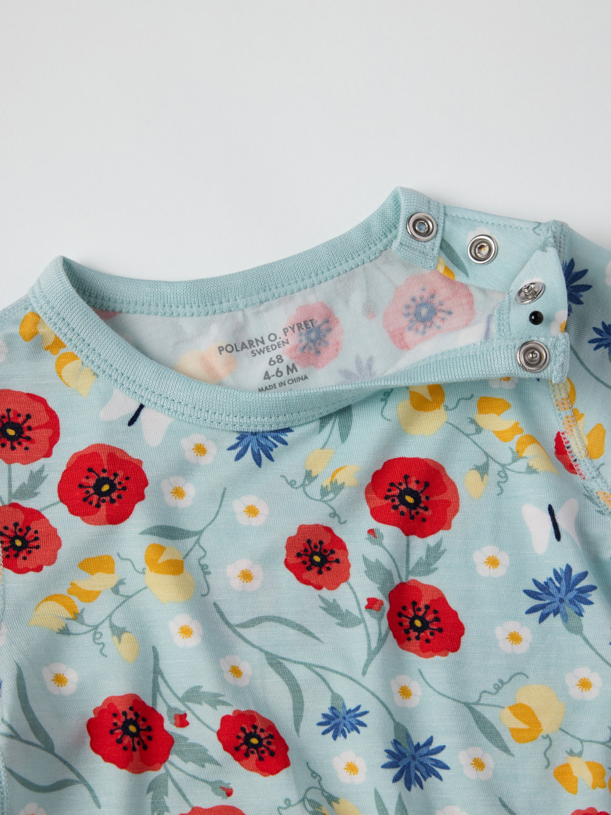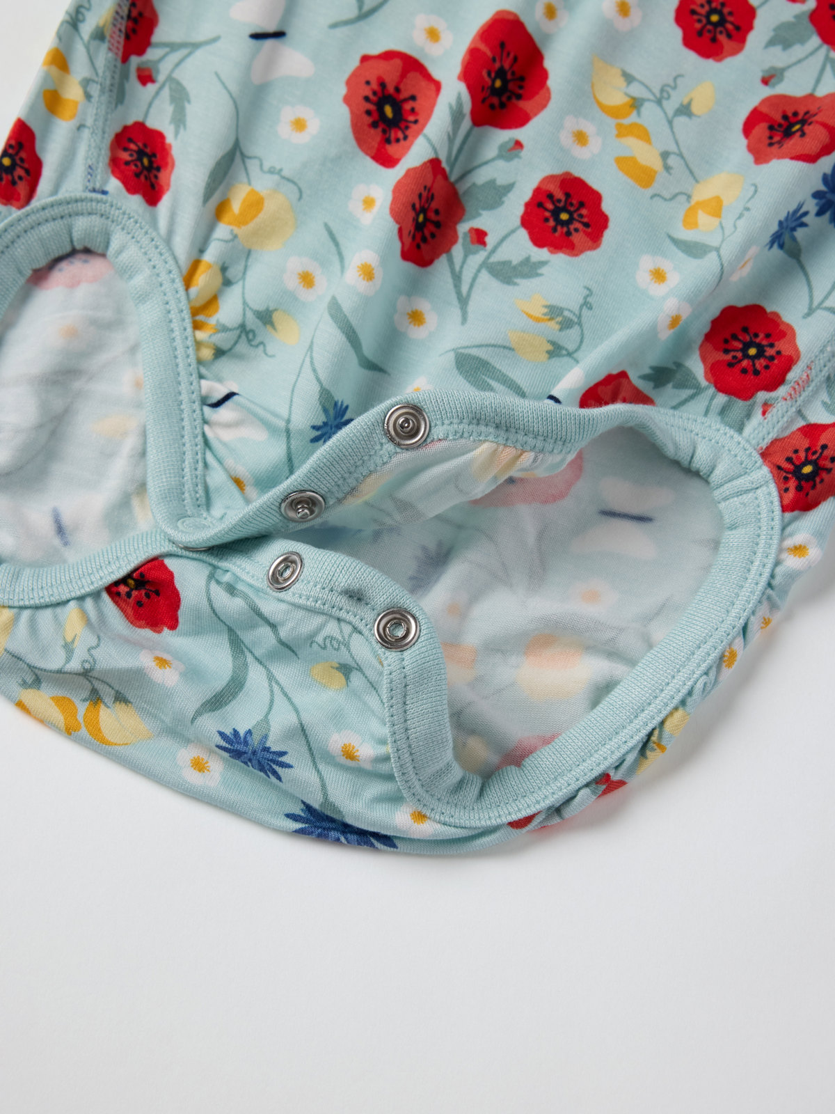 Blommig kortärmad body tillverkad i tunn och sval trikå av Ecovero™ Viscose – en riktigt skön sommarfavorit! Bodyn är sydd med extra mjuka sömmar och är skonsam mot känslig hud. Tryckknapparna på ena axeln och i grenen underlättar klädbyten.