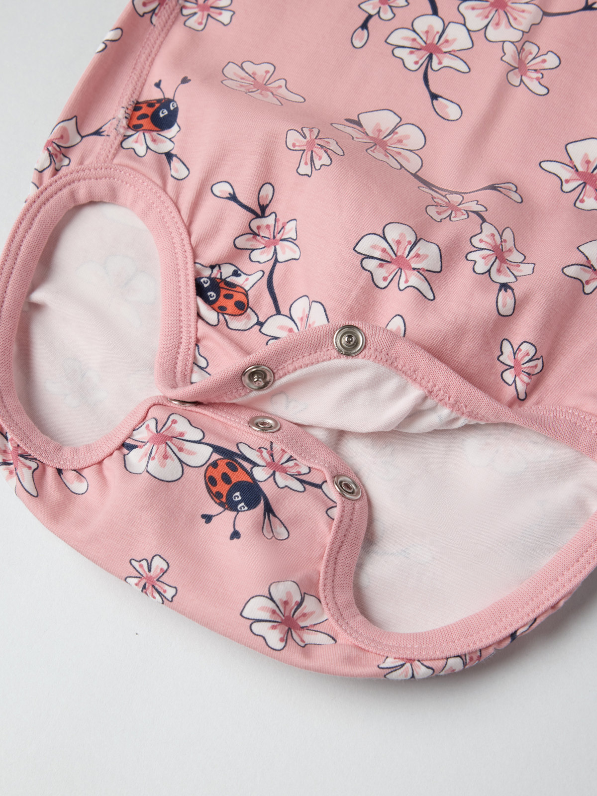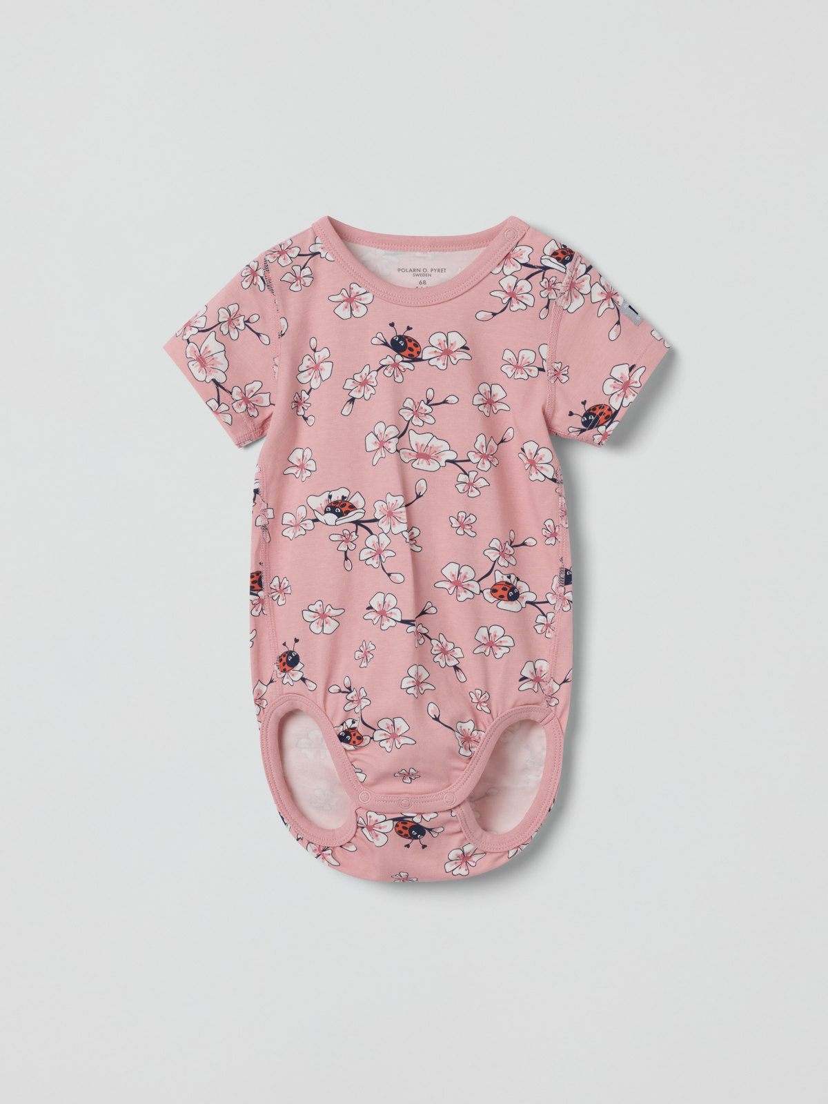 Kortärmad body i mjuk ekologisk bomull sydd med extra mjuka, platta sömmar som inte skaver mot känslig hud. Bodyn är helmönstrad med blommor.