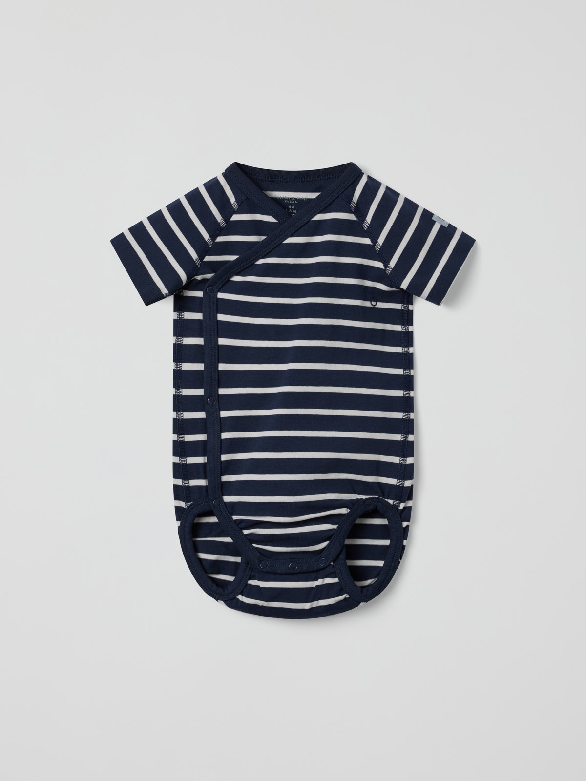Kortärmad randig omlottbody i mjuk ekologisk bomull – en klassiker i sommarvärmen! Bodyn är sydd med extra mjuka sömmar och är skonsam mot känslig hud. Tryckknapparna längs omlottöppningen och i grenen underlättar klädbyten.