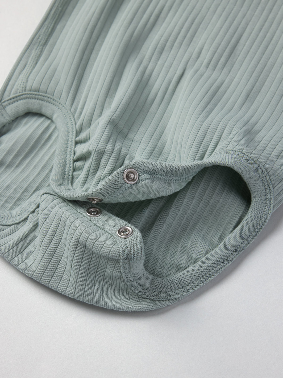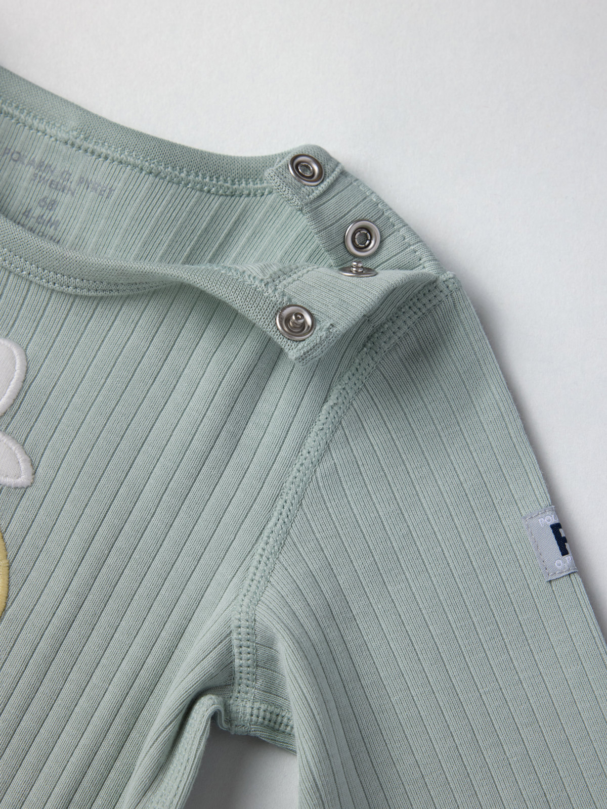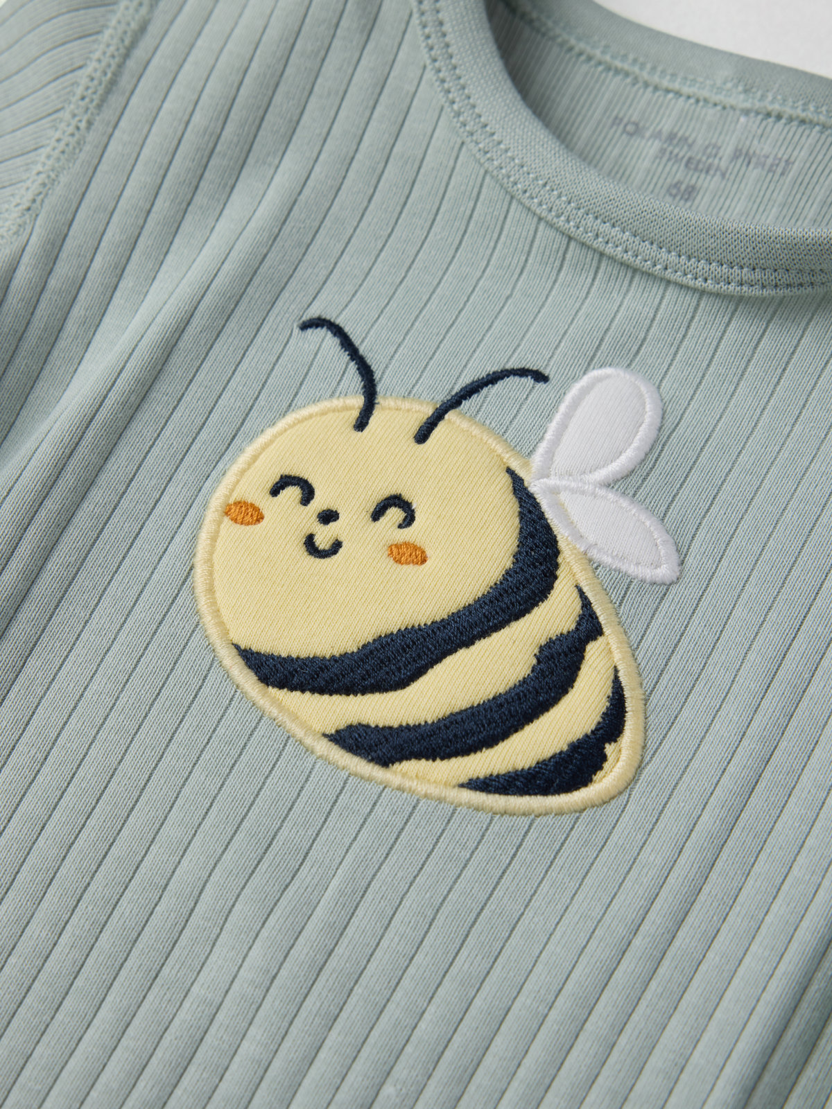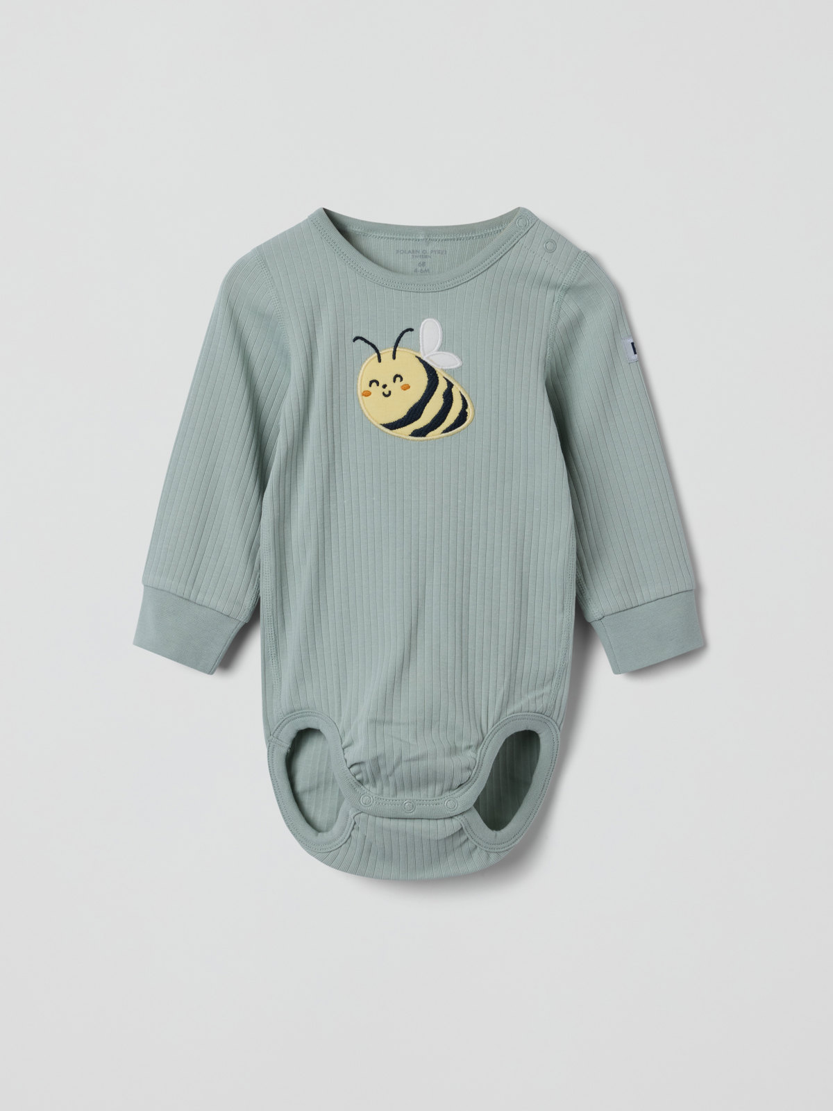Ribbad body i mjuk ekologisk bomull för baby. Bodyn har en söt biapplikation på framstycket och är sydd med extra mjuka, platta sömmar som inte skaver mot känslig hud.