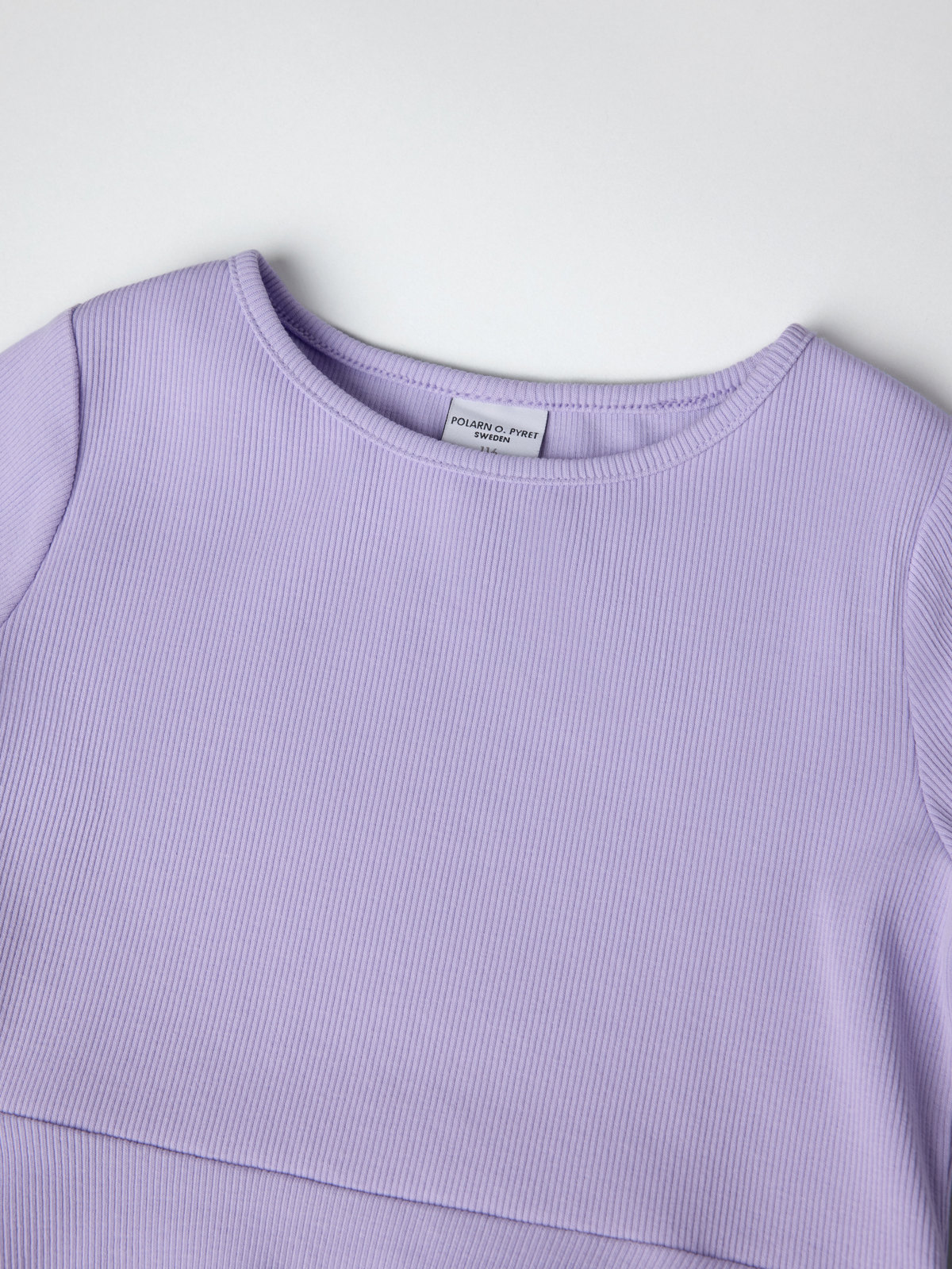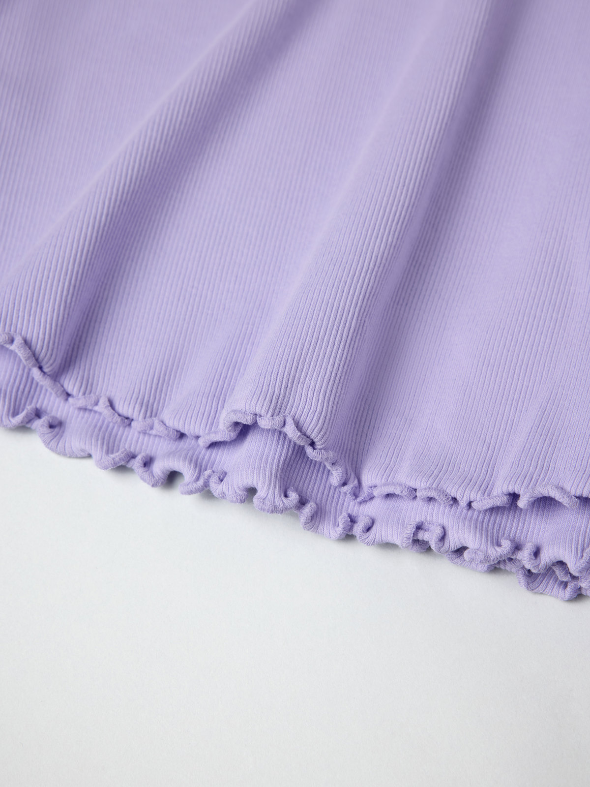 Den här klänningen är ett måste i barngarderoben! Den är tillverkad i mjuk ribbad bomullstrikå och har extra vidd i kjolen som står ut fint när man snurrar. Klänningen har söt uddkant i nederkant och ärmslut.