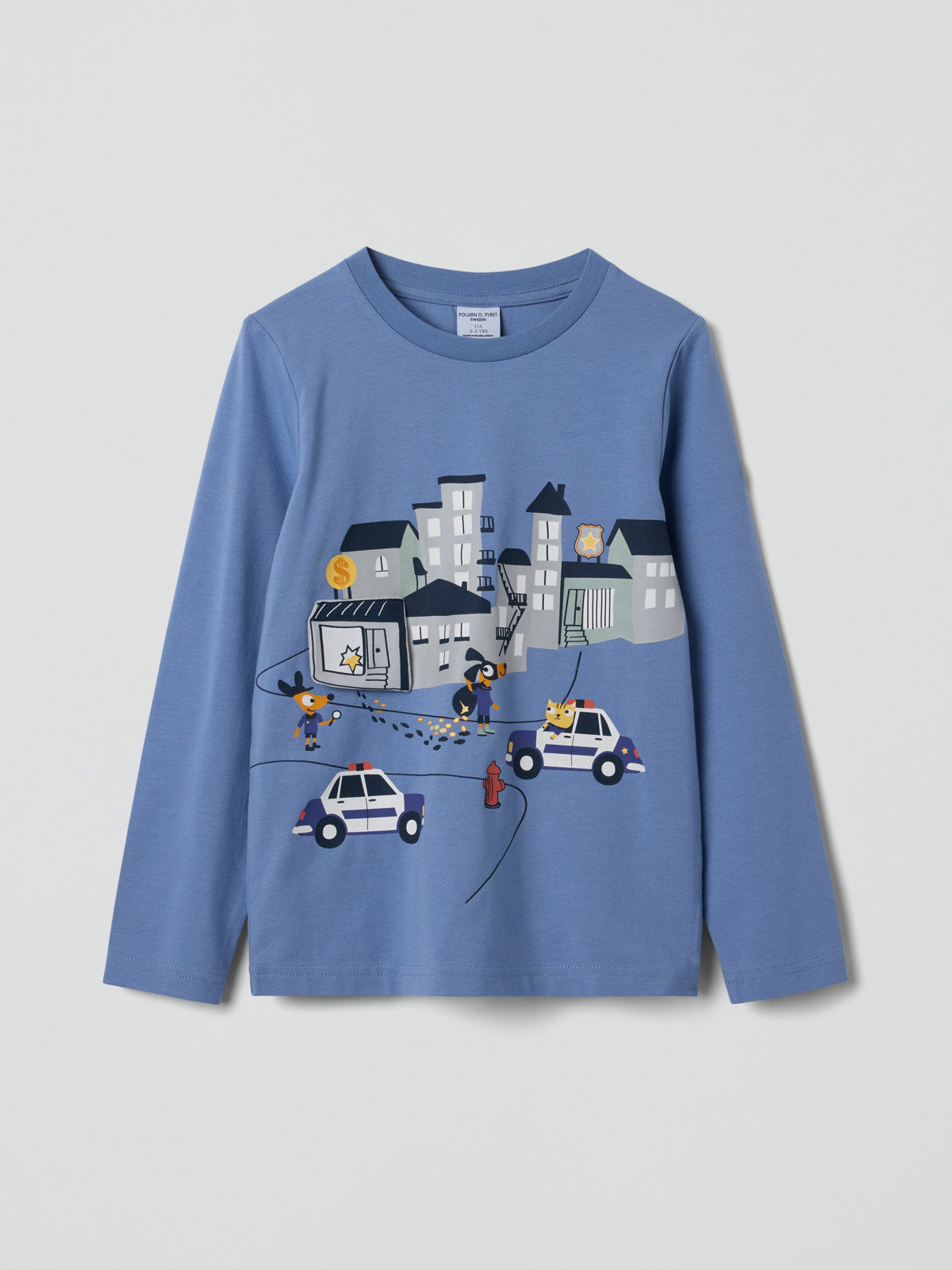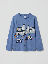 Tunn och skön tröja i mjuk ekologisk bomullstrikå – en favorit att älska länge! Tröjan har ett stort tryck med bilar på framstycket och en lucka som går att lyfta på.