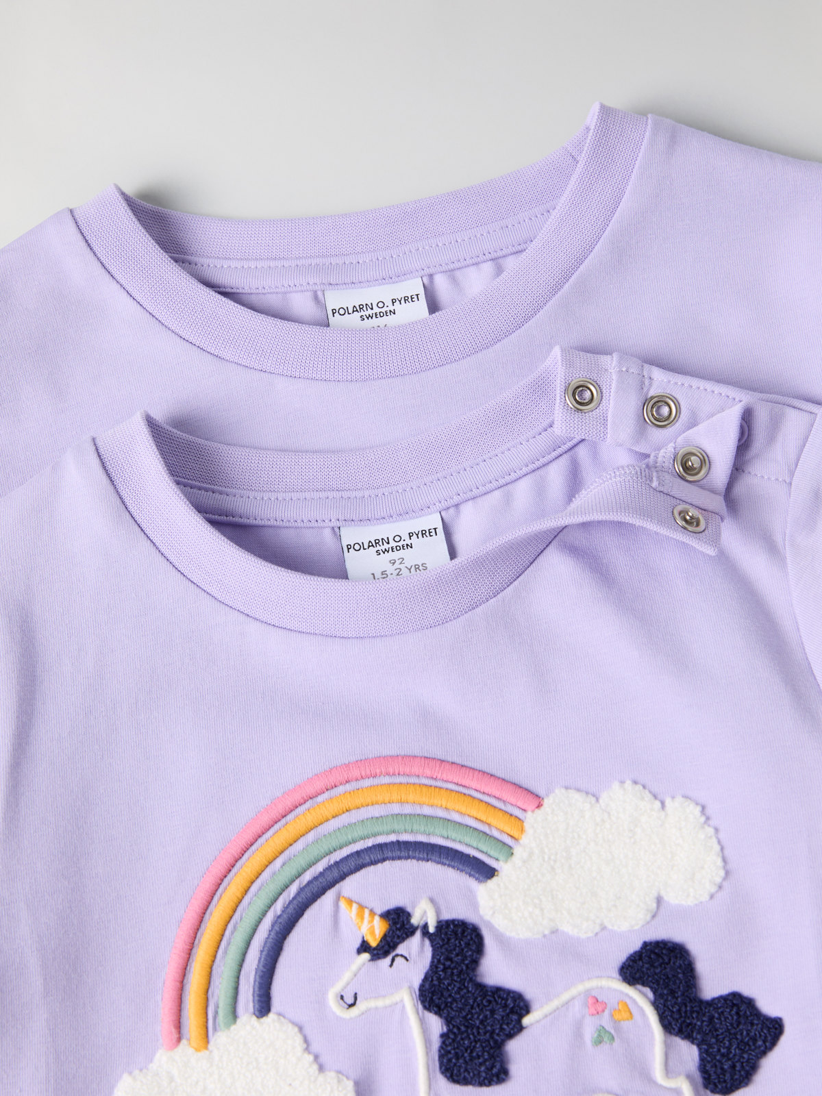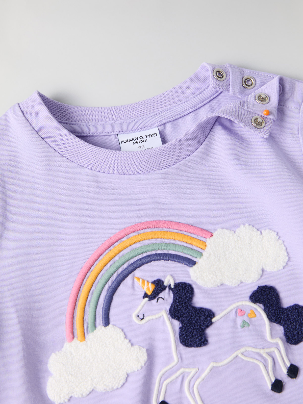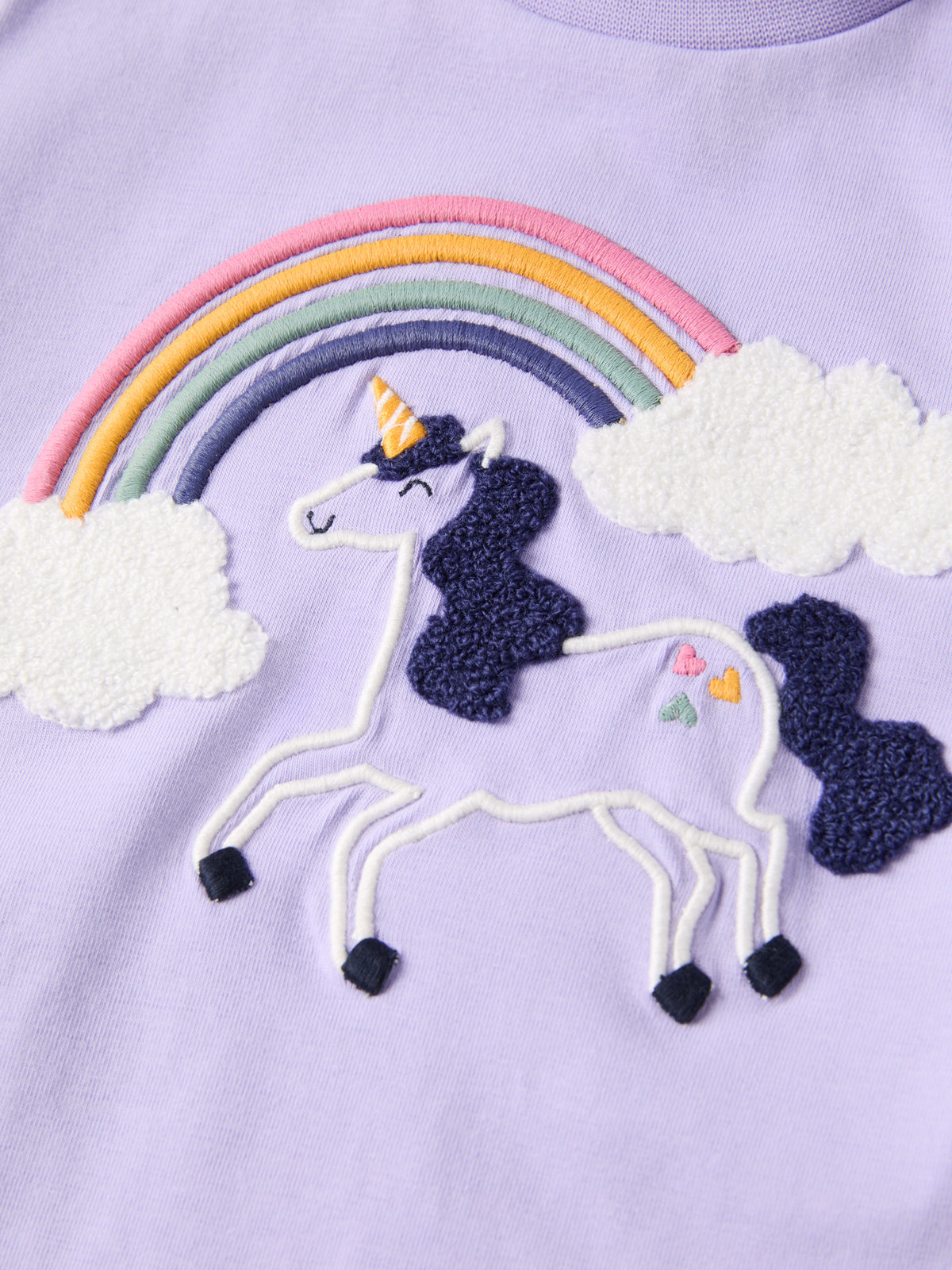 Tunn och skön tröja i mjuk ekologisk bomullstrikå – en favorit att älska länge! Tröjan har ett stort tryck med en enhörning på framstycket med broderade terrydelar som sticker ut från tyget.