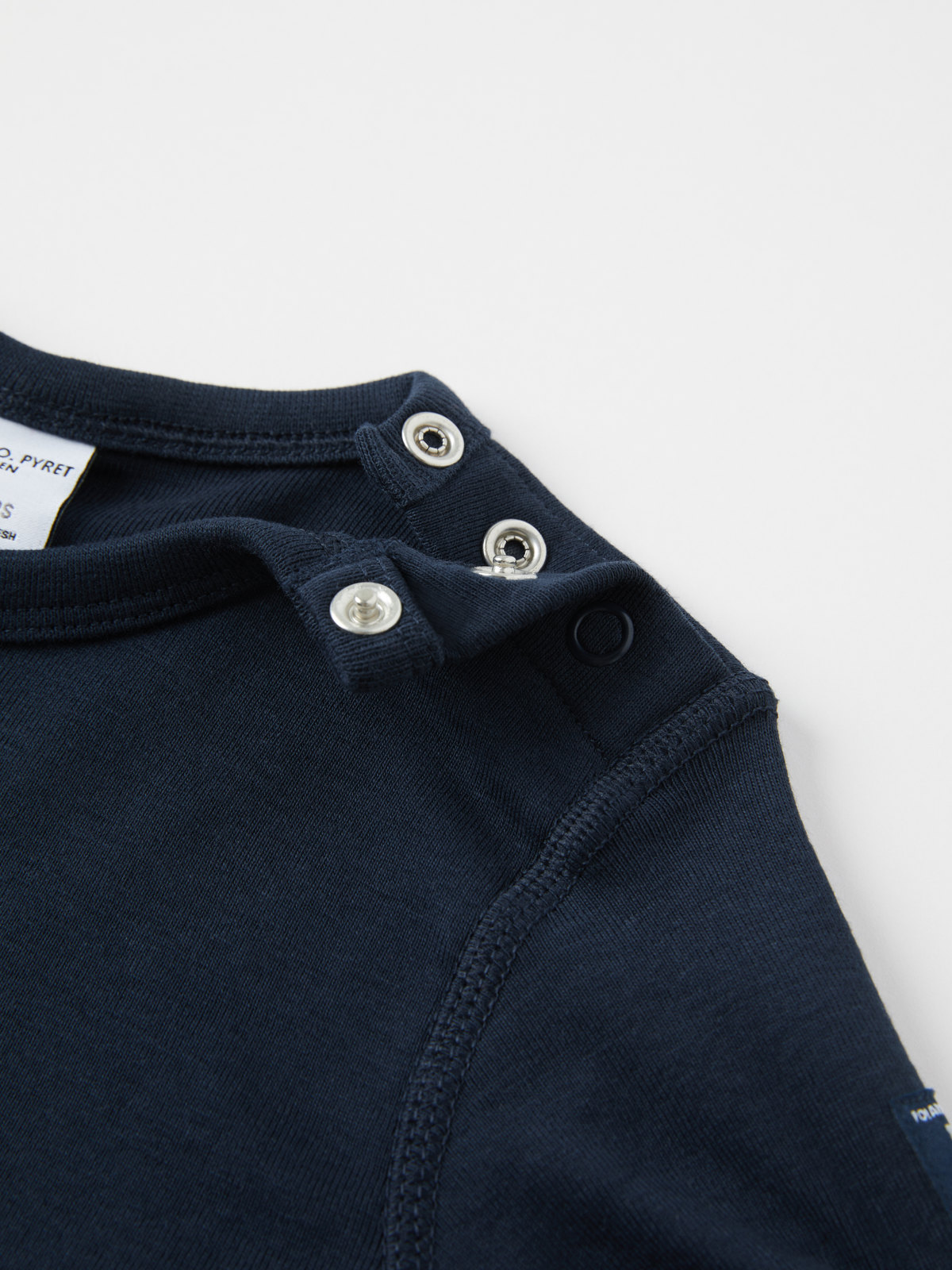 En enfärgad tröja i 100% ekologisk bomull. Tröjan har mjuk elastisk mudd kring halsringningen och vid ärmsluten. Storlekarna 74-92 har trytckknappar på ena axeln för att underlätta klädbyten.
