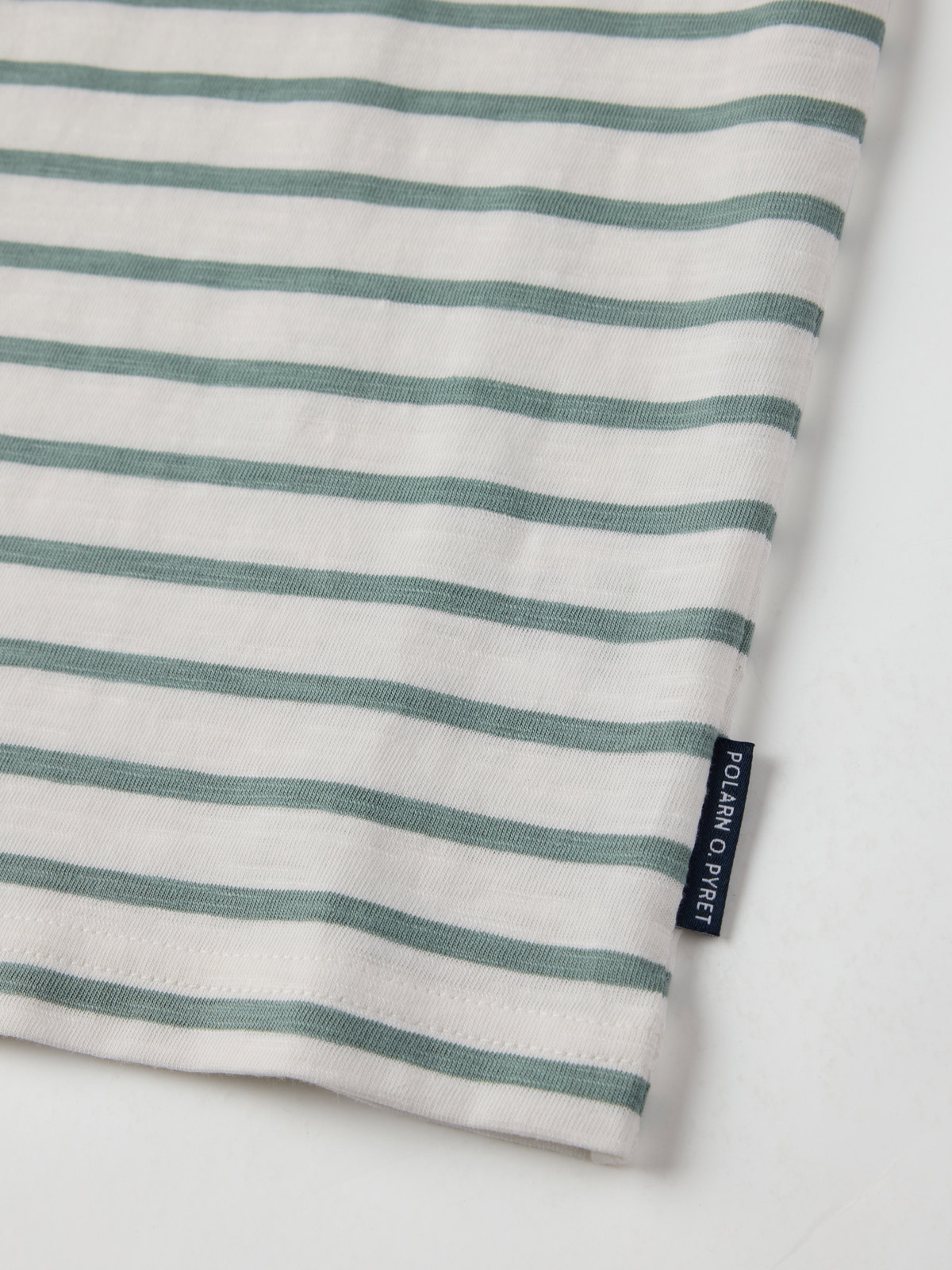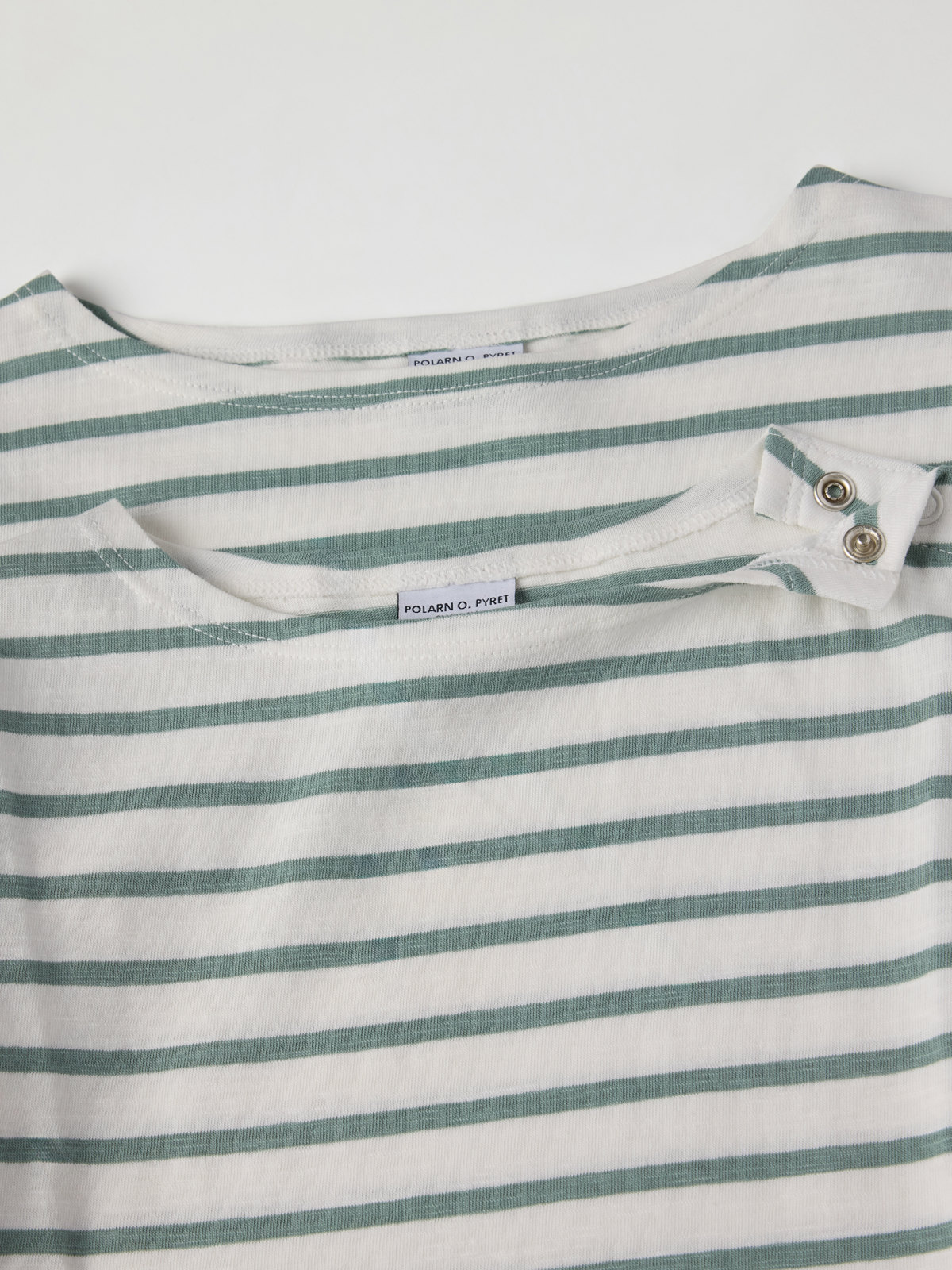 Randig tröja i 100 % tunn ekologisk bomull. Tröjan perfekt att använda under soliga utflykter, då den skyddar mot stark sol och är sval och skön. Storlek 86-92 har tryckknappar på ena axeln för att underlätta klädbyten.