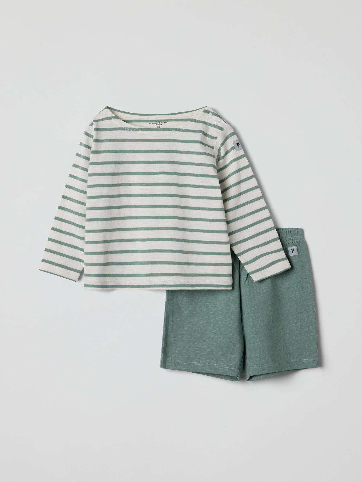 Set med tröja och shorts i 100 % tunn ekologisk bomull för baby – perfekt för varma dagar, då det skyddar lätt mot solen och är svalt och skönt. Tröjan har tryckknappar på ena axeln för att underlätta klädbyten. Shortsen har elastisk midja för skön passform.