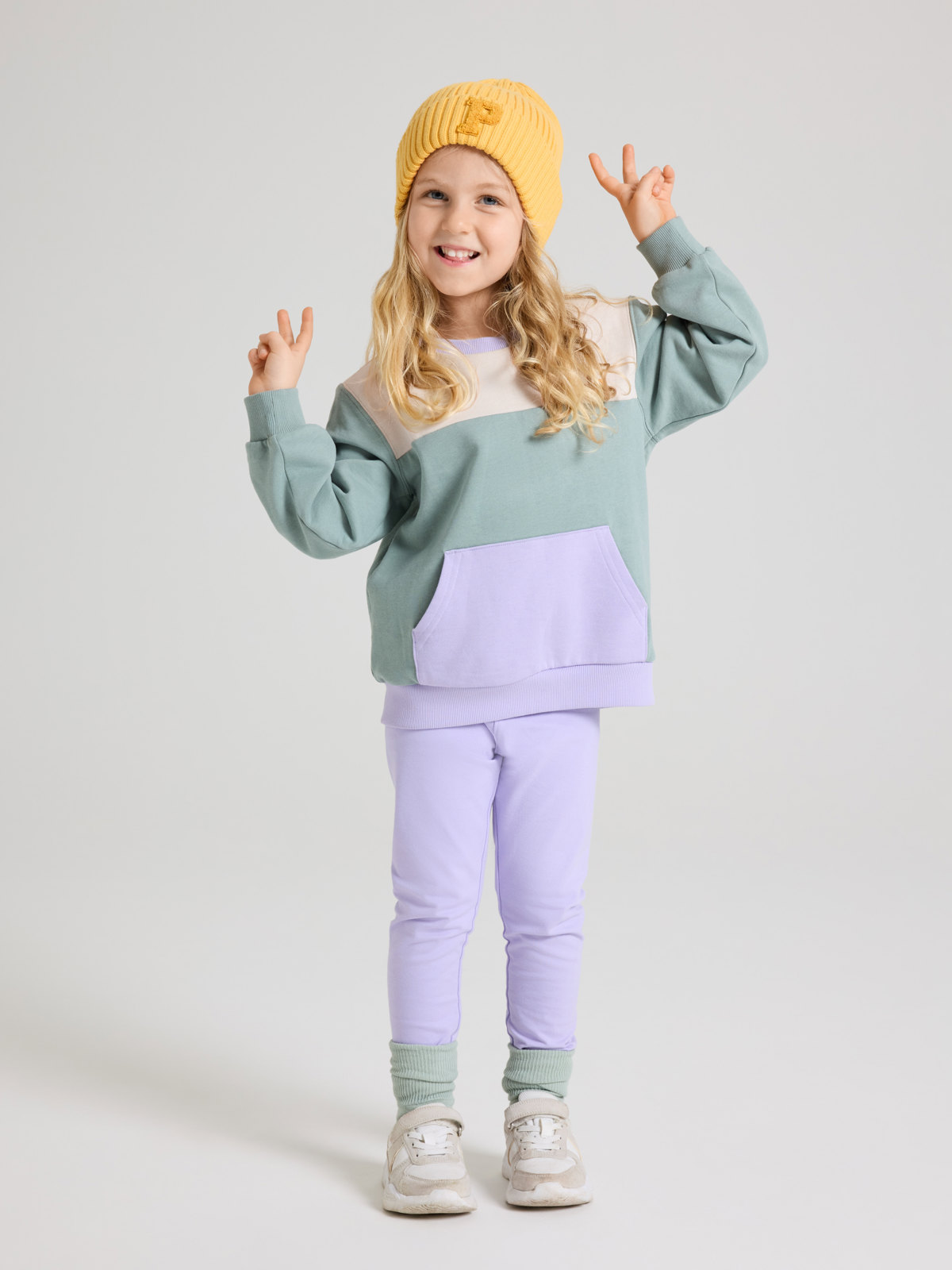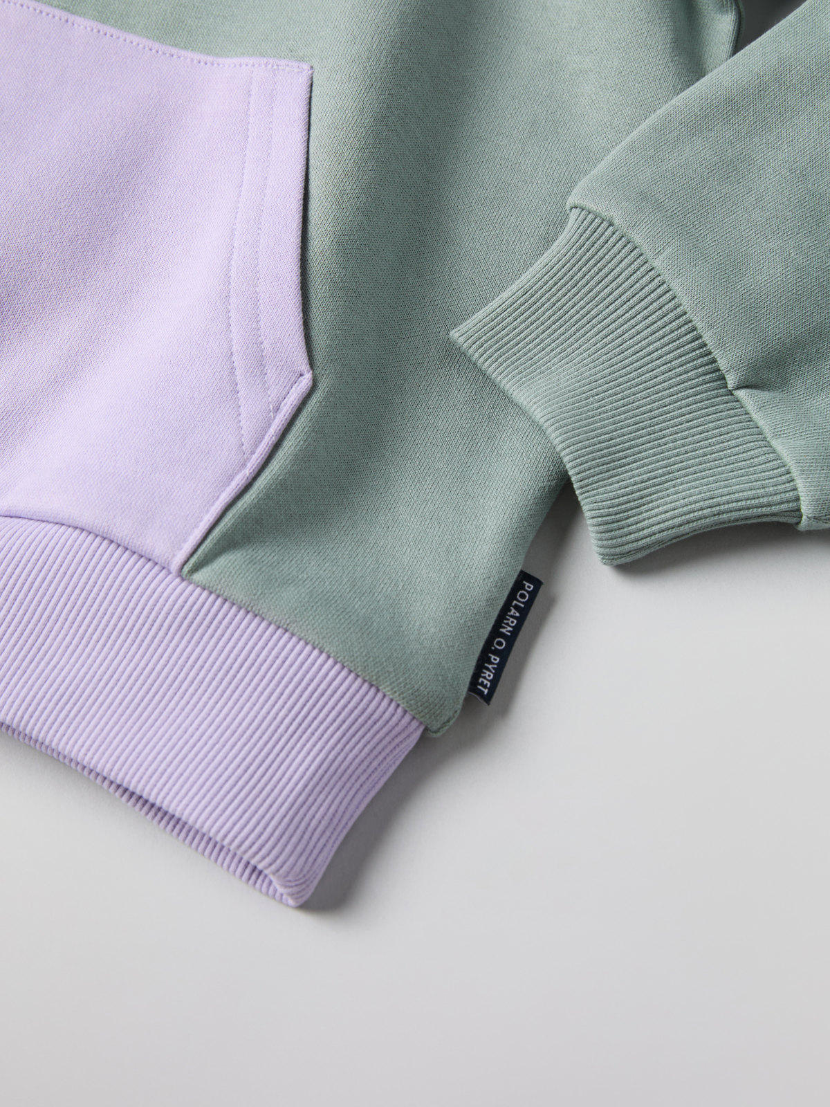 Tröjan är blockfärgad och har mjukt ribbad mudd i halsringning och ärmslut, samt känguruficka.