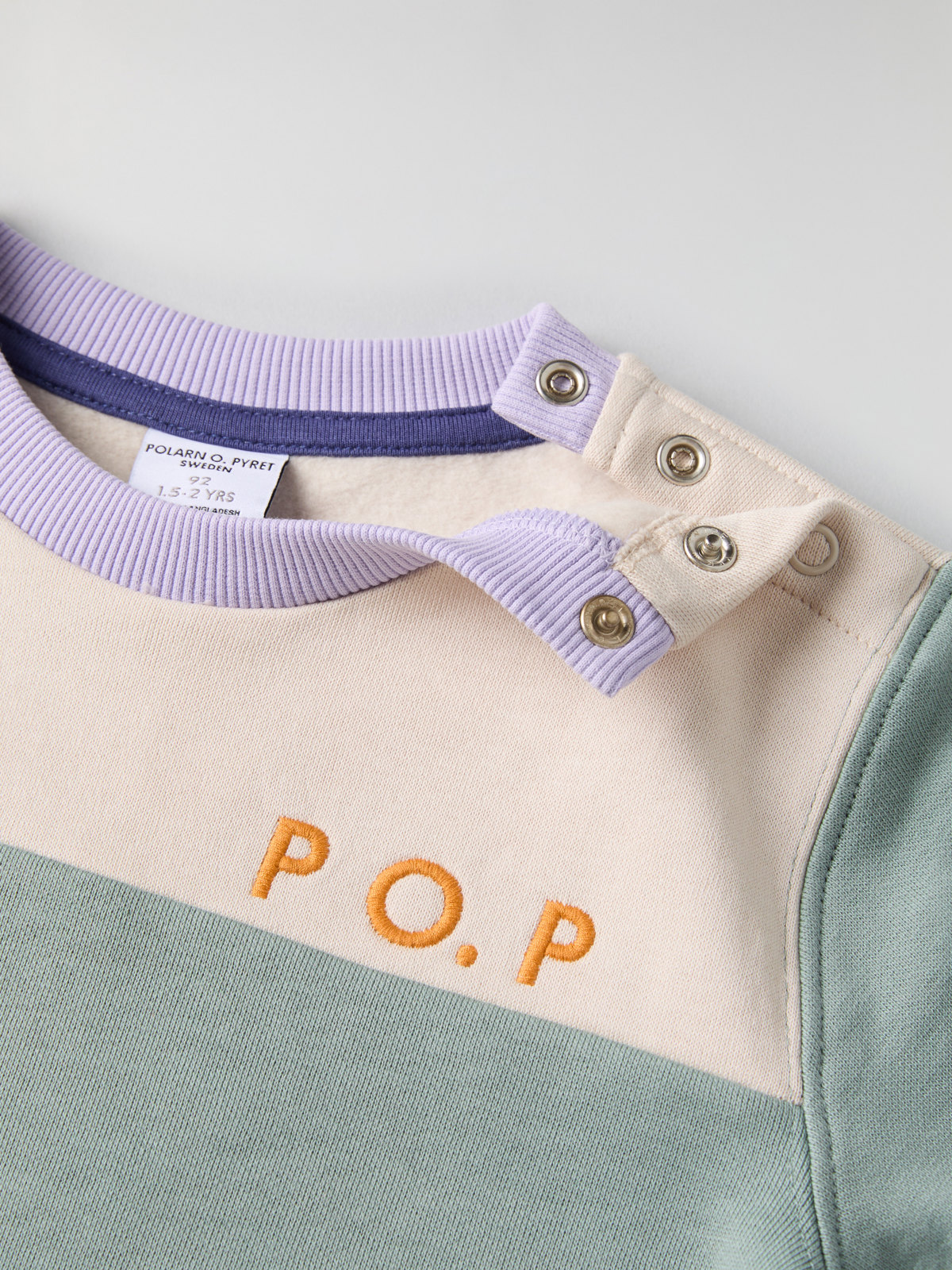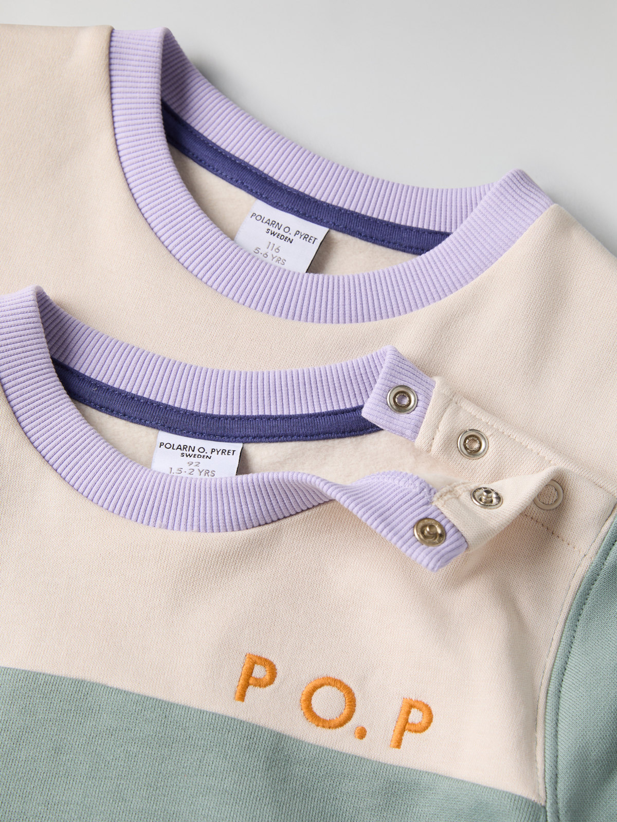 Storlekarna 86-92 har tryckknappar bak på ena axeln för att underlätta klädbyten.
