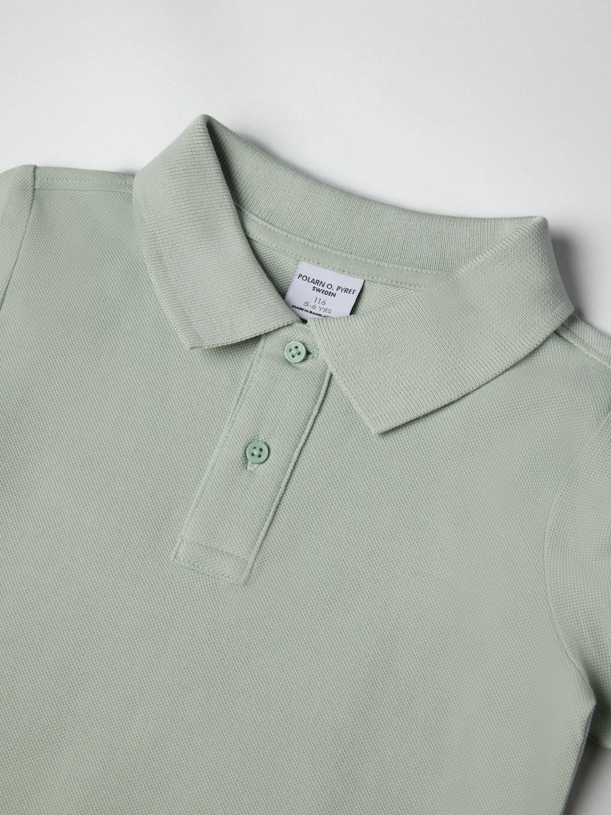 Enfärgad pikétröja i 100 % ekologisk bomull. Ett perfekt basplagg i barngarderoben som passar både till vardag och fest! Tröjan har ribbad mudd i ärmslut och mjuk krage med knappslå fram.