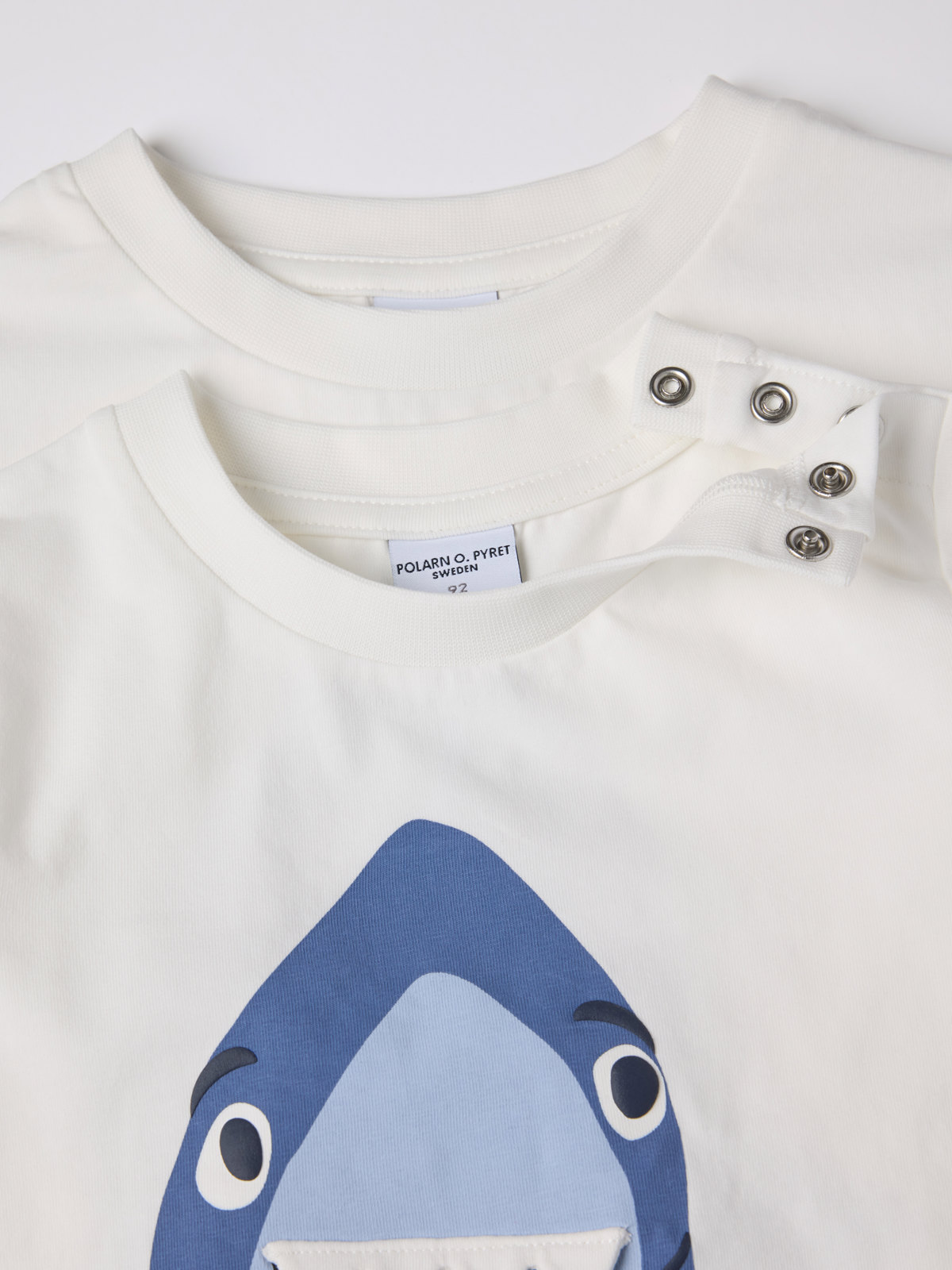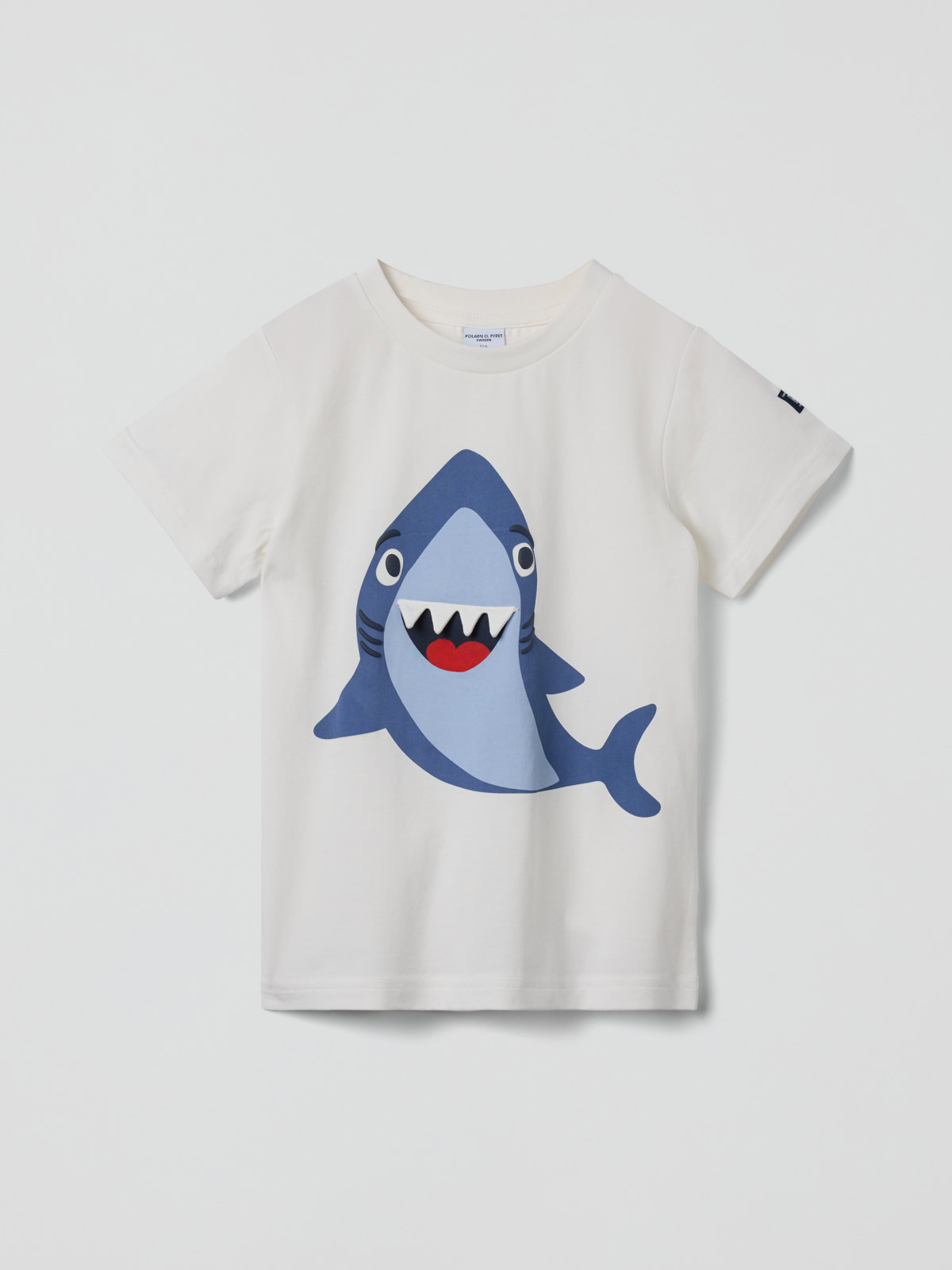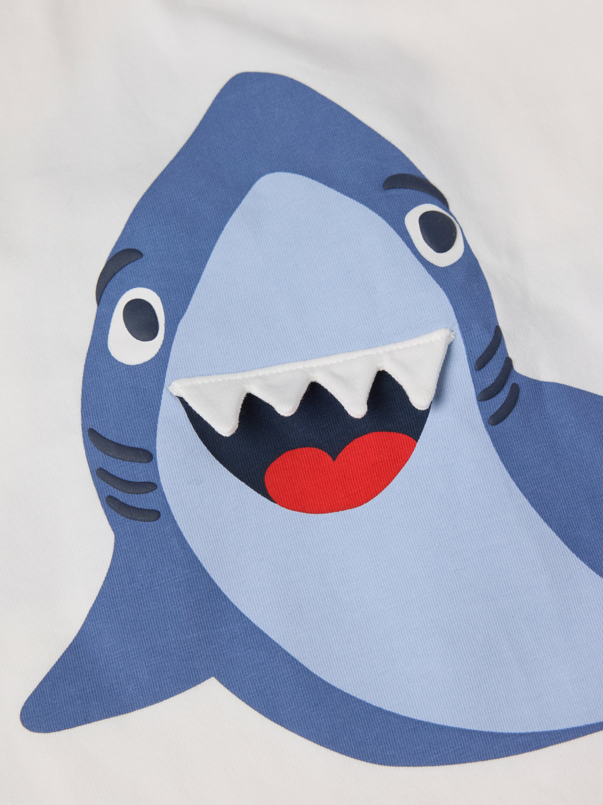 T-shirt i 100 % ekologisk bomull med lekfullt print med en stor haj på framstycket. Rolig att ha vid alla tillfällen! T-shirten finns i fler fäger och med flera olika prints som matchar fint med hela kollektionen. Hitta din favorit!
