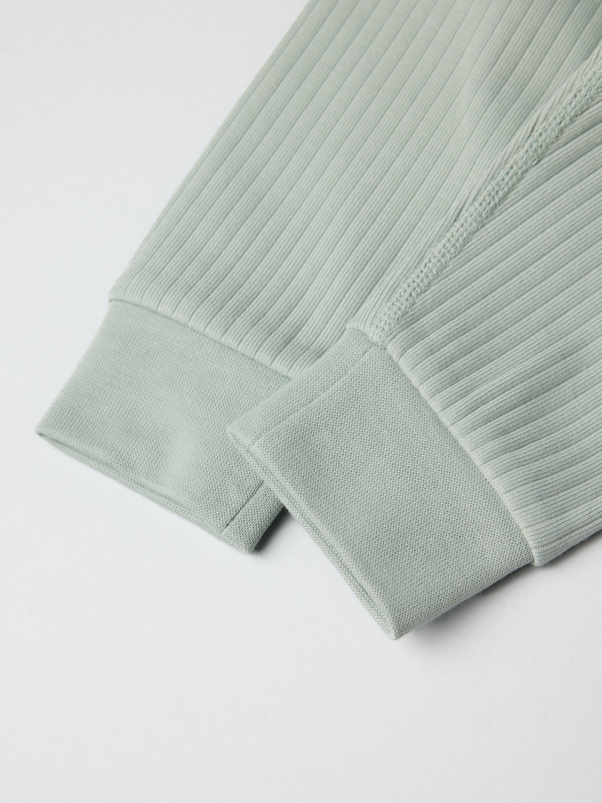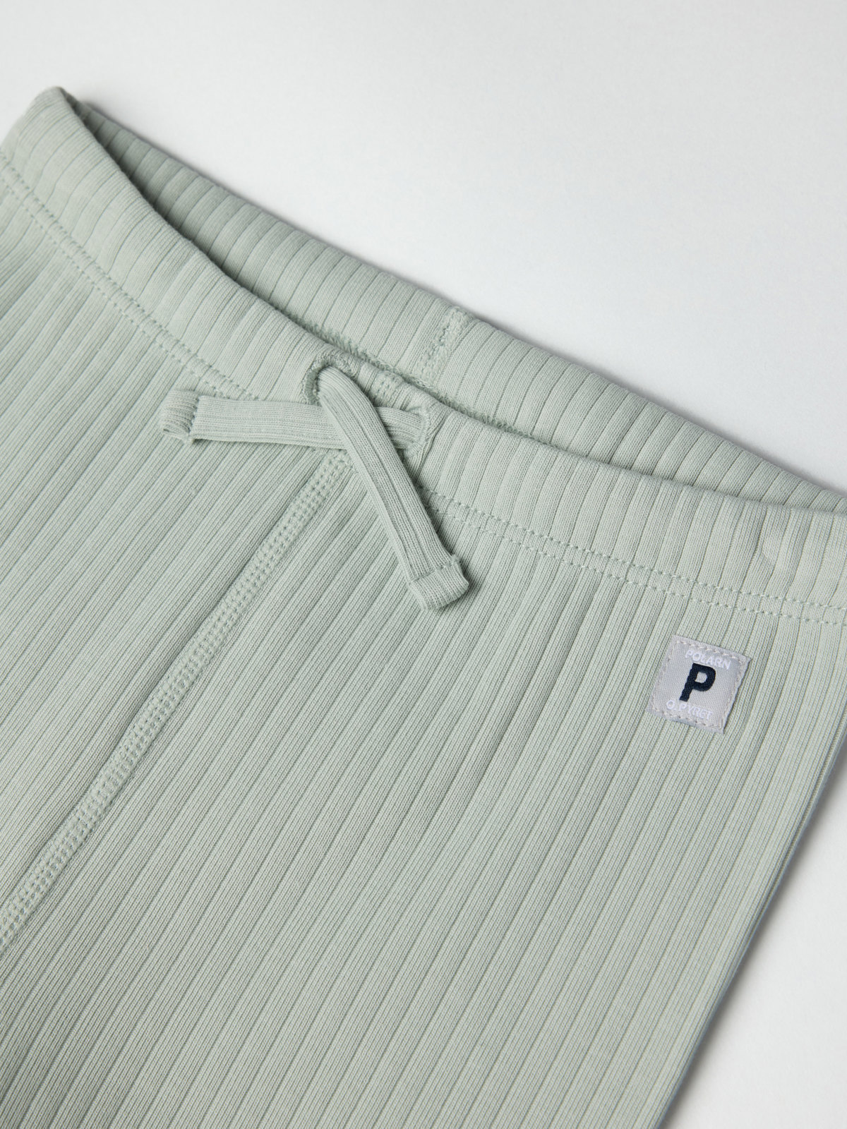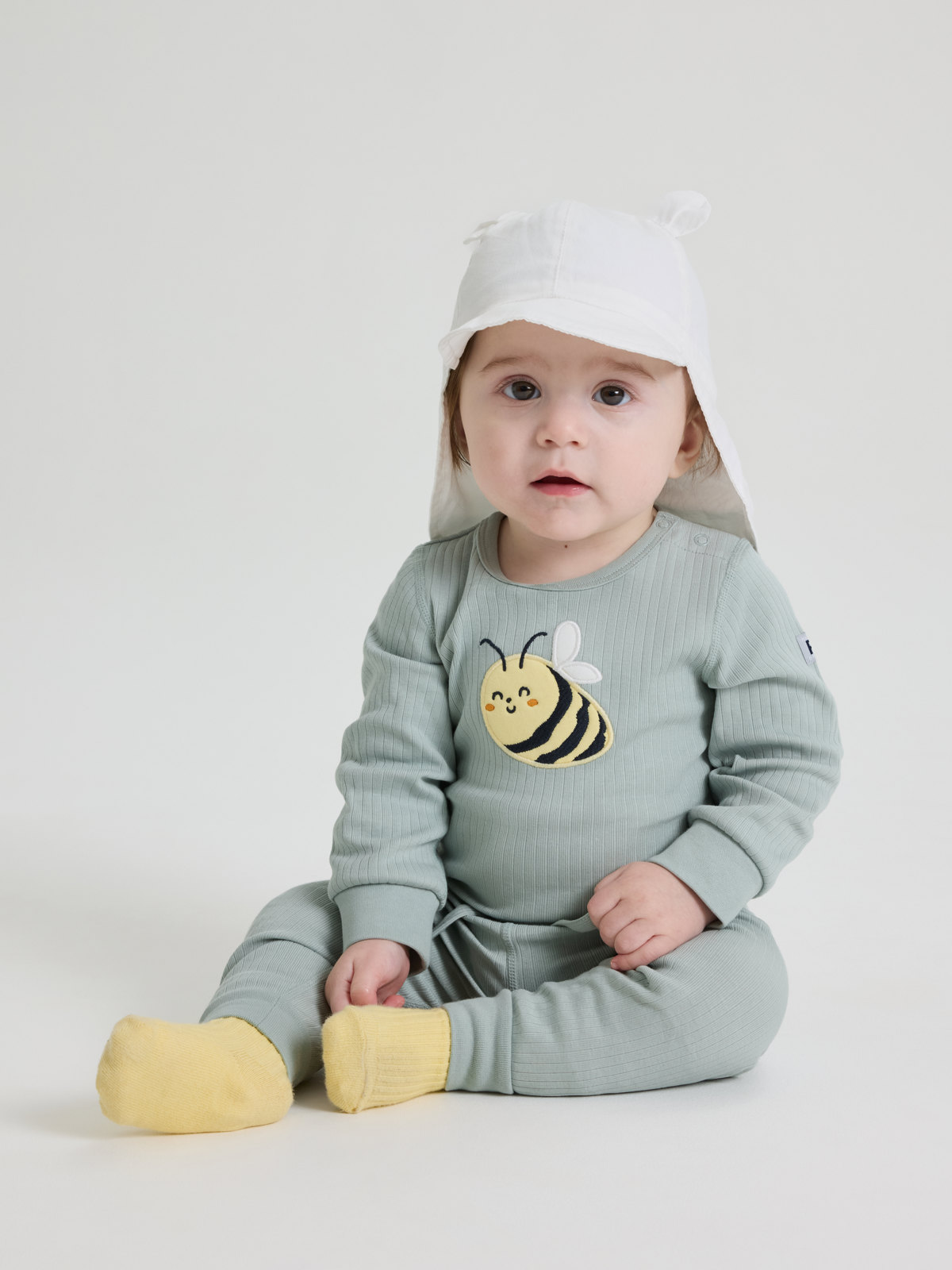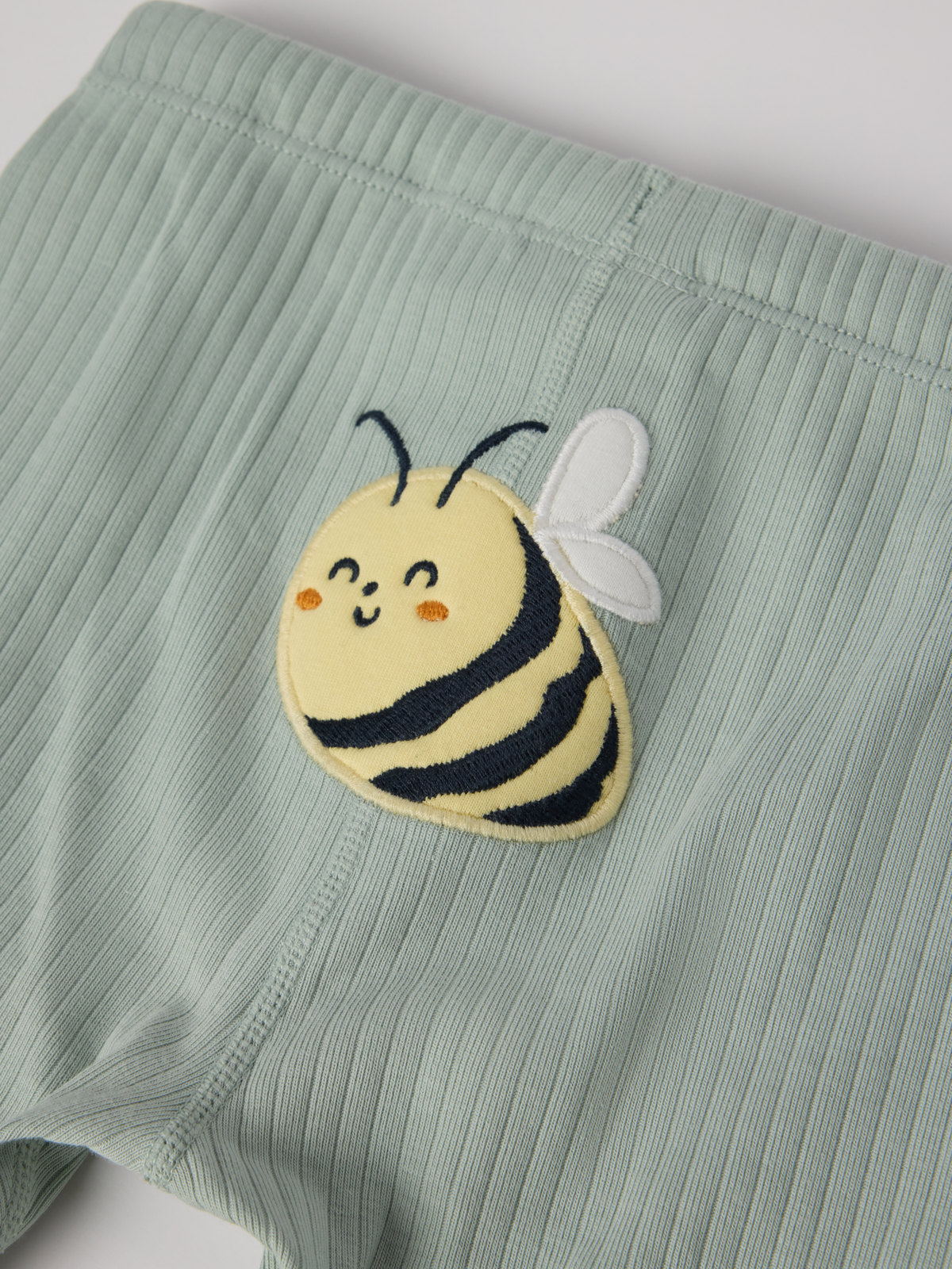 Ribbad byxa i mjuk ekologisk bomull för baby med söt biapplikation bak. Byxan har elastisk midja som går att reglera med knytband och mjuka muddar vid benslut för skön passform.