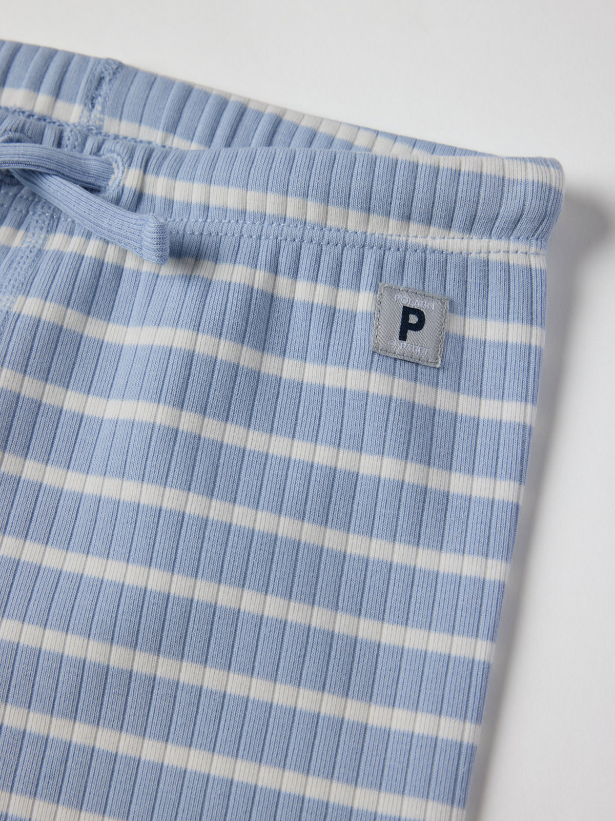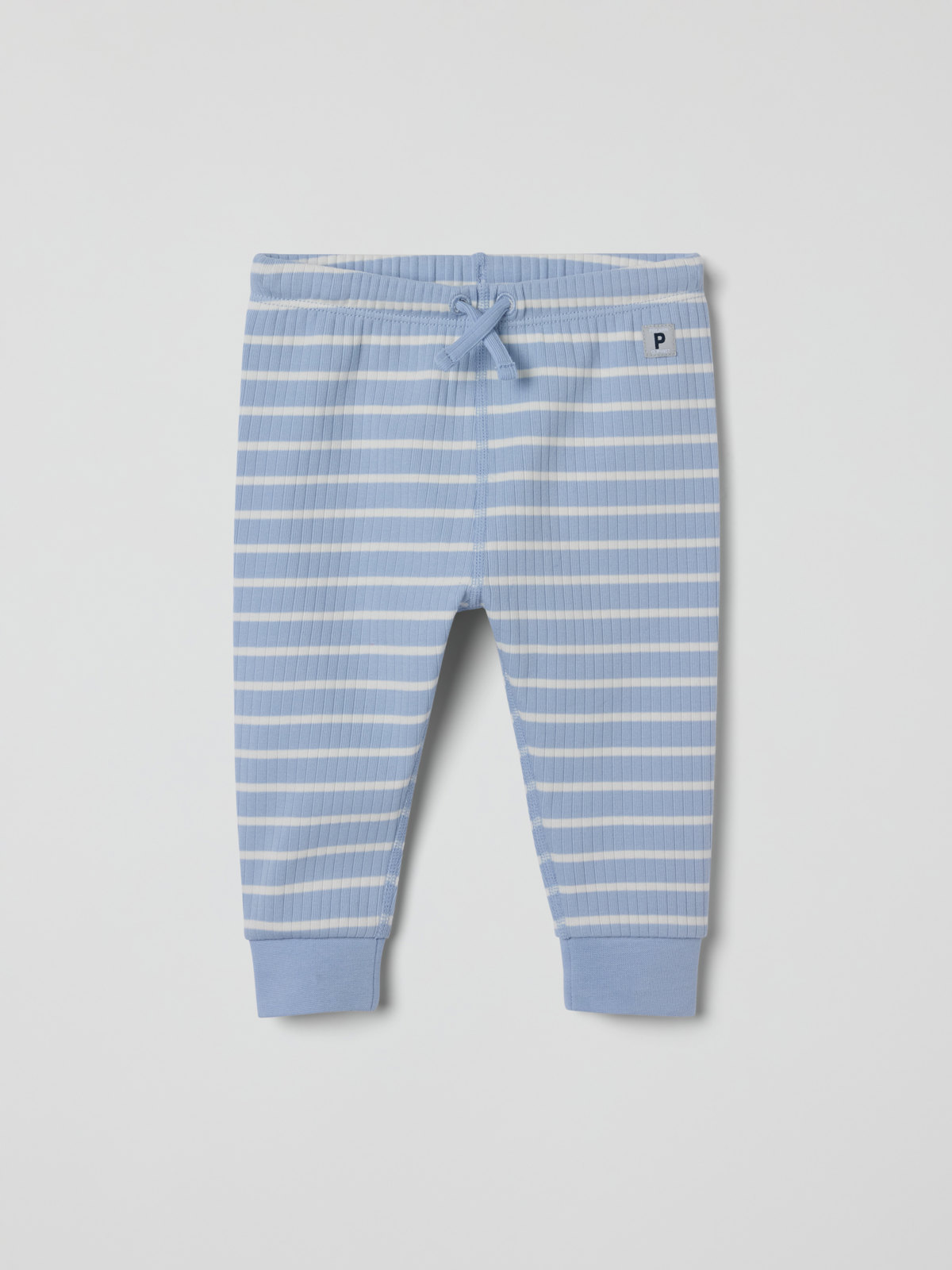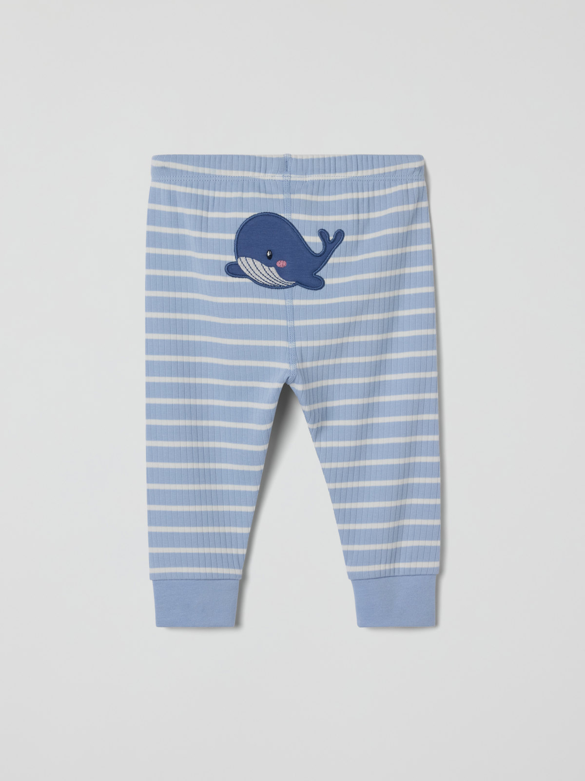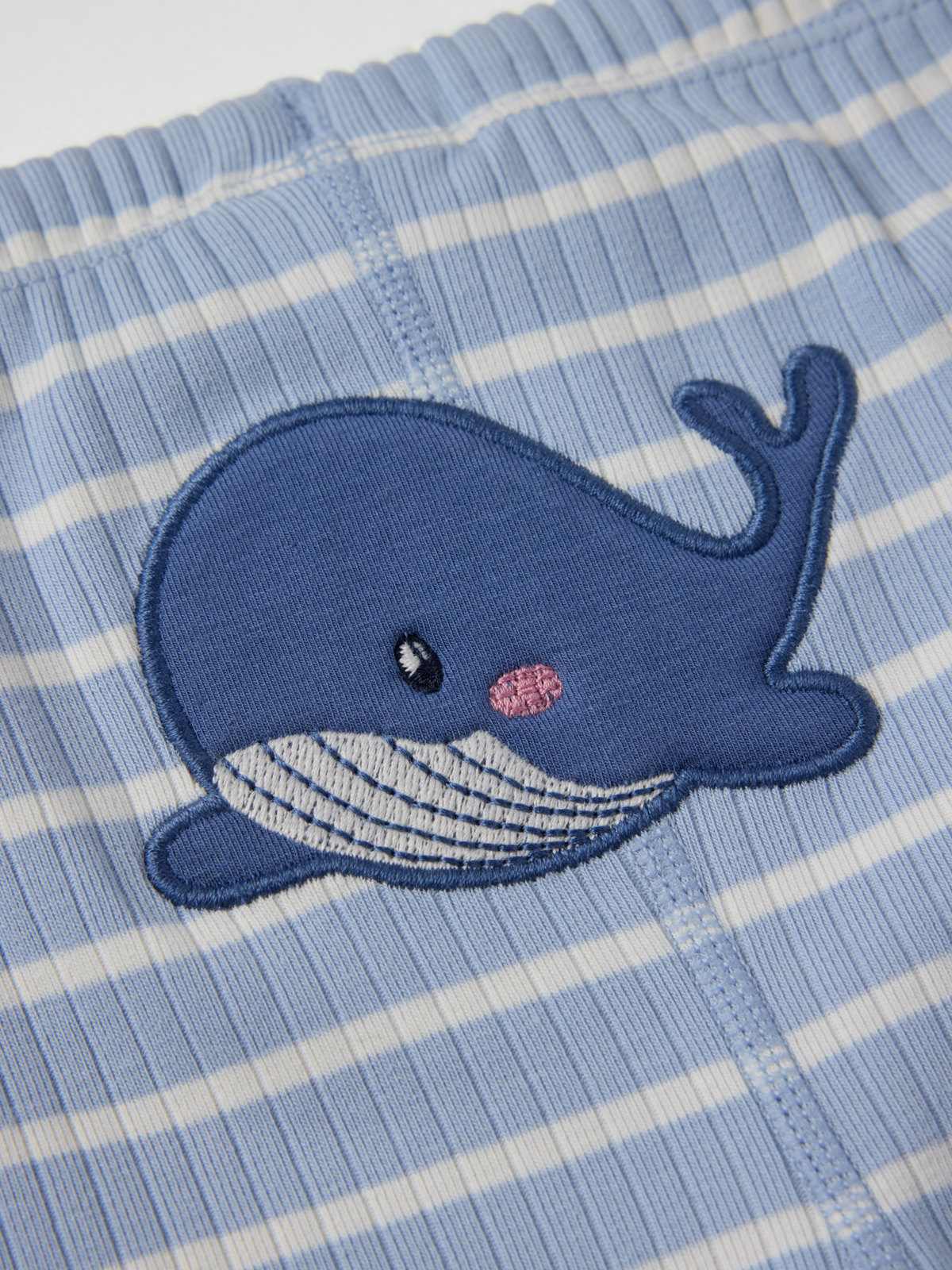 Ribbad byxa i mjuk ekologisk bomull för baby med söt valapplikation bak. Byxan har elastisk midja som går att justera med knytband och mjuka muddar vid benslut för skön passform.