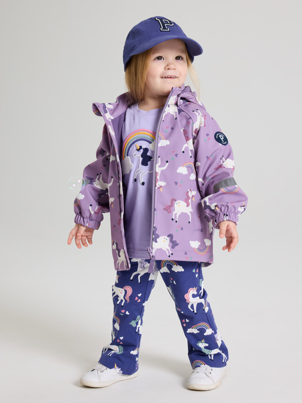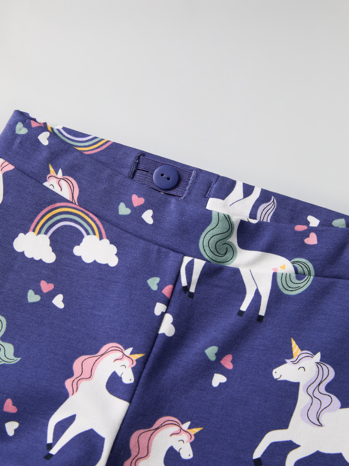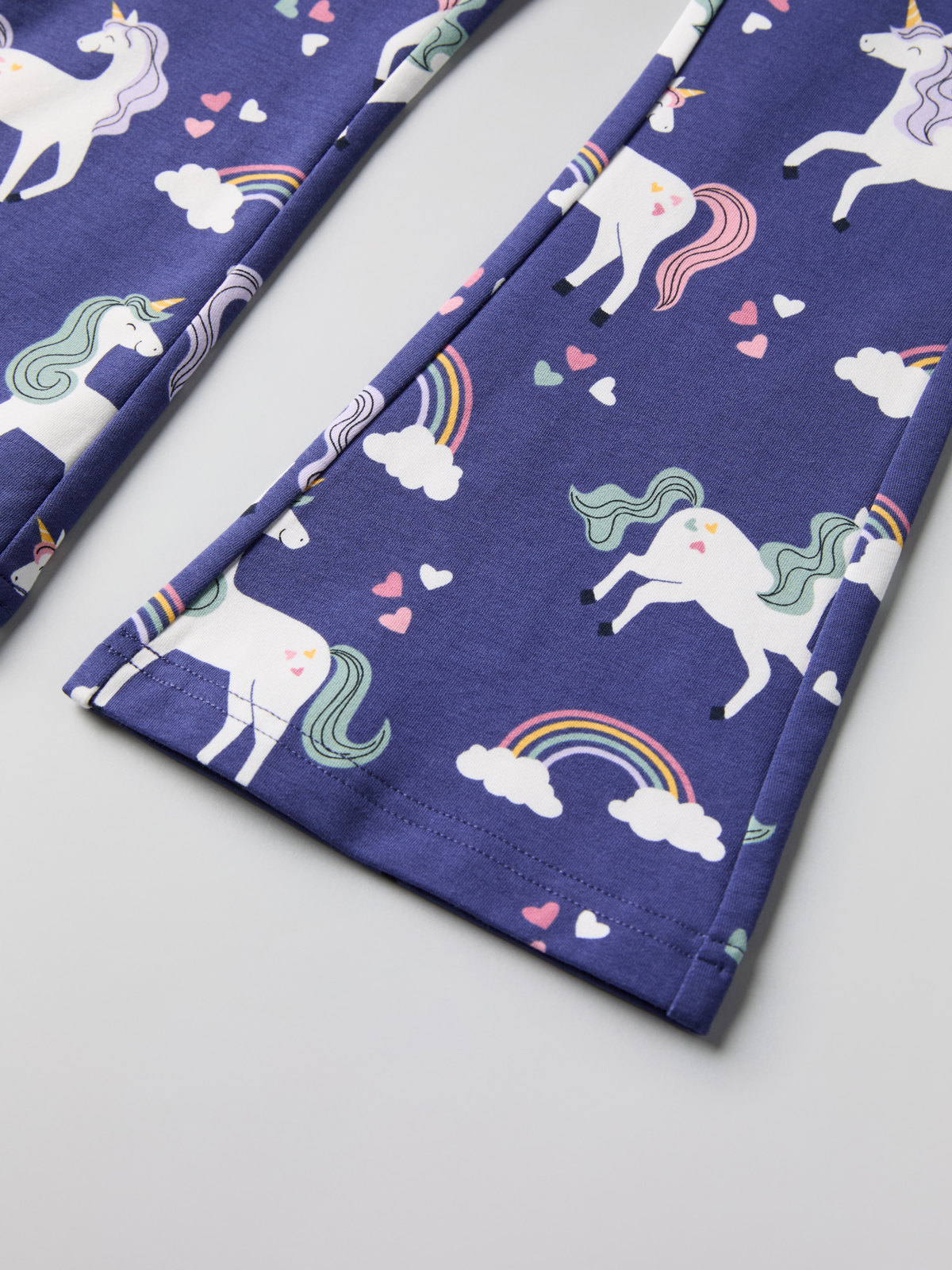 Byxan är helmönstrad med enhörningar och har elastisk midja som går att justera med knapphålsresår. Bensluten är utsvängda.