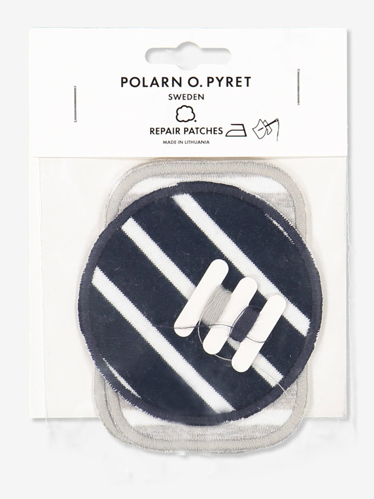Laglappar i vår klassiska rand, tillverkad i trikåtyg och ekologisk bomull. Roliga former som du stryker och syr fast på barnens kläder. I förpackningen finns ytterligare instruktioner.