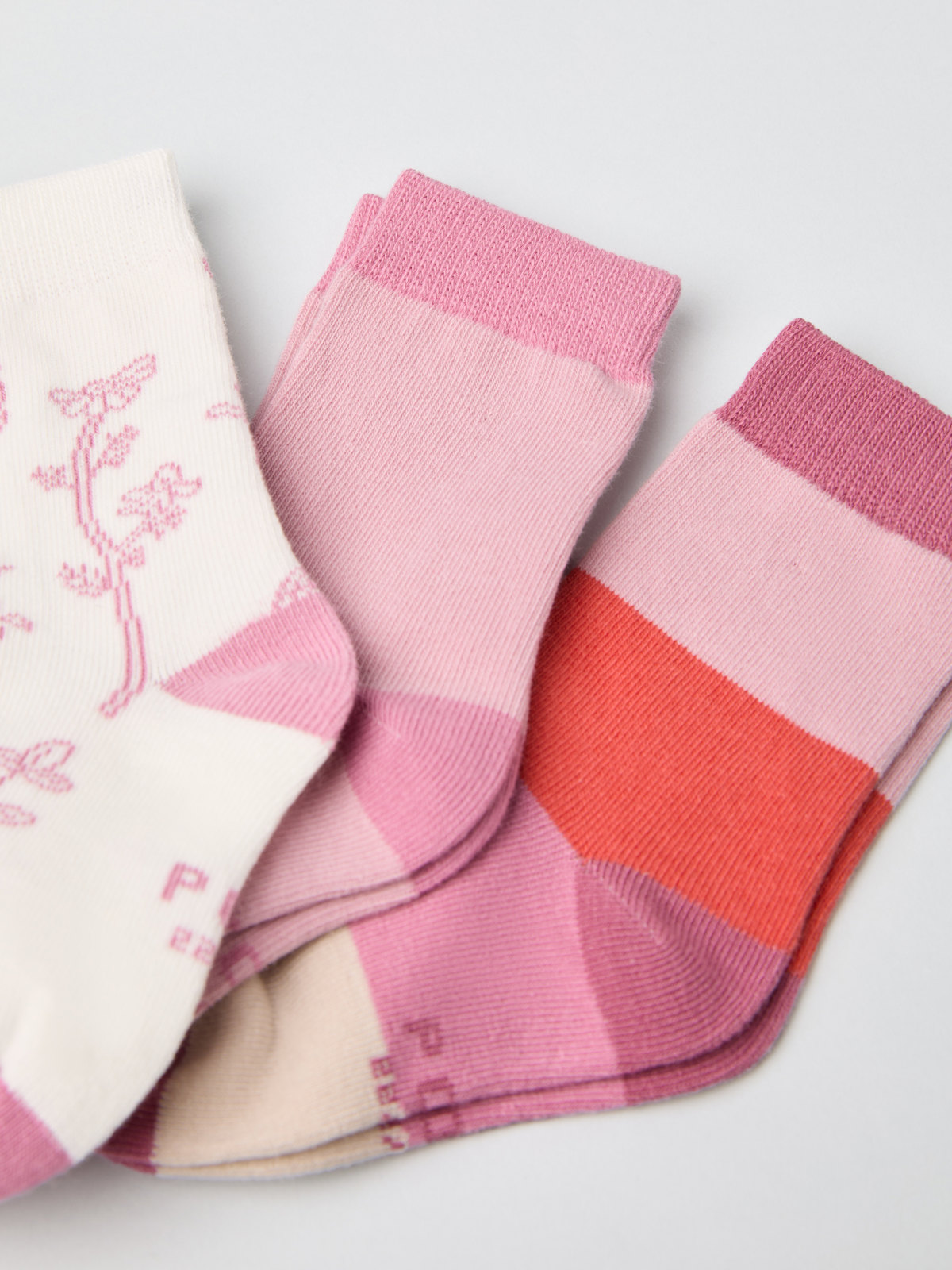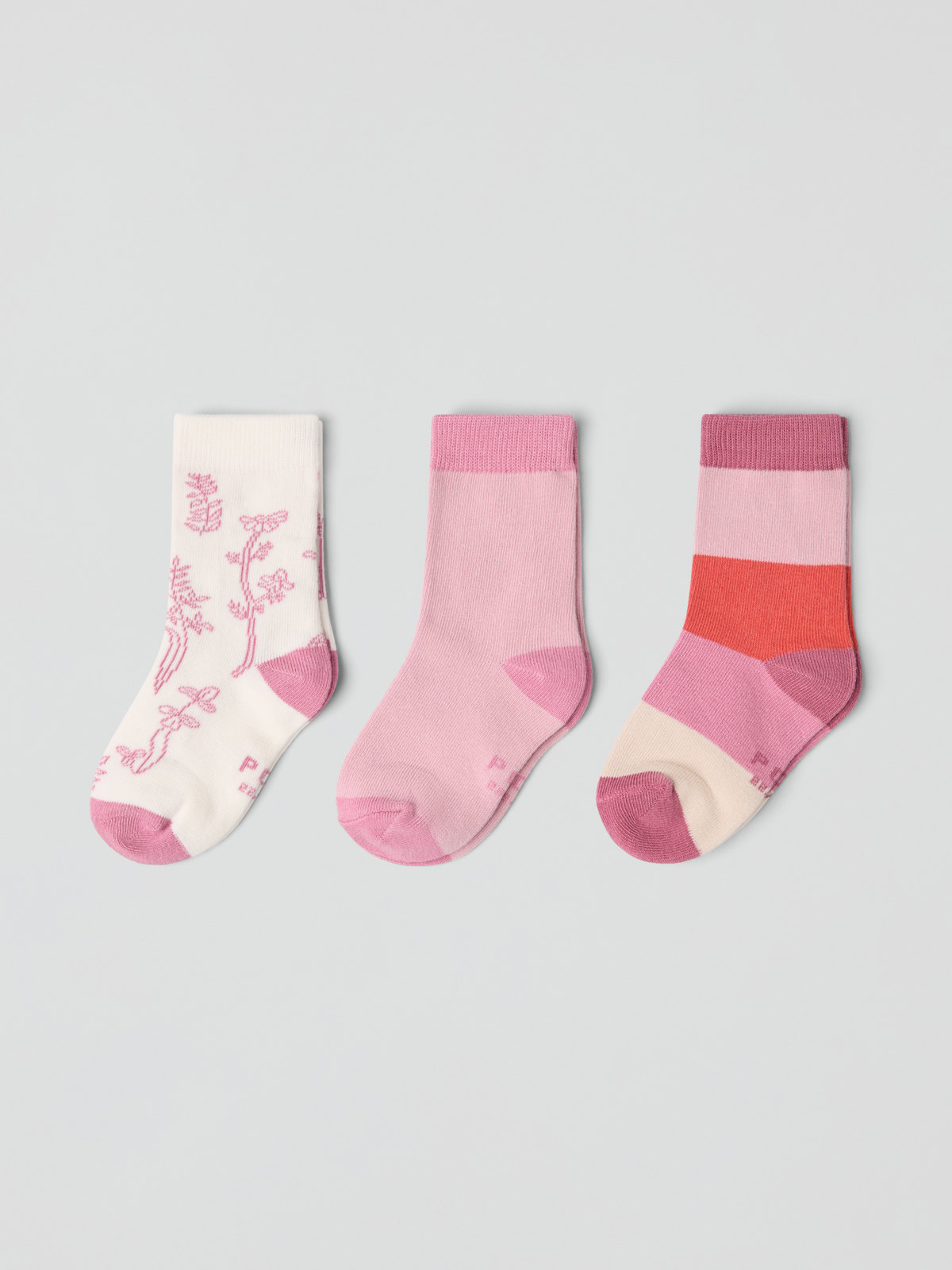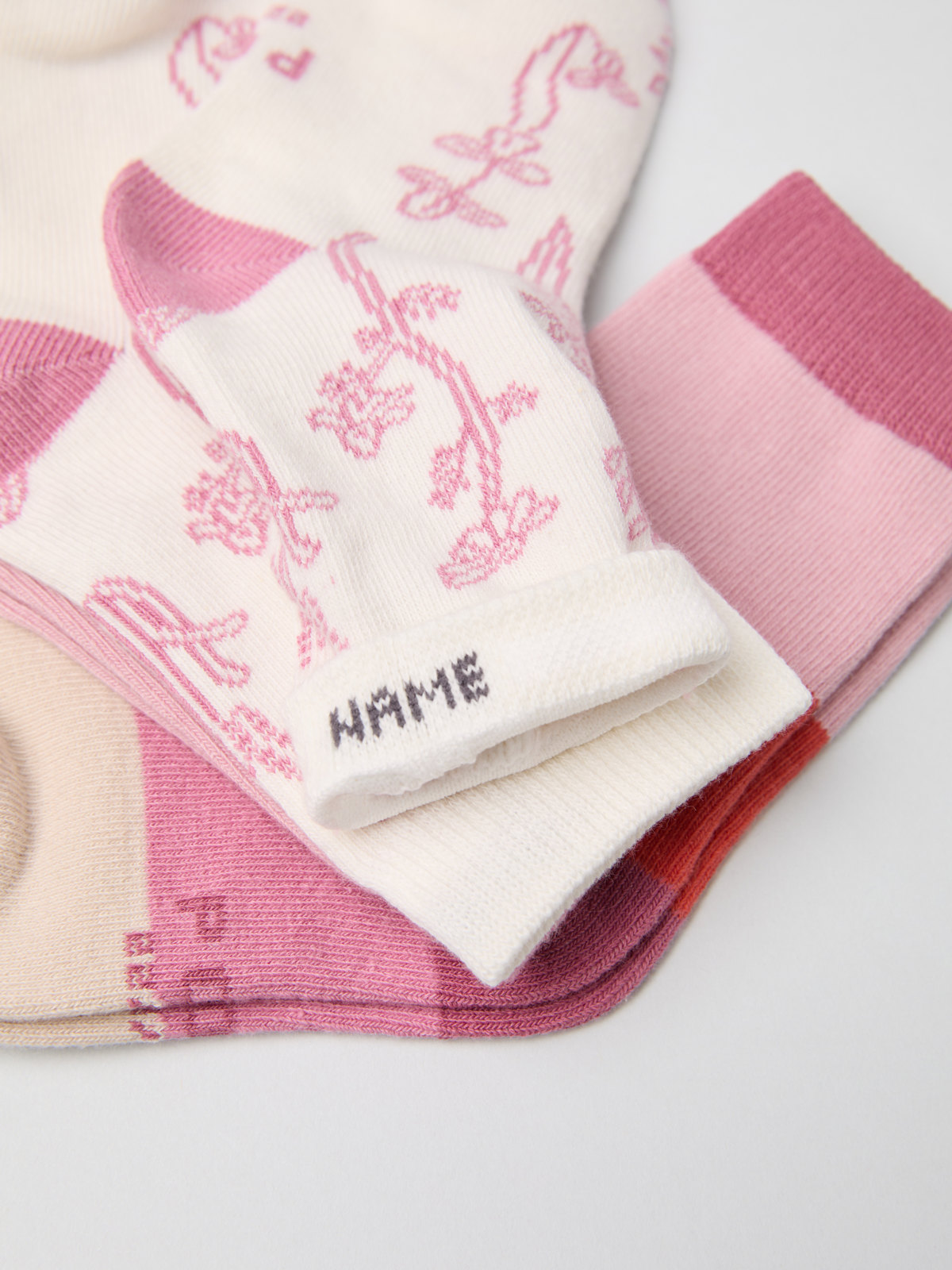 Strumpor i mjuk ekologisk bomull i 3-pack. Varje par har en unik design och matchar snyggt med övriga kollektioner. På insidan av skaftet finns plats att skriva barnets namn – lätt att hålla ordning!