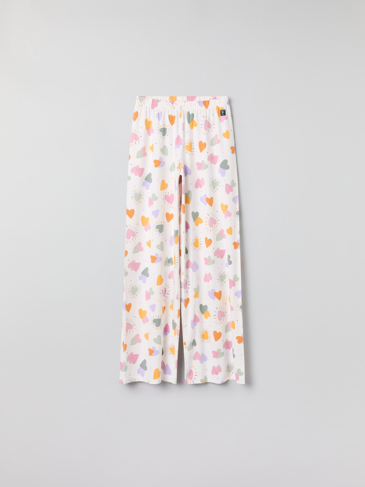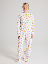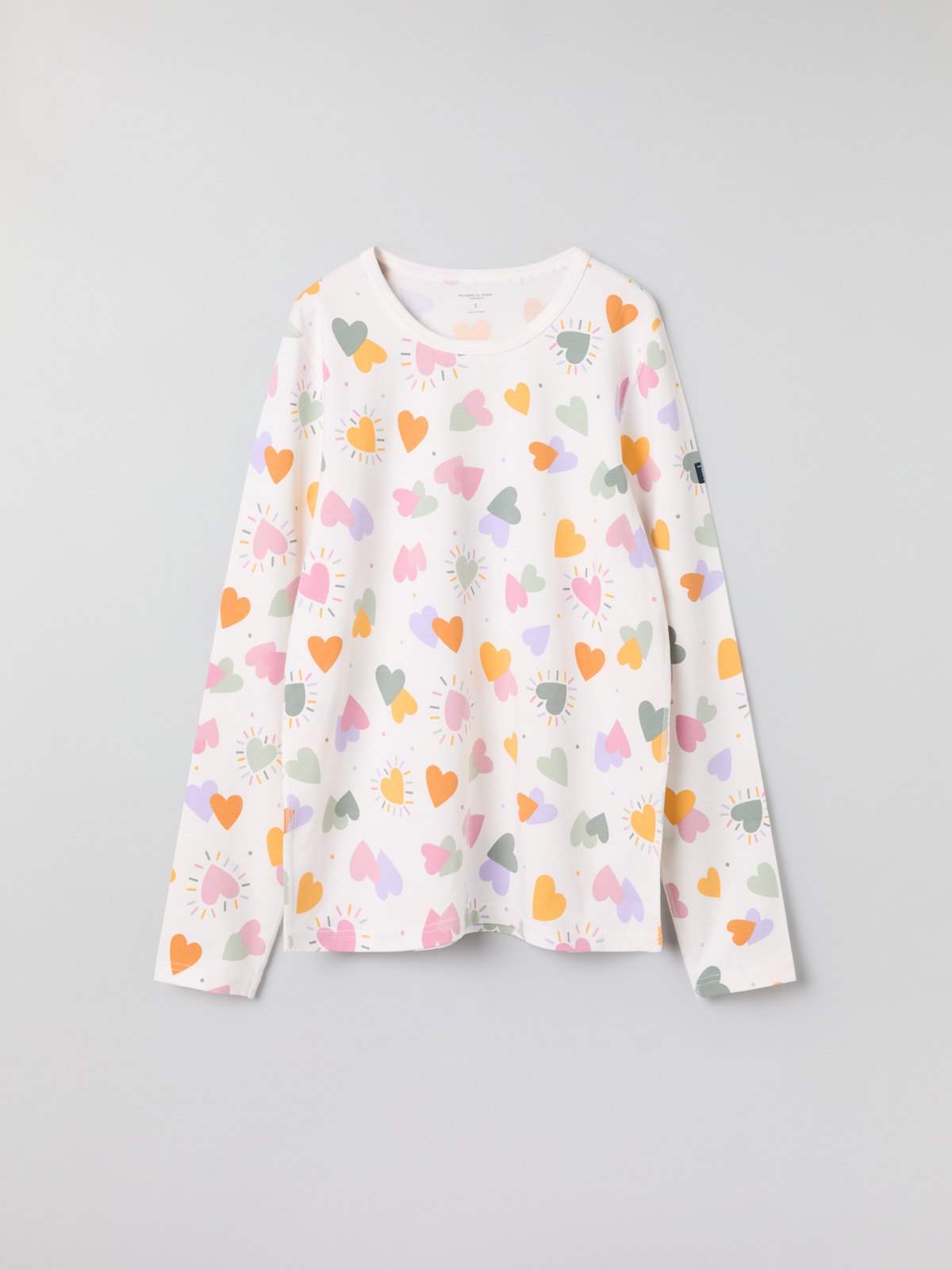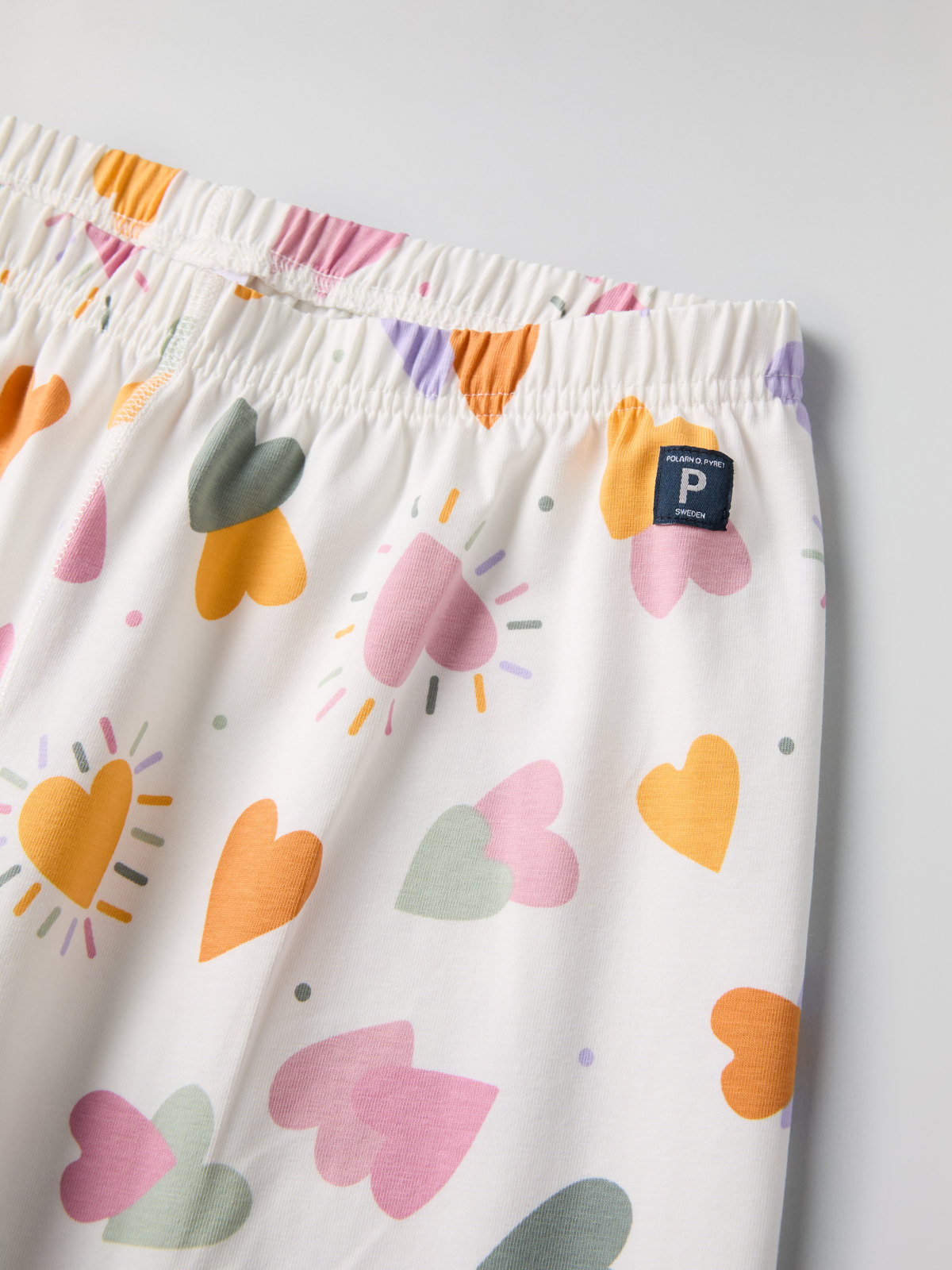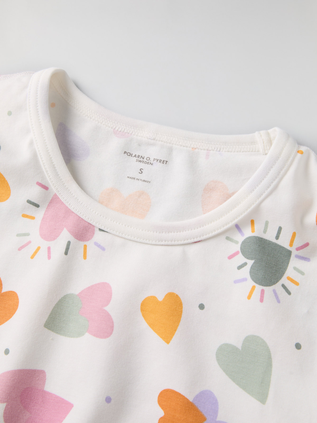 Pyjamasen är helmönstrad med hjärtan och har raka ben. Tröjan har mjuk ribbad mudd kring halsringning och byxan har elastisk midja.