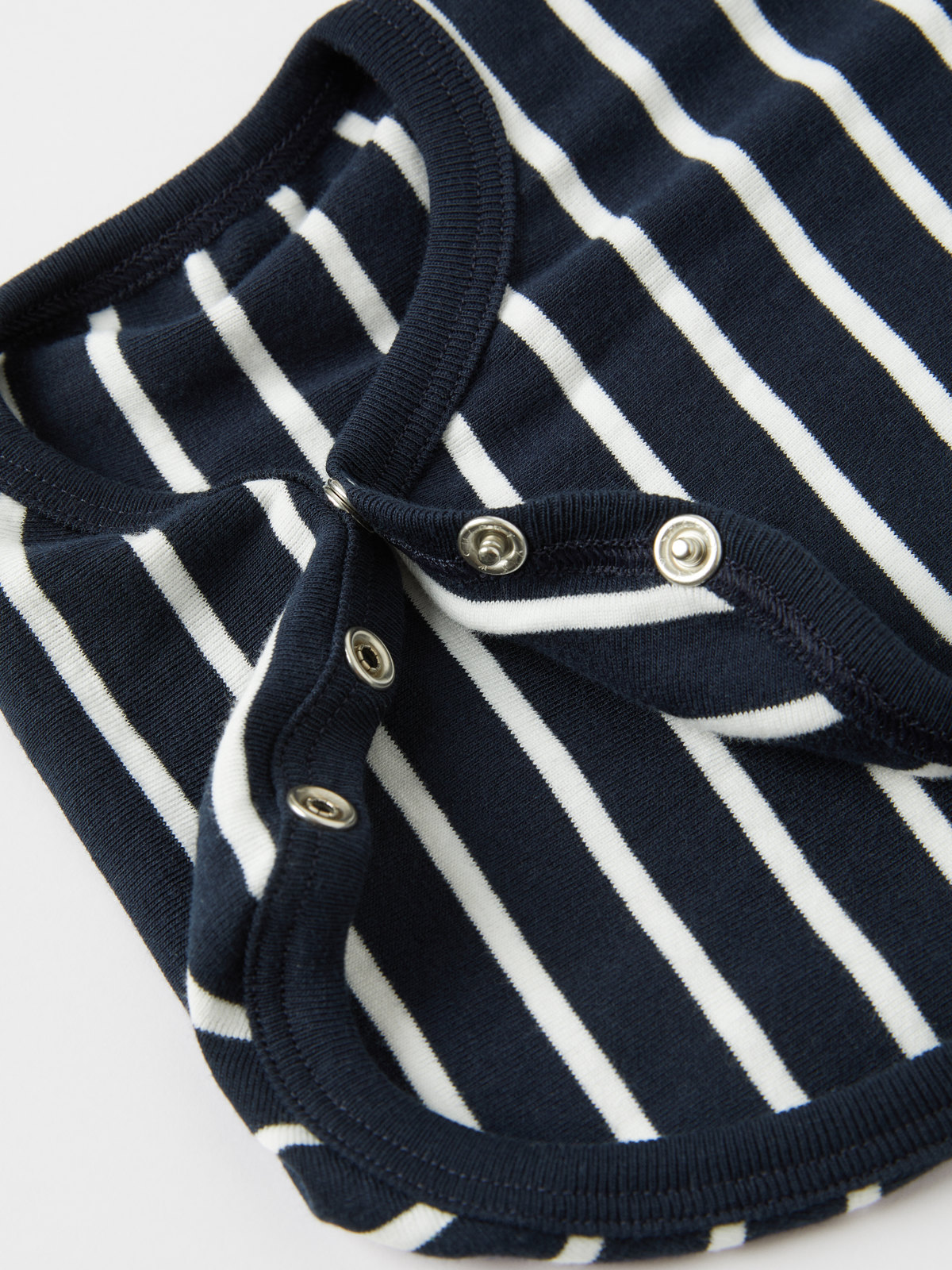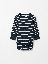 Body för baby, i ekologisk bomull och i Polarn O. Pyret-randen. Tryckknappar på ena axeln och i grenen underlättar påklädning och blöjbyten.