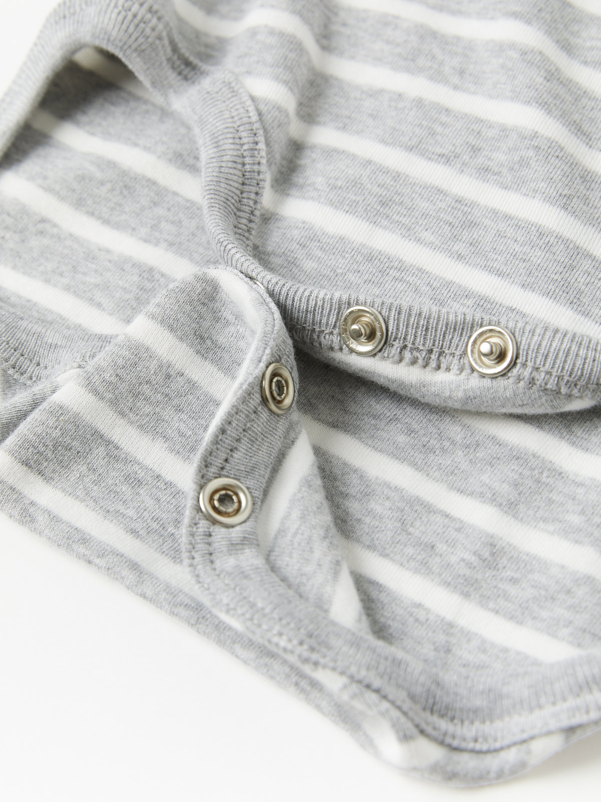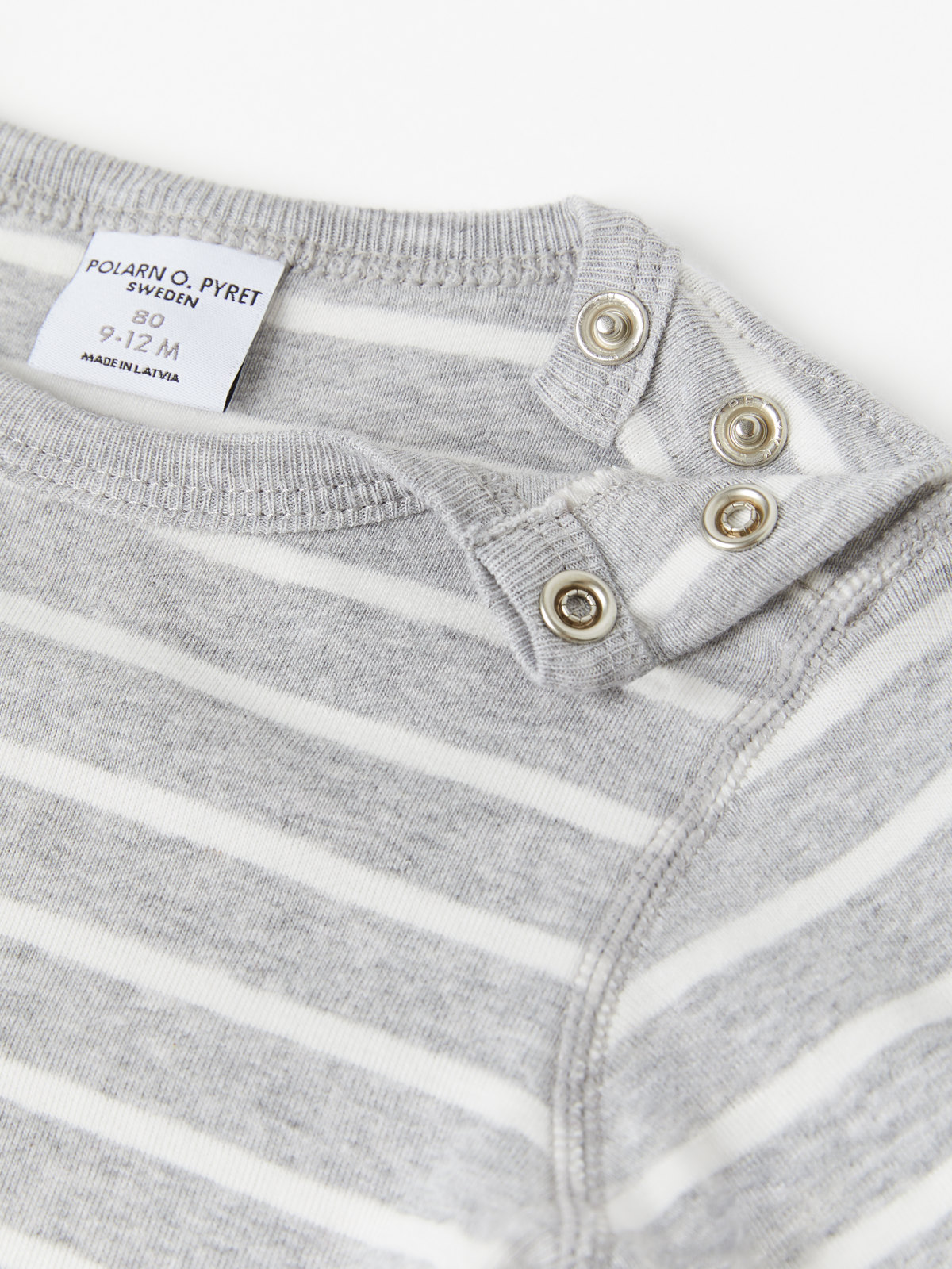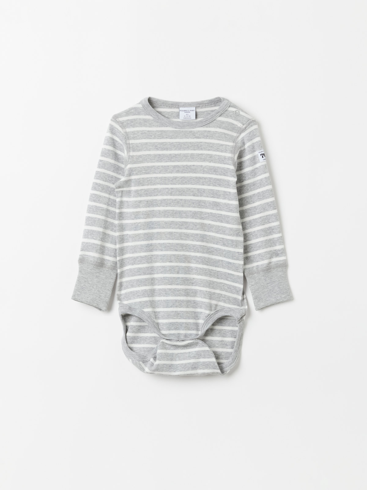 En randig body i 100% ekologisk bomull för baby. Bodyn har vår klassiska rand och mjuka elastiska muddar vid ärmsluten. Tryckknapparna på ena axeln och i grenen underlättar klädbyten.