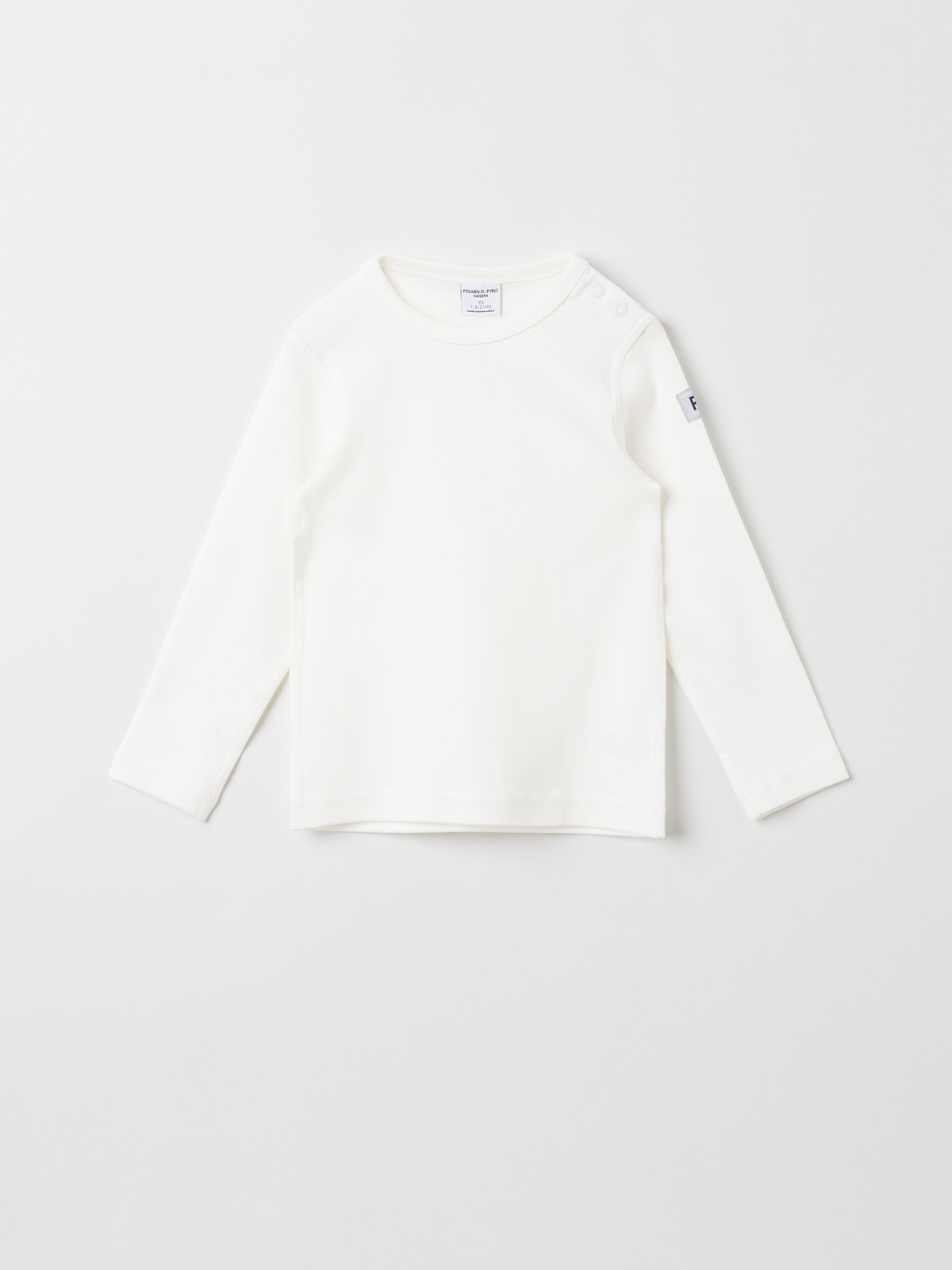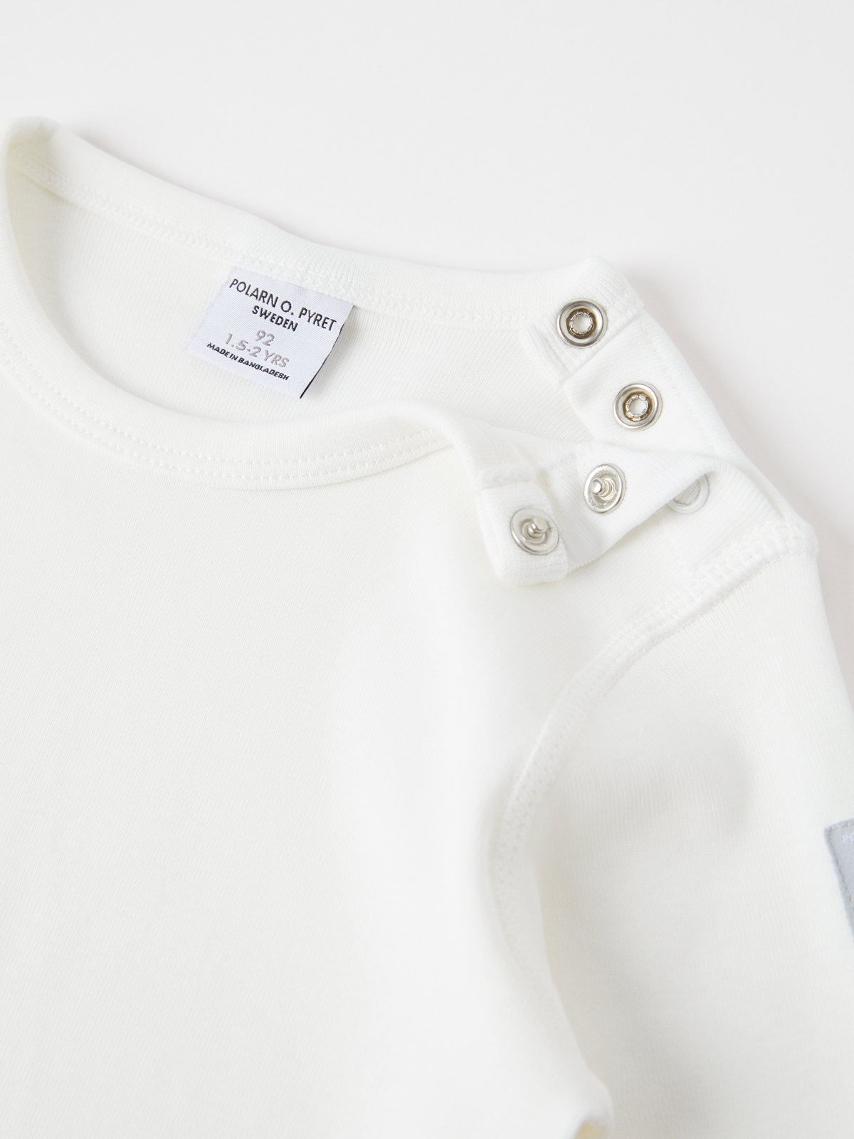 En enfärgad tröja i 100% ekologisk bomull. Tröjan har mjuk elastisk mudd kring halsringningen och vid ärmsluten. Storlekarna 74-92 har trytckknappar på ena axeln för att underlätta klädbyten.