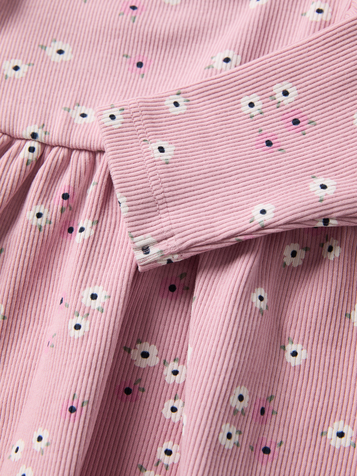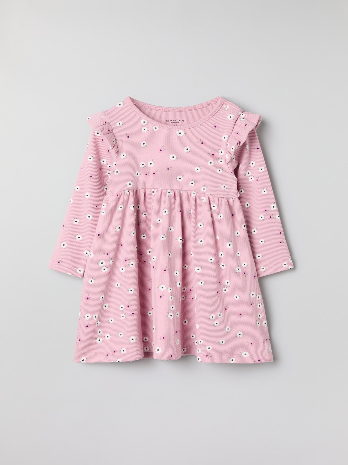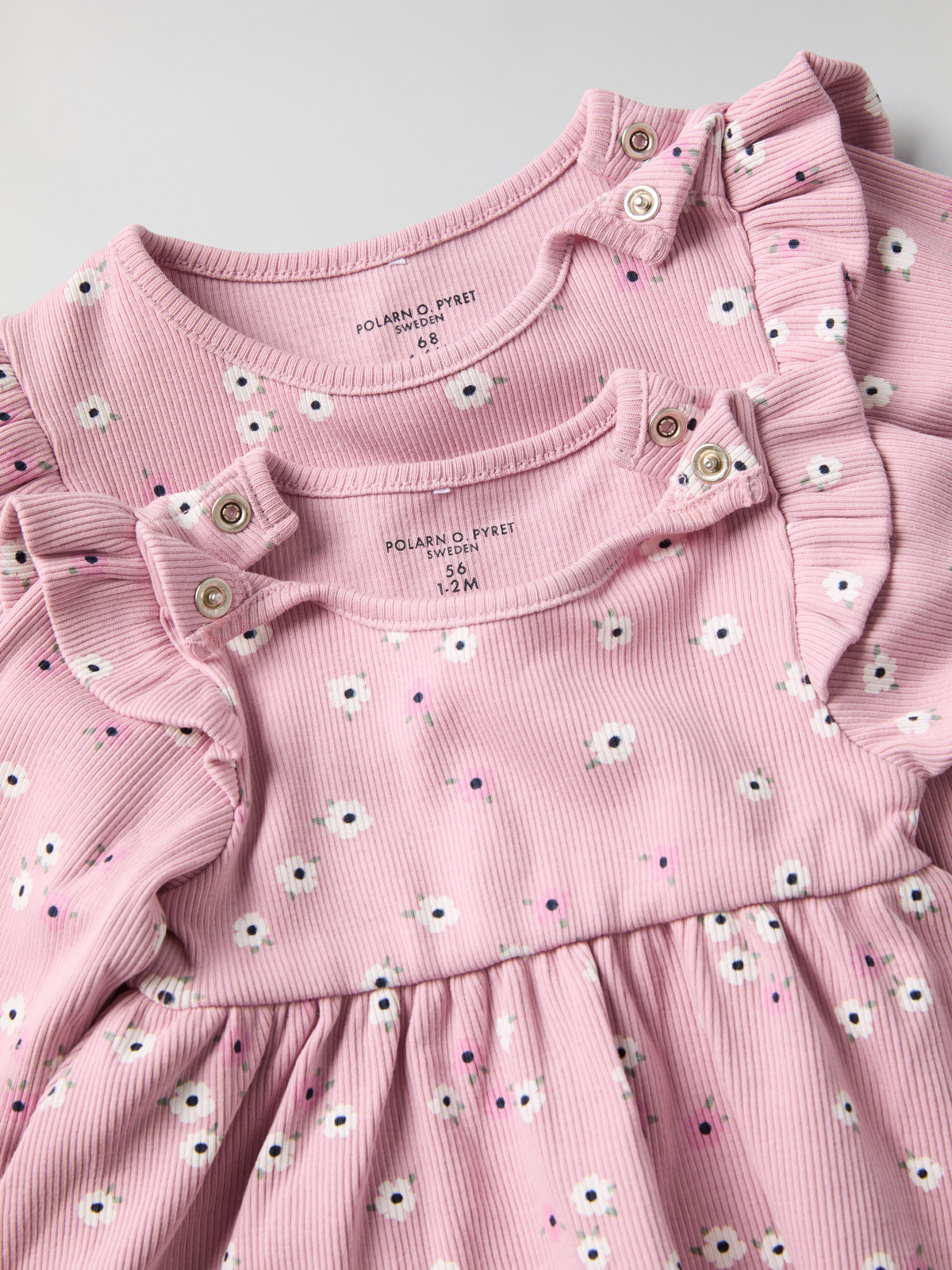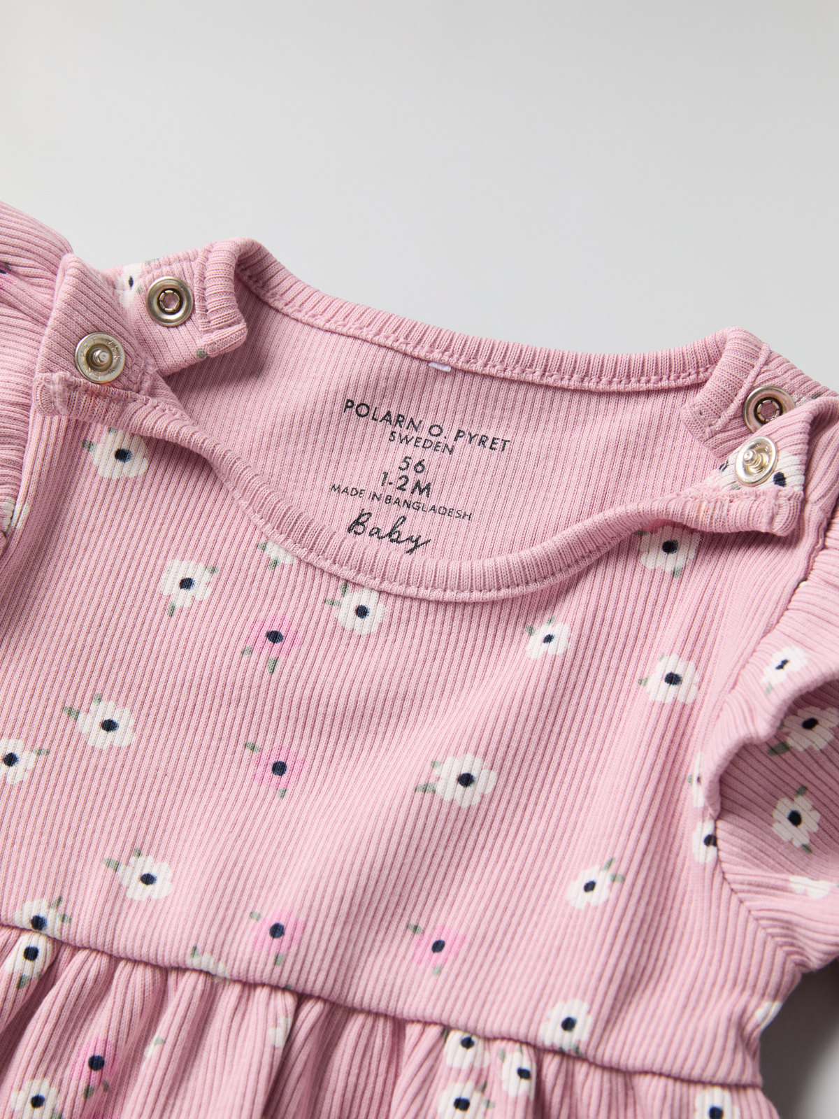 Ribbad klänning i ekologisk bomull med små volanger över axlarna – perfekt till både vardag och fest!