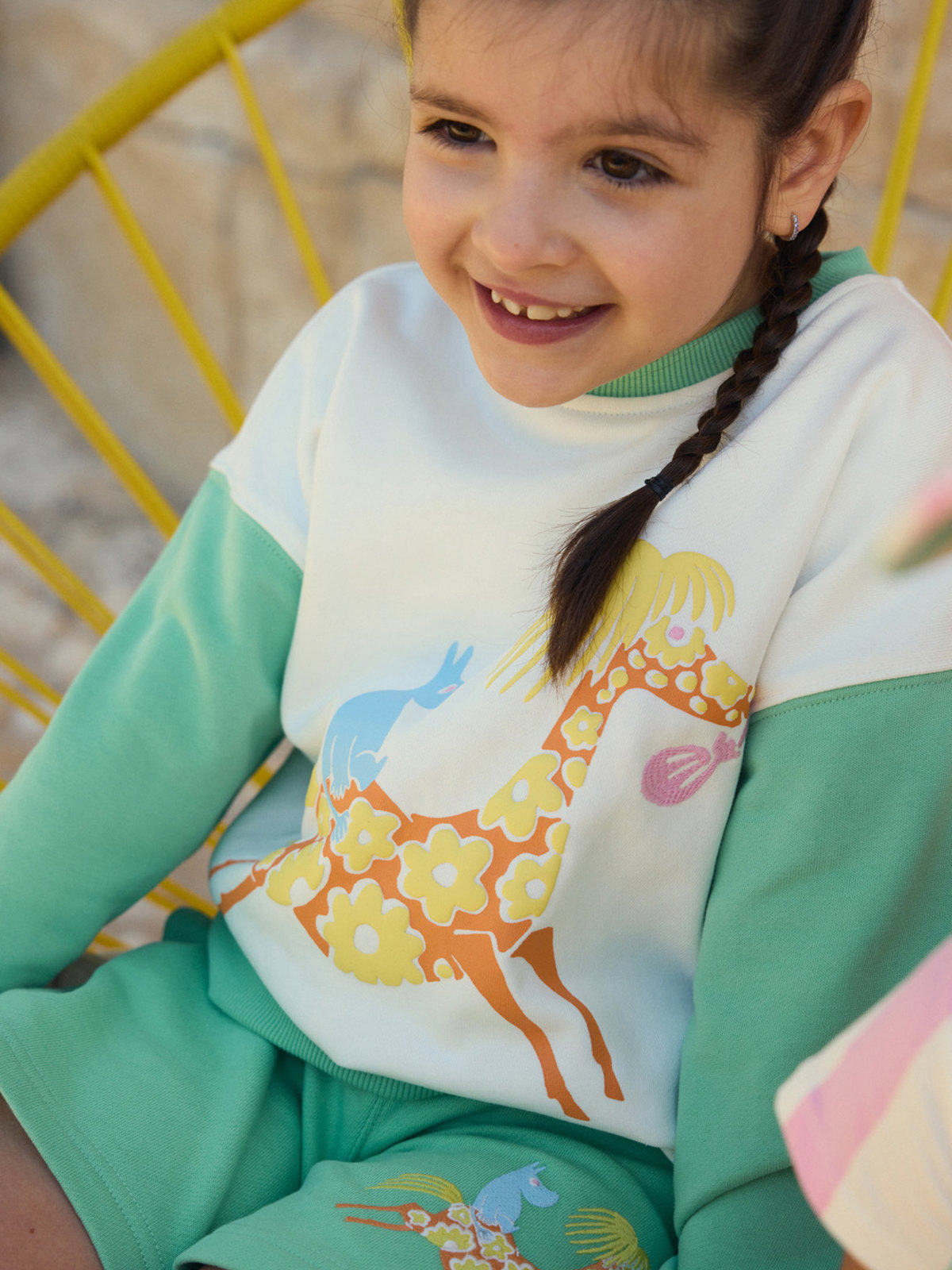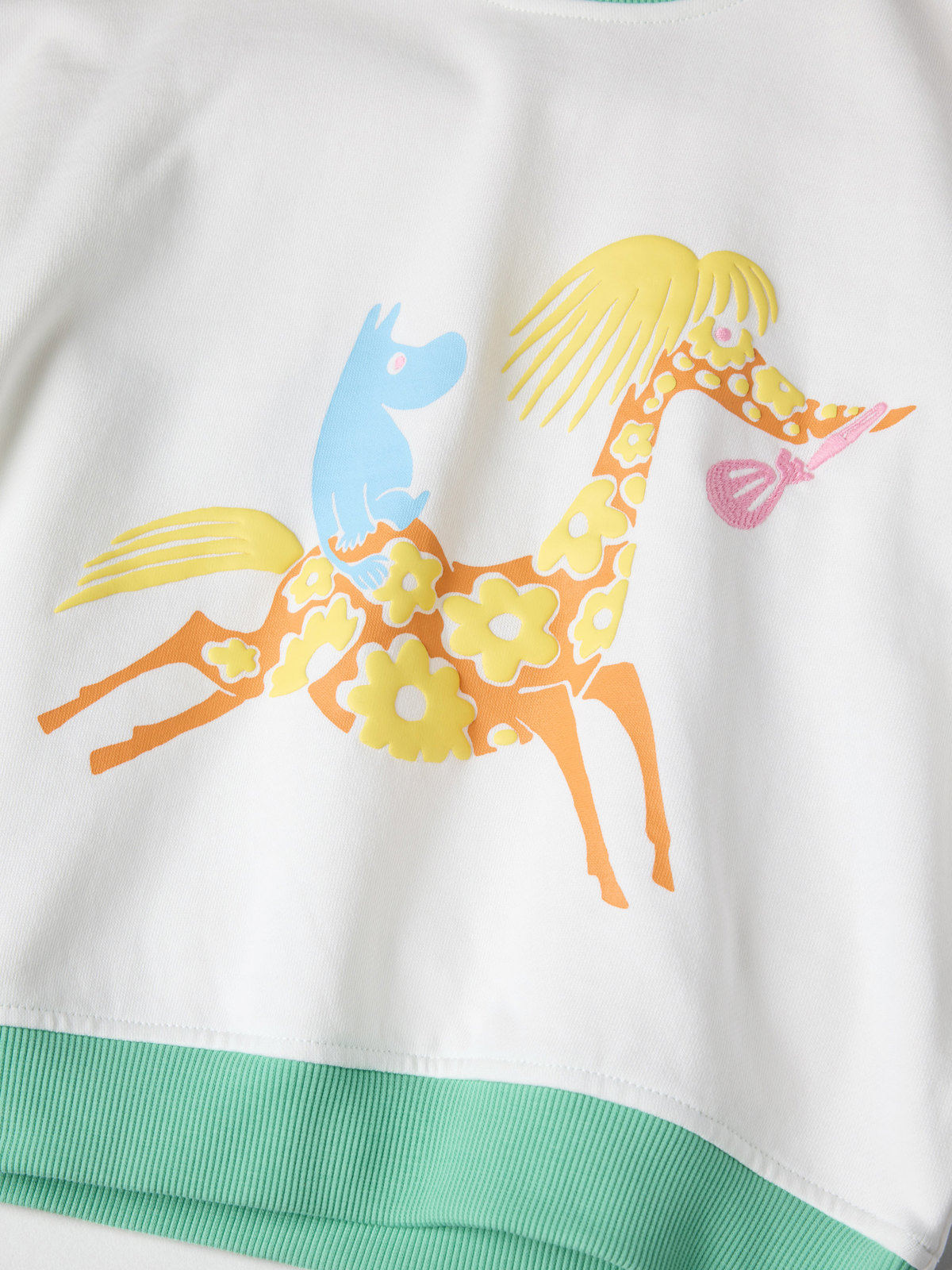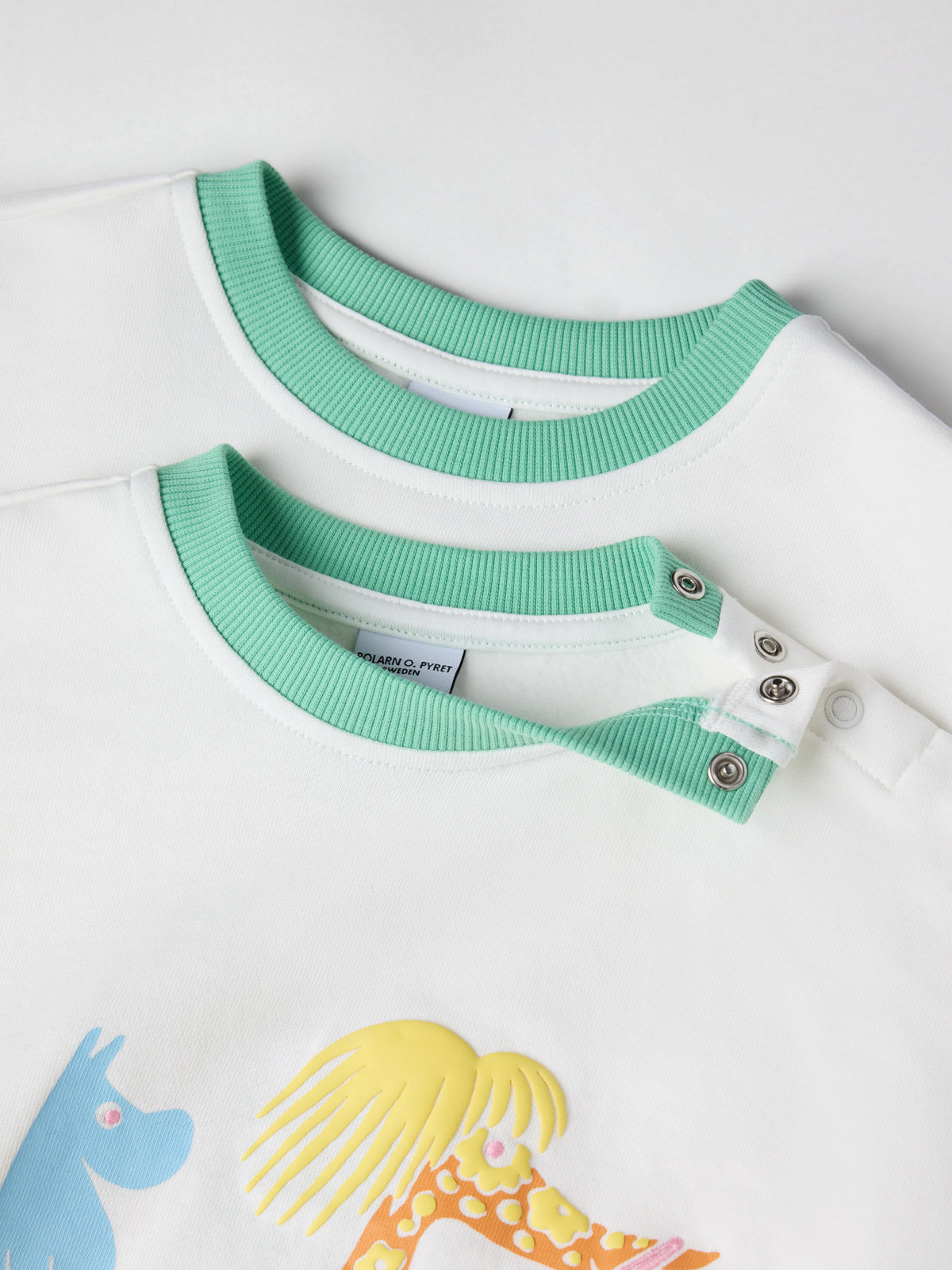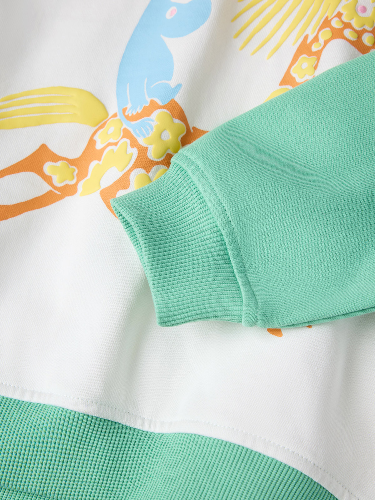 Blockfärgad sweatshirt i 100 % ekologisk bomull med illustrationer från Tove Janssons berättelser om mumintrollen. Plagget är en del av vår limiterade kollektion för att fira Mumins 80-årsjubileum. Exklusivt för jubileumsåret 2025 är att mumintrollen återigen får synas i färg – för första gången sedan 1956.