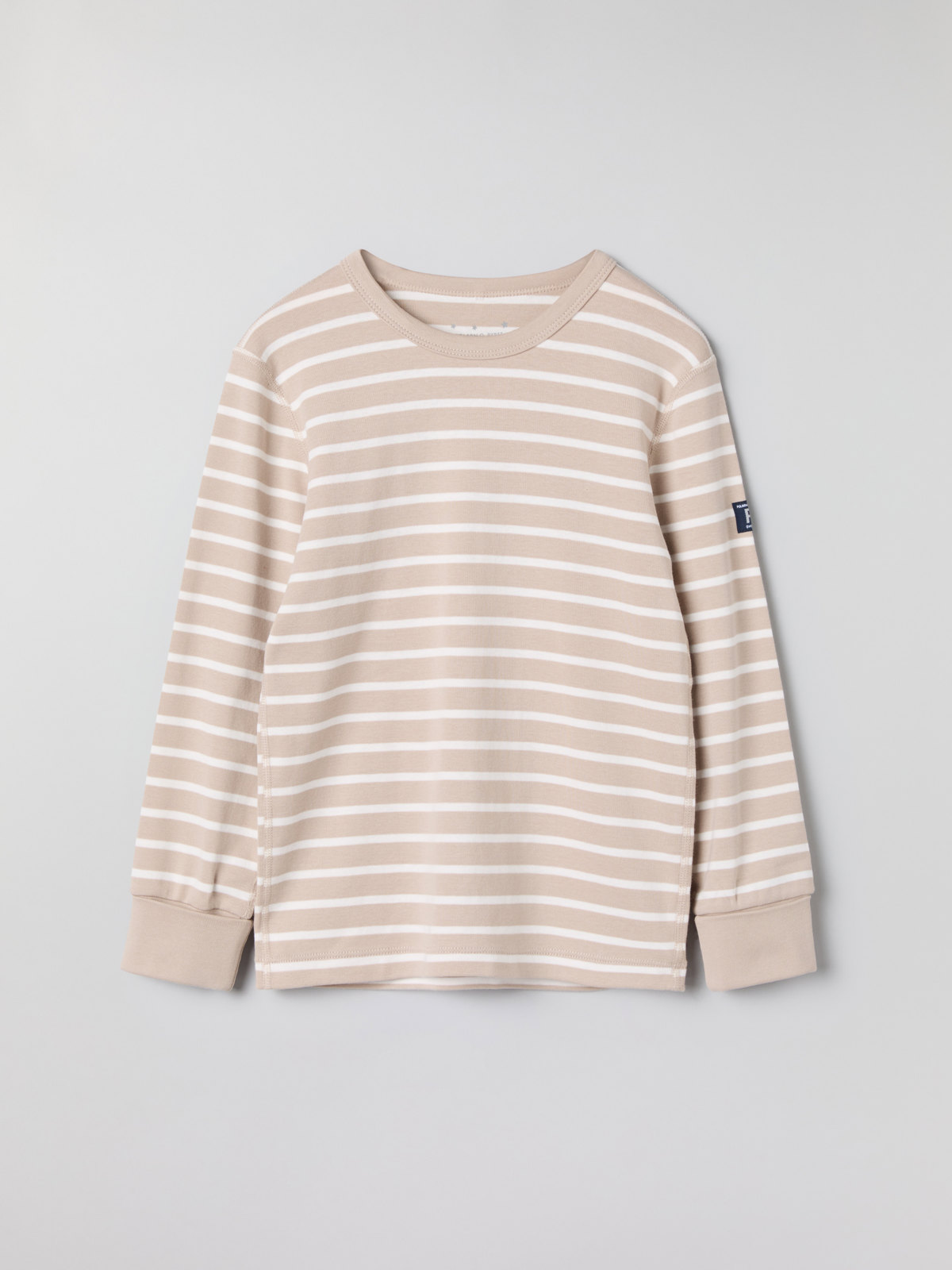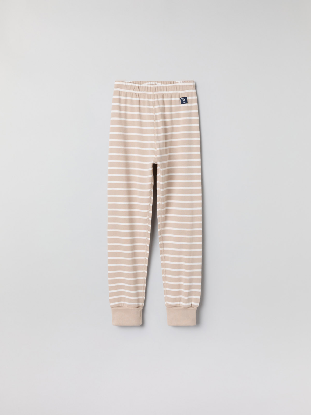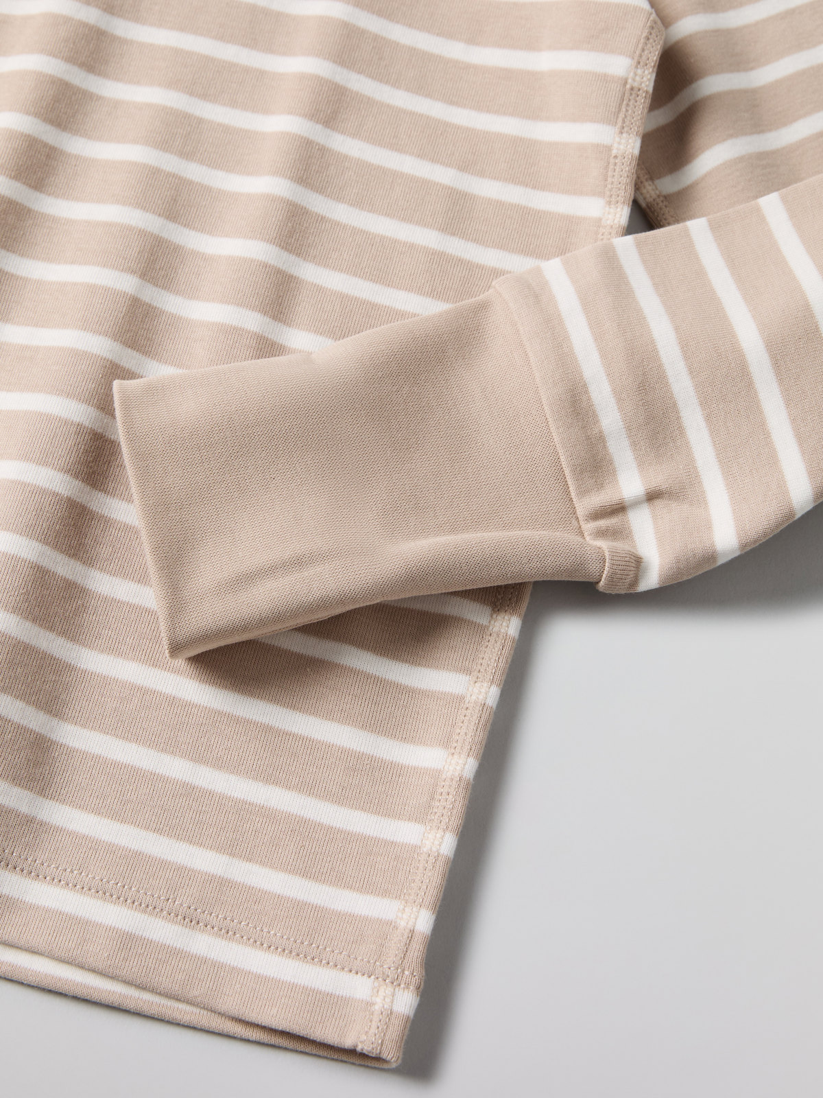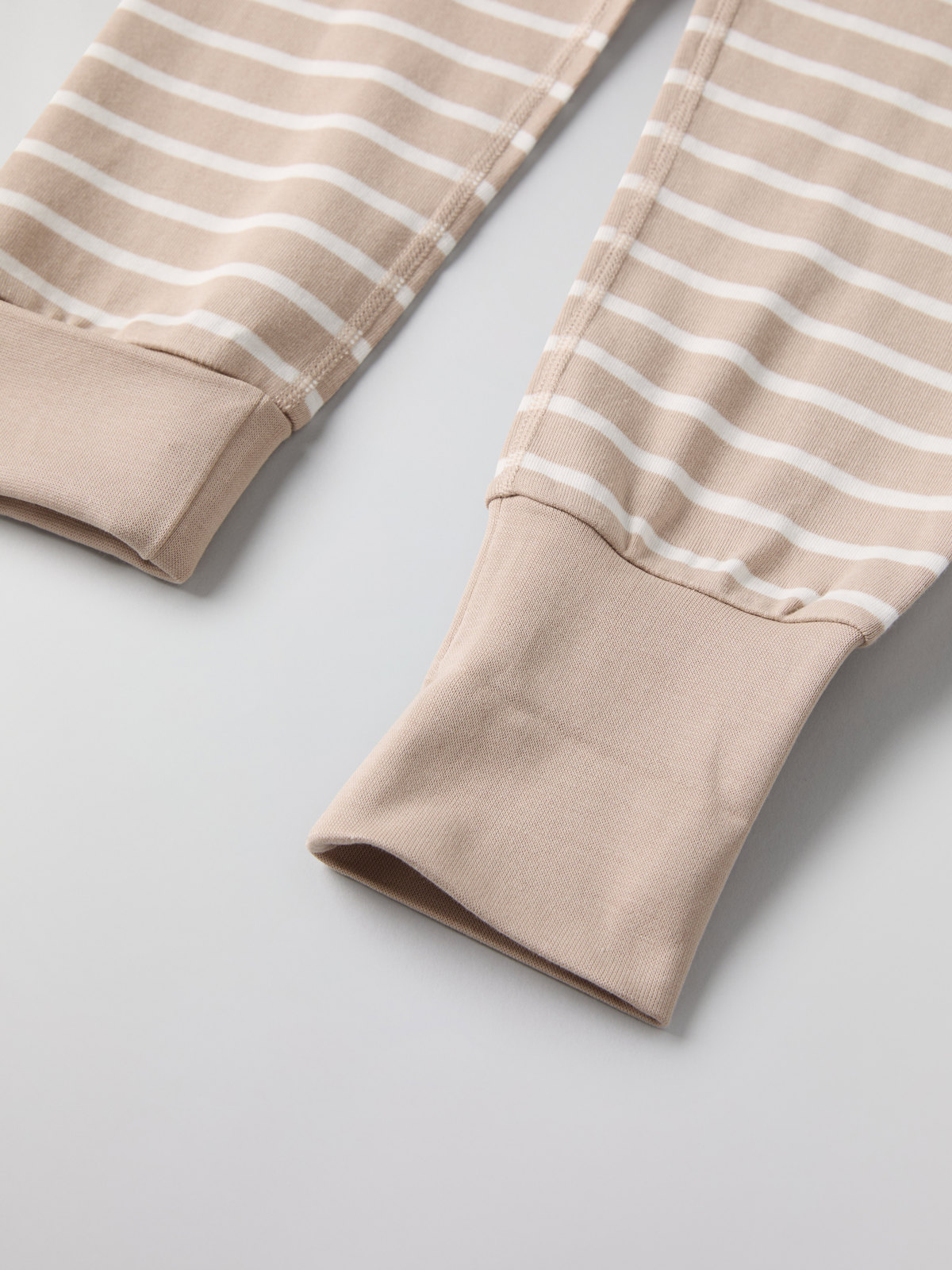 Tvådelad pyjamas i mjuk, ekologisk bomull med vår klassiska rand. Tröjan har extra lång mudd vid ärmslut som går att vika upp eller ned. Byxan har elastisk midja och extra lång mudd vid benslut.