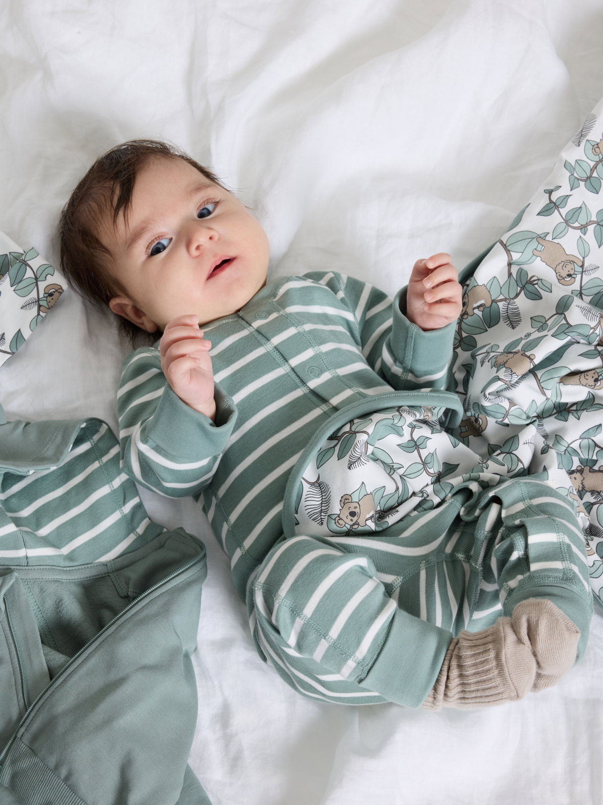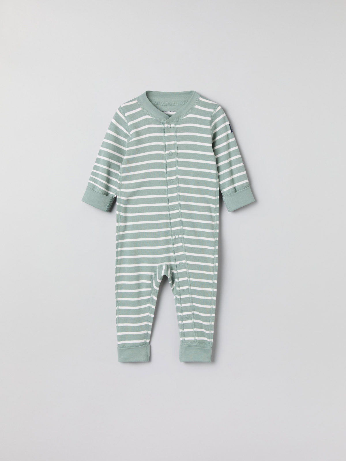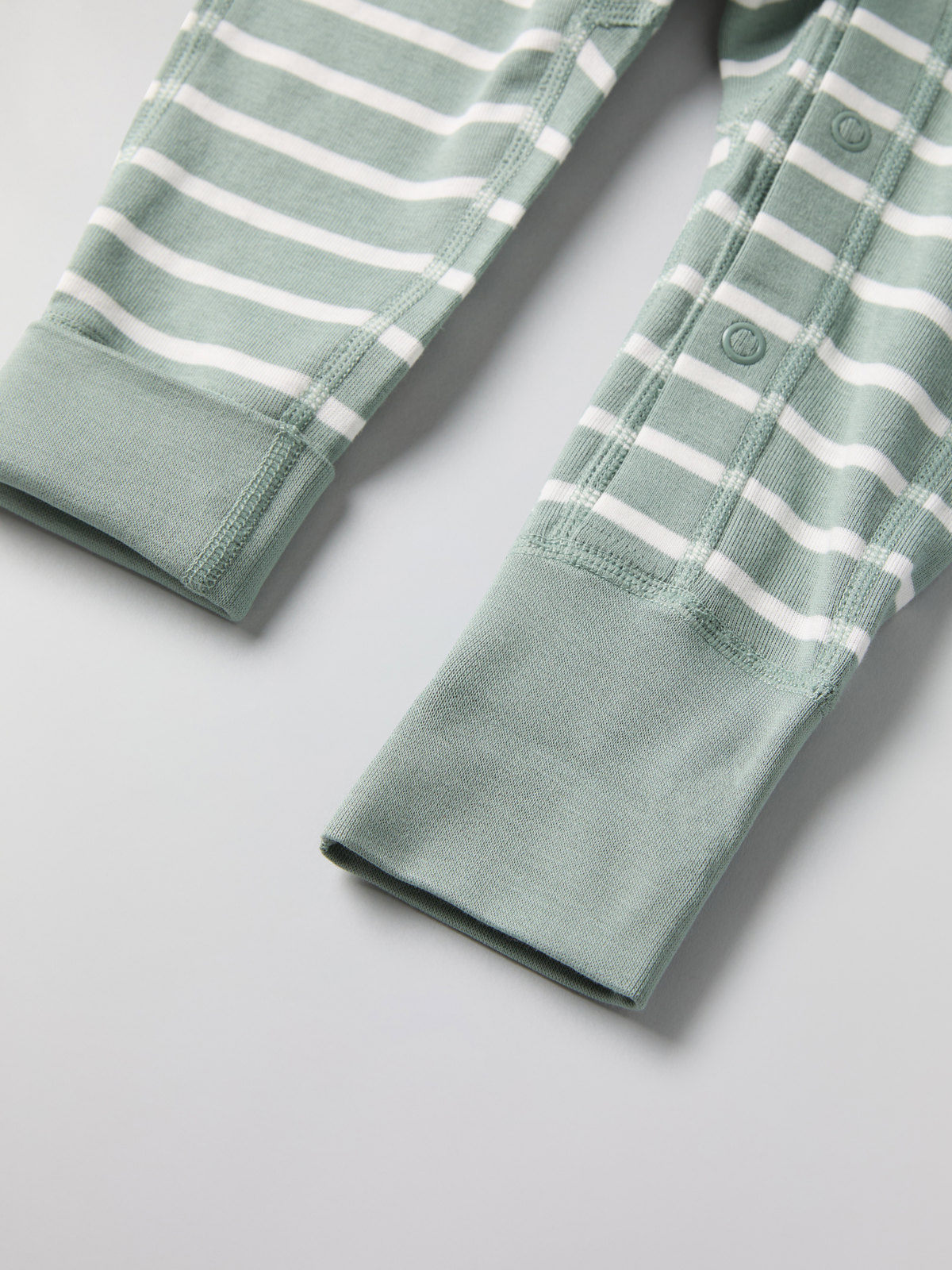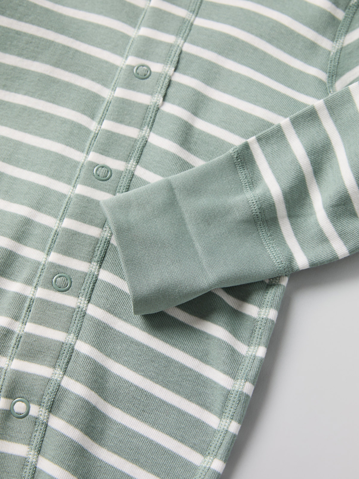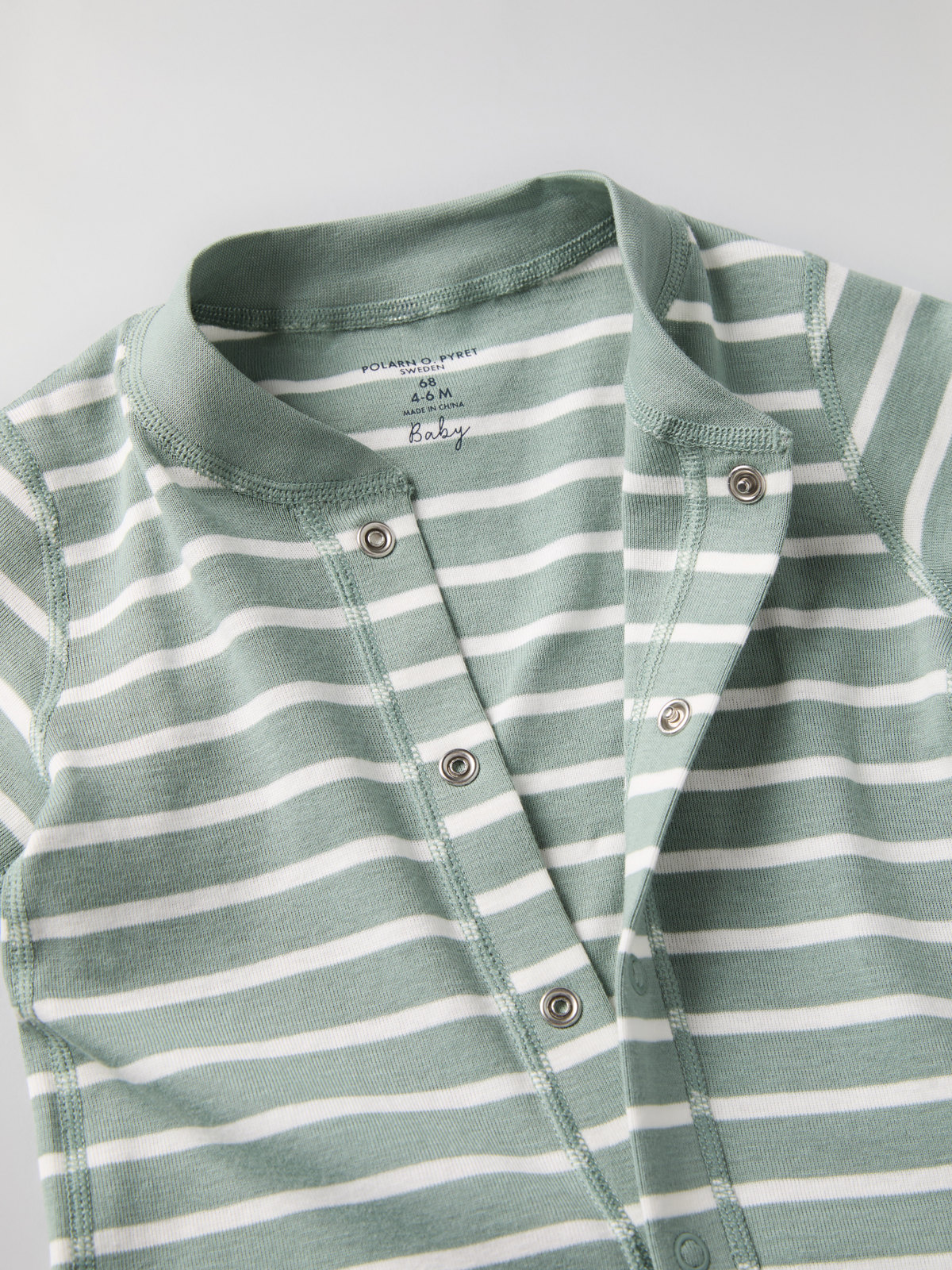 Muddarna vid ärm- och bensluten är extra långa, och går att vika ned allt eftersom barnet växer. Tryckknapparna från hals till benslut förenklar klädbyten.