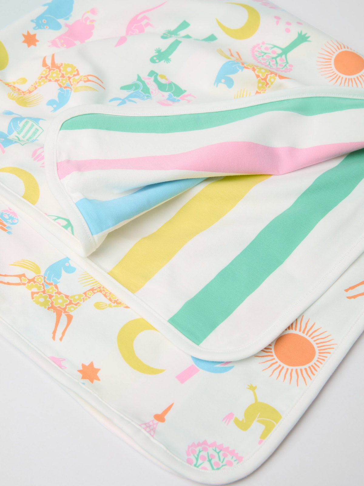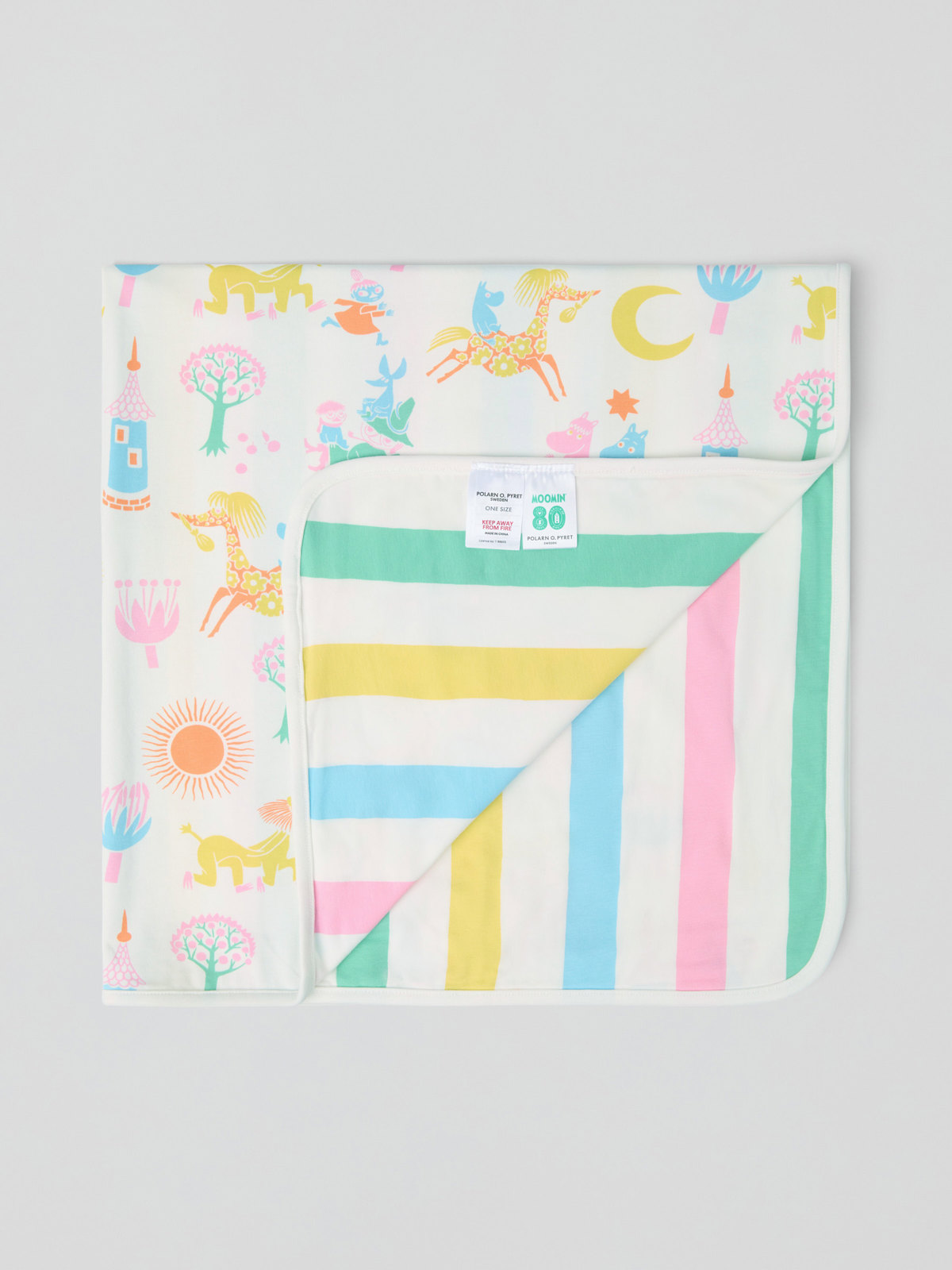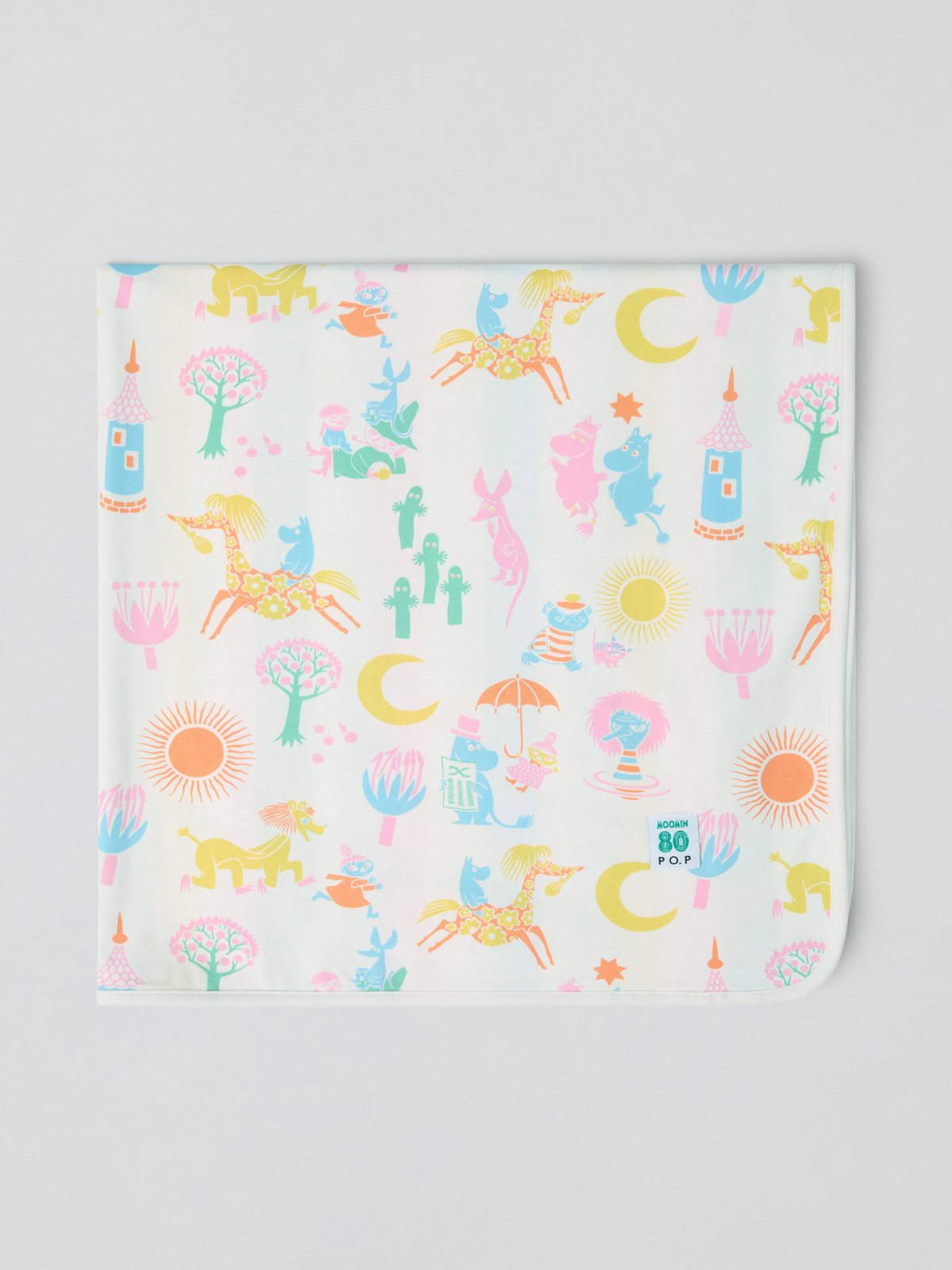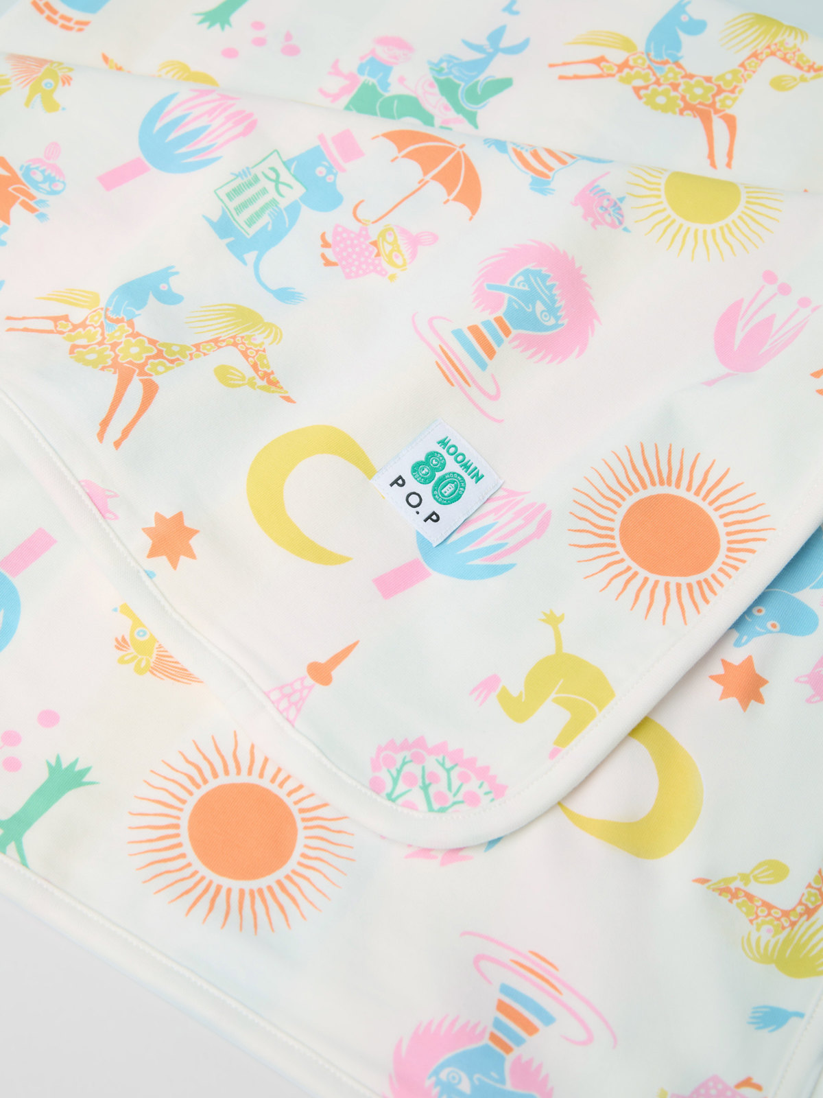 Mjuk och skön babyfilt i ekologisk bomull med illustrationer från Tove Janssons berättelser om mumintrollen. Perfekt att ha i vagnen eller hemma.